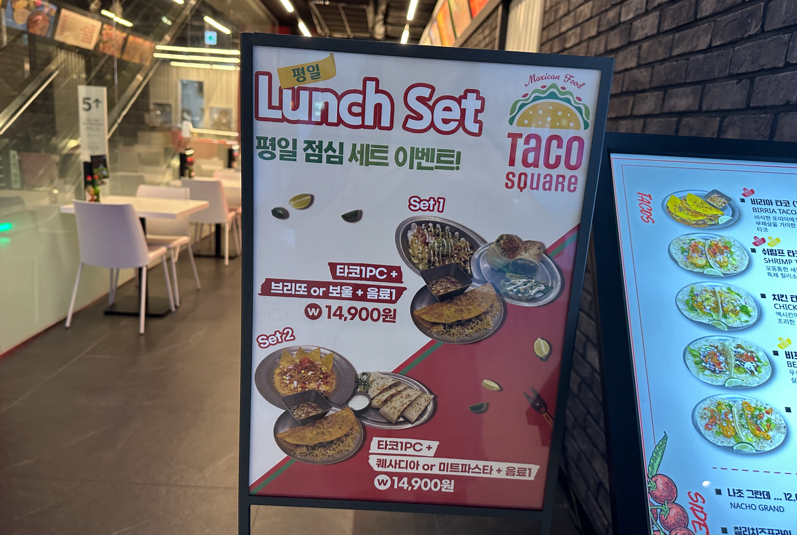 타코스퀘어에는 평일 전용 런치 세트 메뉴가 있다. 두 가지다. 세트1은 타코+브리또 또는 보울+음료 한 잔, 세트2는 타코+퀘사디아 또는 미트파스타+음료 한 잔이다. 음료는 탄산(콜라, 사이다)이다.