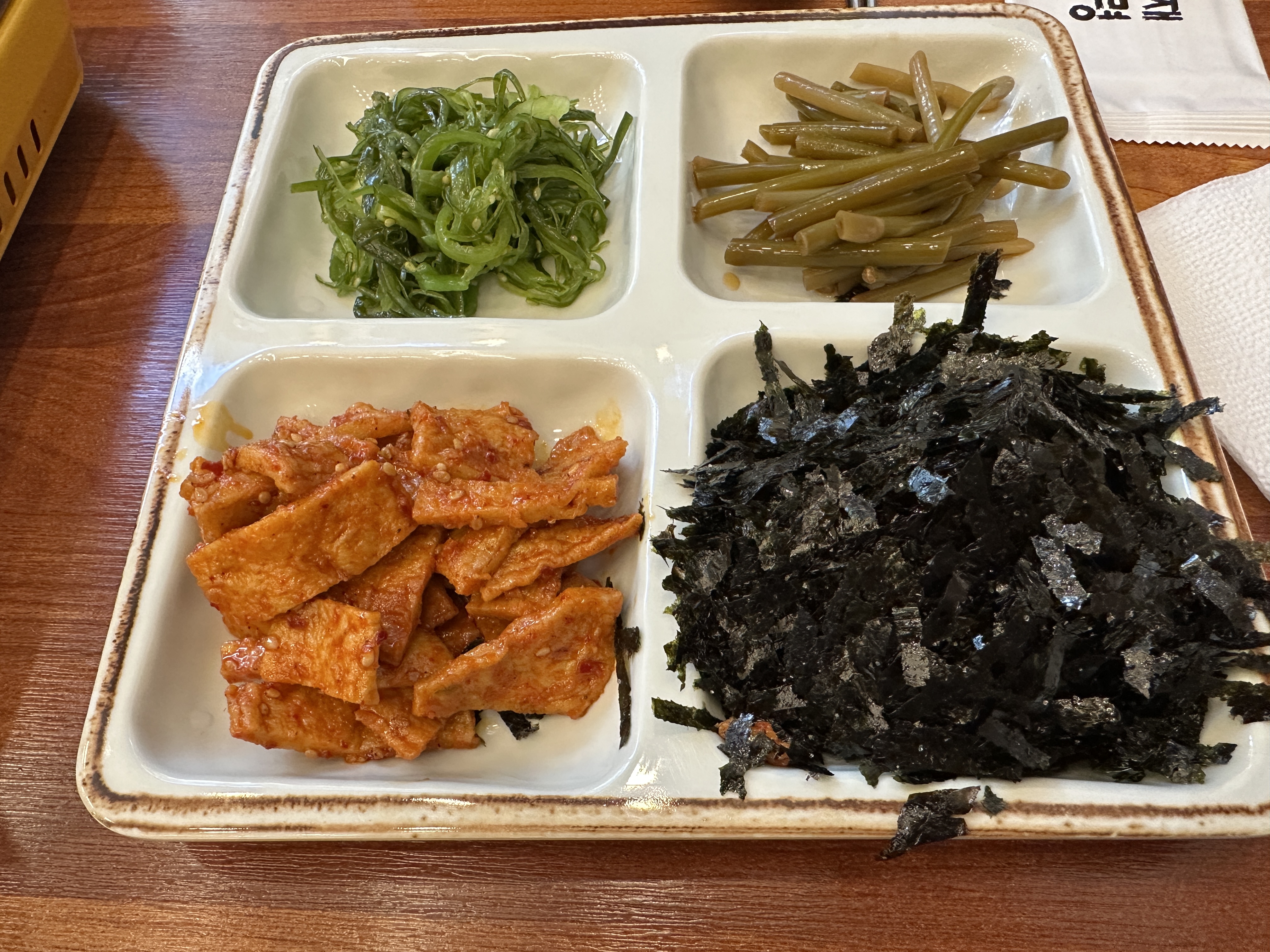 반찬은 셀프바에서 가져다먹을 수 있다. 빨간어묵볶음, 미역줄기무침, 마늘쫑장아지 그리고 김가루.