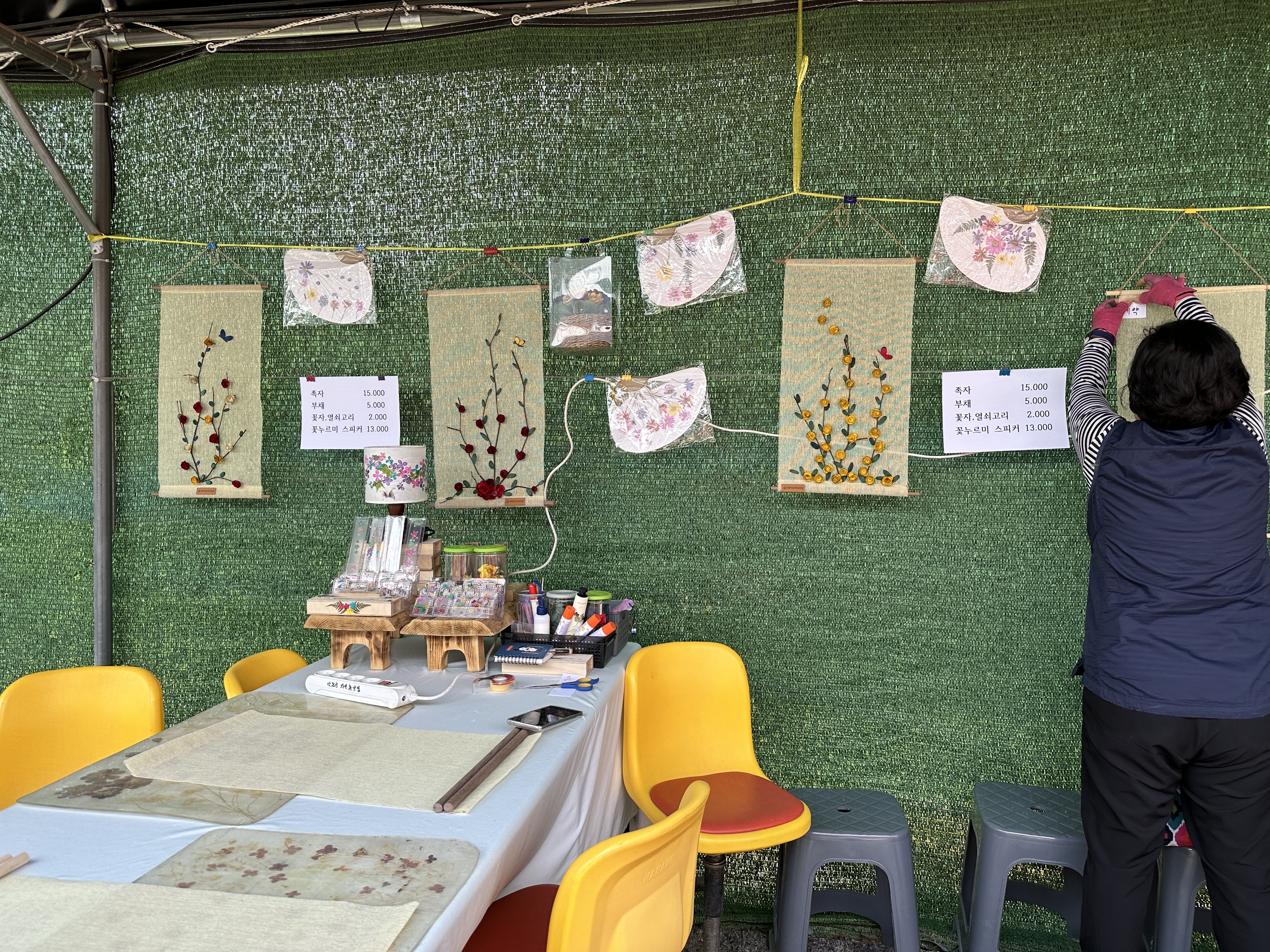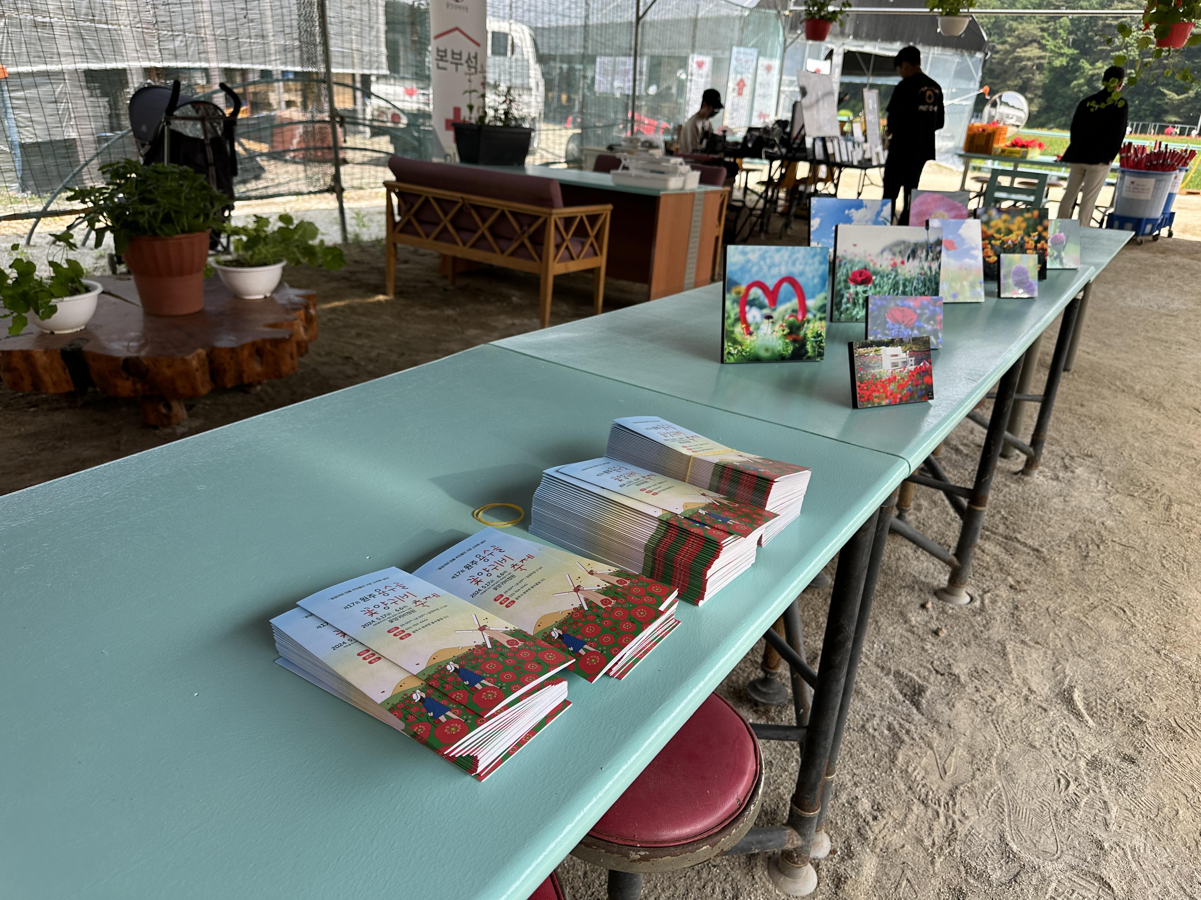 체험부스에는 티셔츠에 그려진 양귀비 그림에 직접 색칠을 해 가져가기, 족자와 부채, 열쇠고리에 양귀비 장식 달아보기, 에코백 만들기 등이 있었습니다.