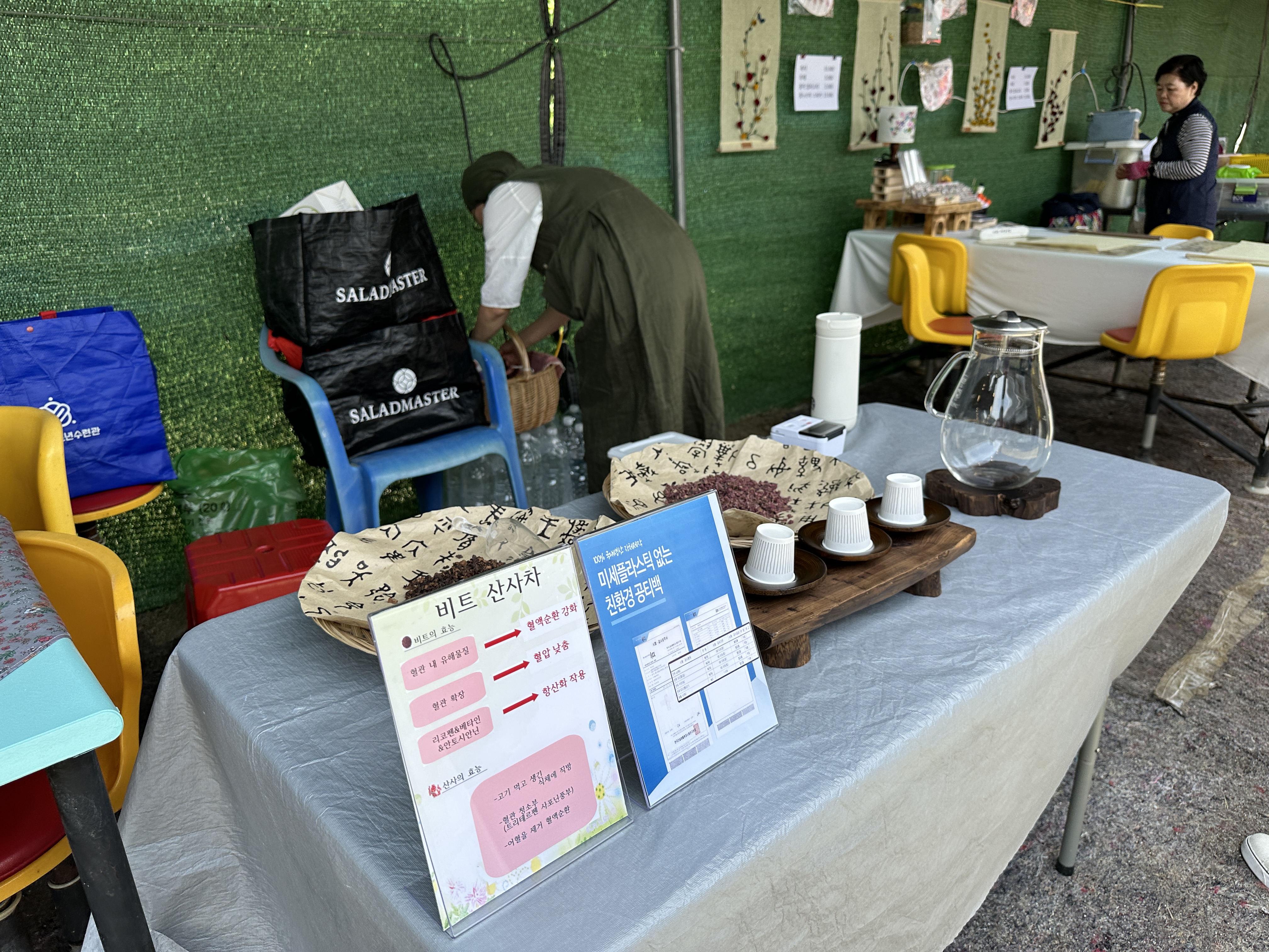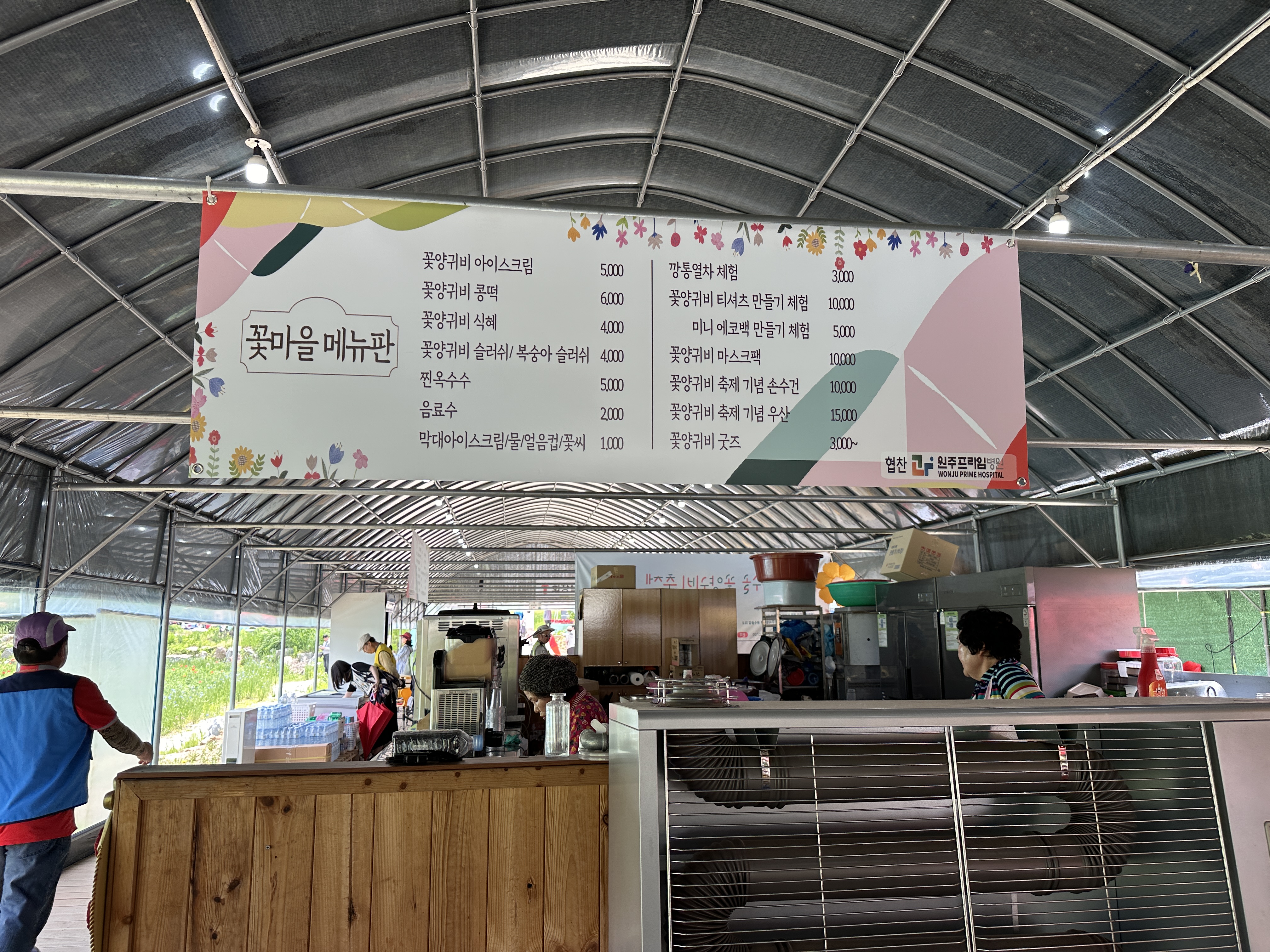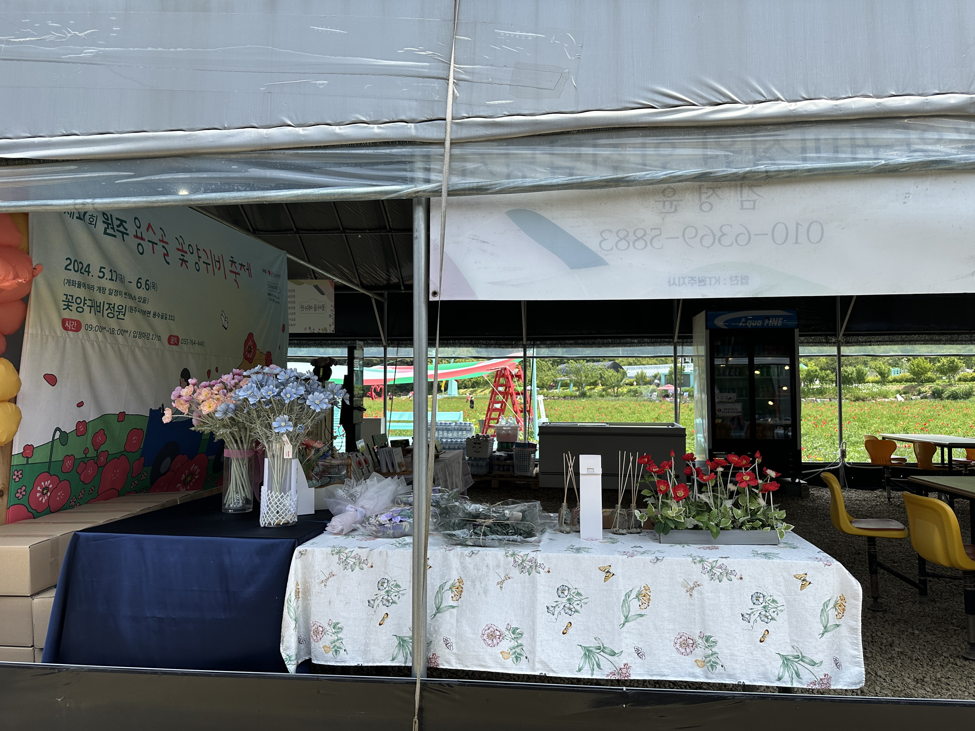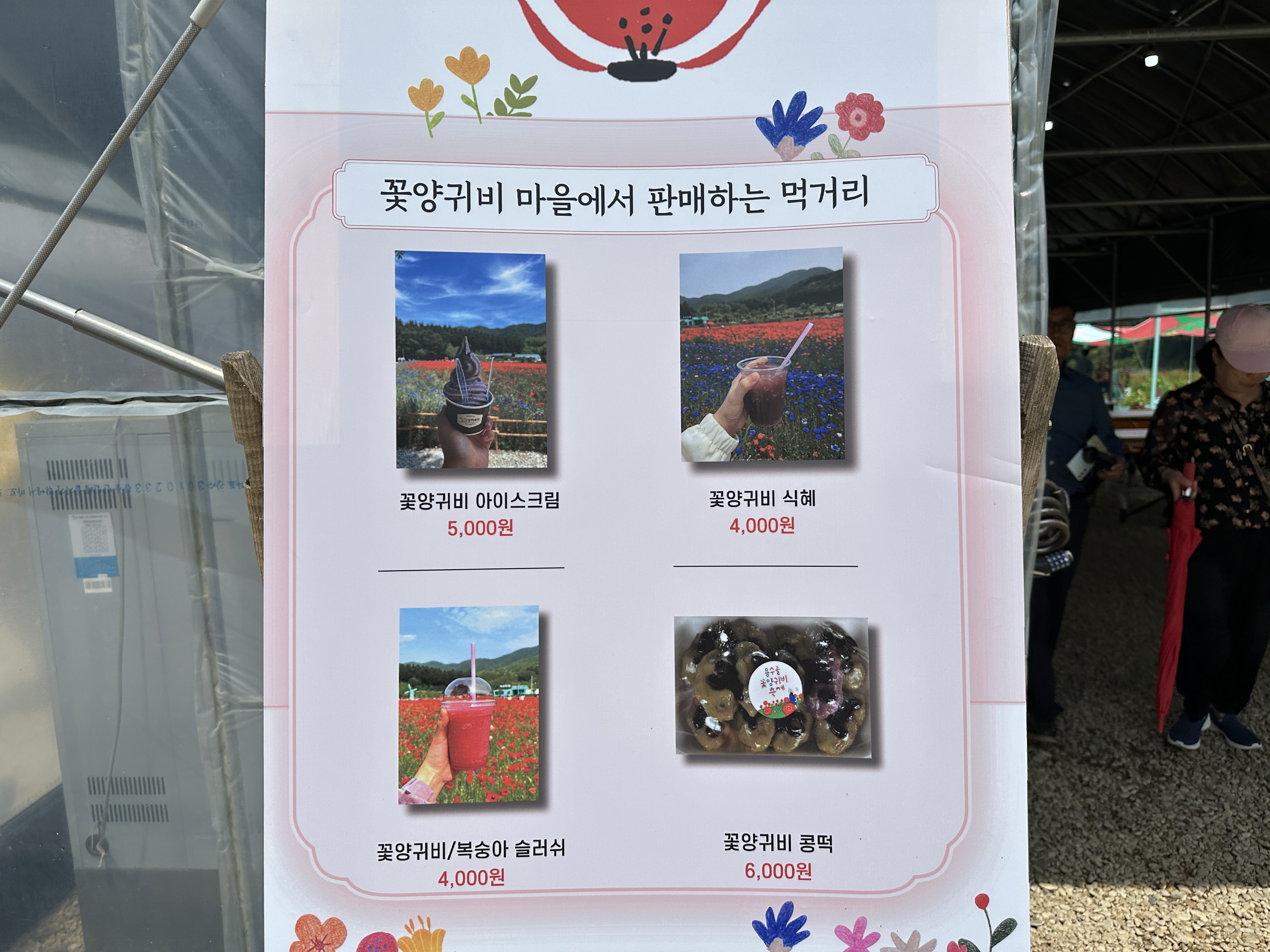 축제장 입구를 기준으로 왼쪽편에 체험부스와 판매부스가 있습니다. 다양한 먹거리와 체험활동을 즐길 수 있는 곳이었는데요. 꽃양귀비 마을에서 판매하는 대표적인 먹거리로는 꽃양귀비 아이스크림, 꽃양귀비 식혜, 꽃양귀비 복숭아 슬러시, 꽃양귀비 콩떡입니다. 판매 중인 굿즈로는 꽃양귀비가 그려진 에센셜 마스크와 손수건, 빨간 우산 있었고요.