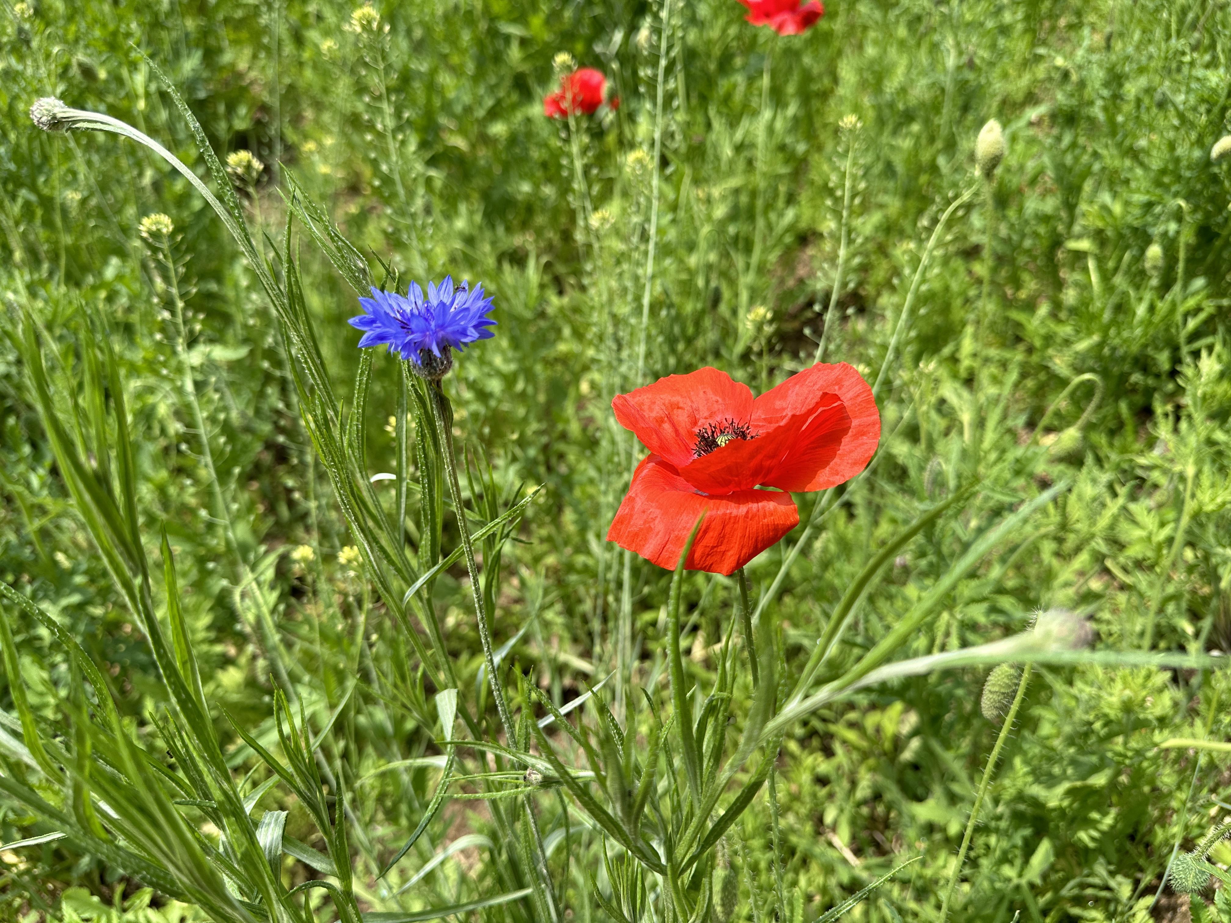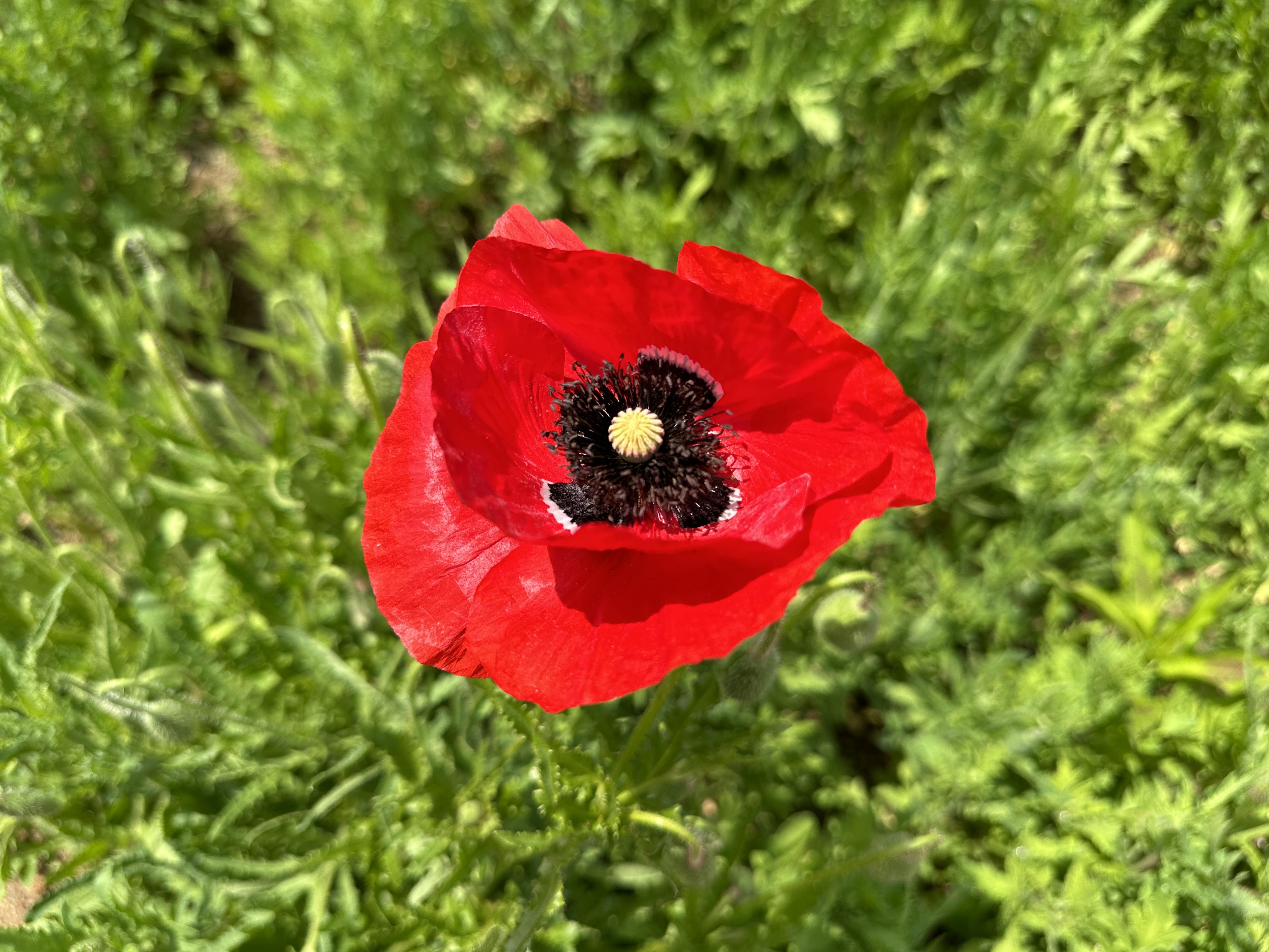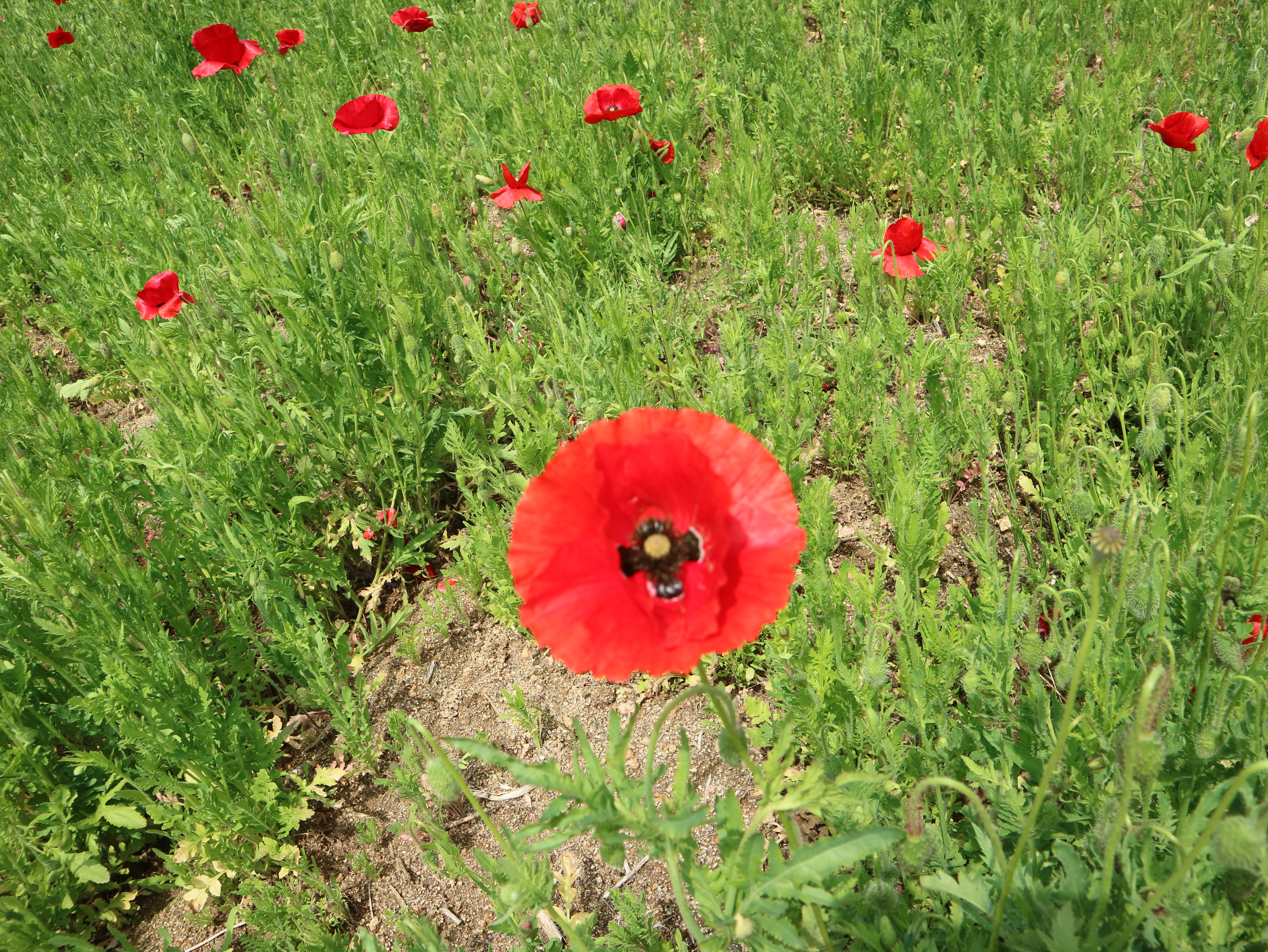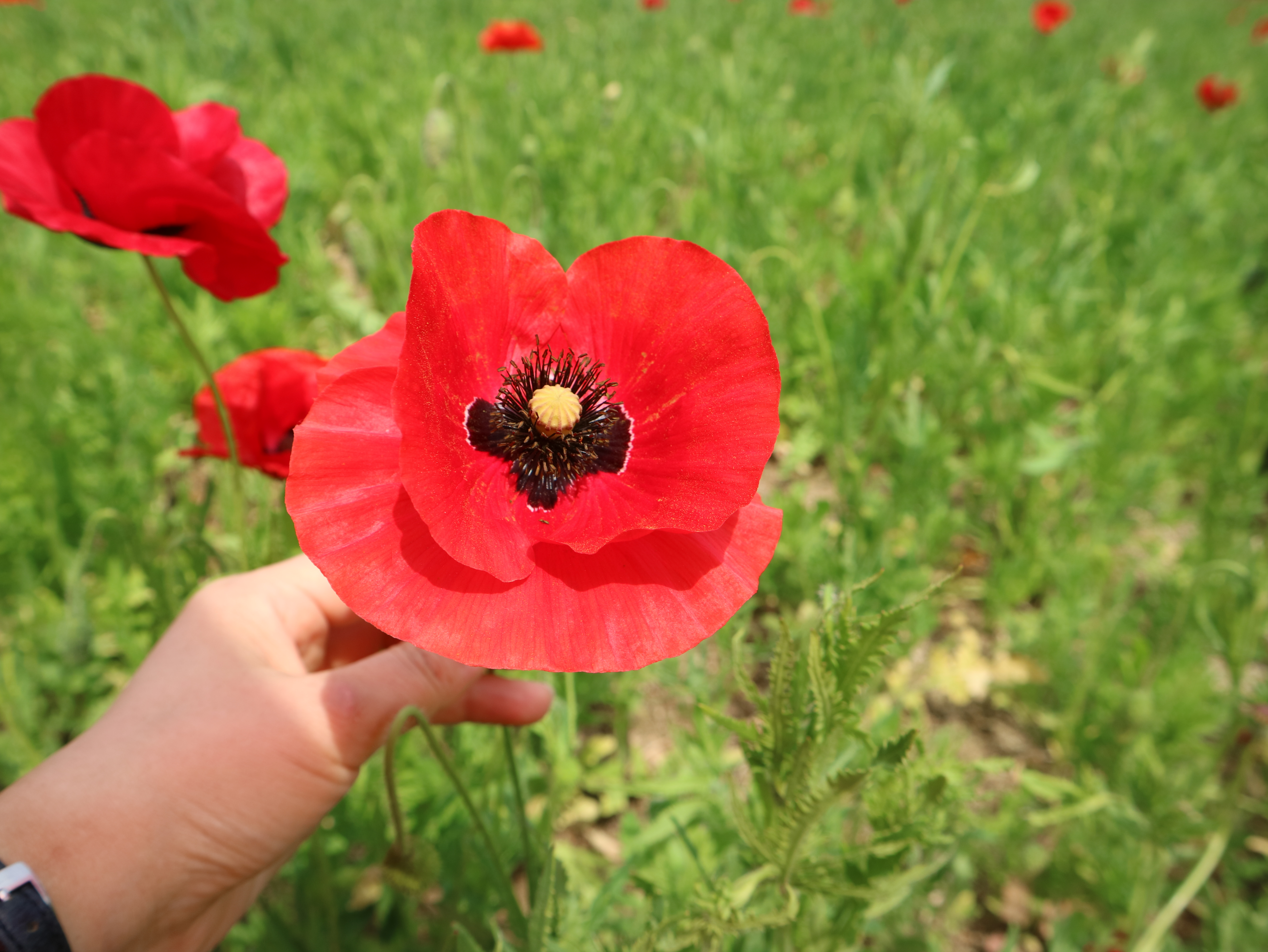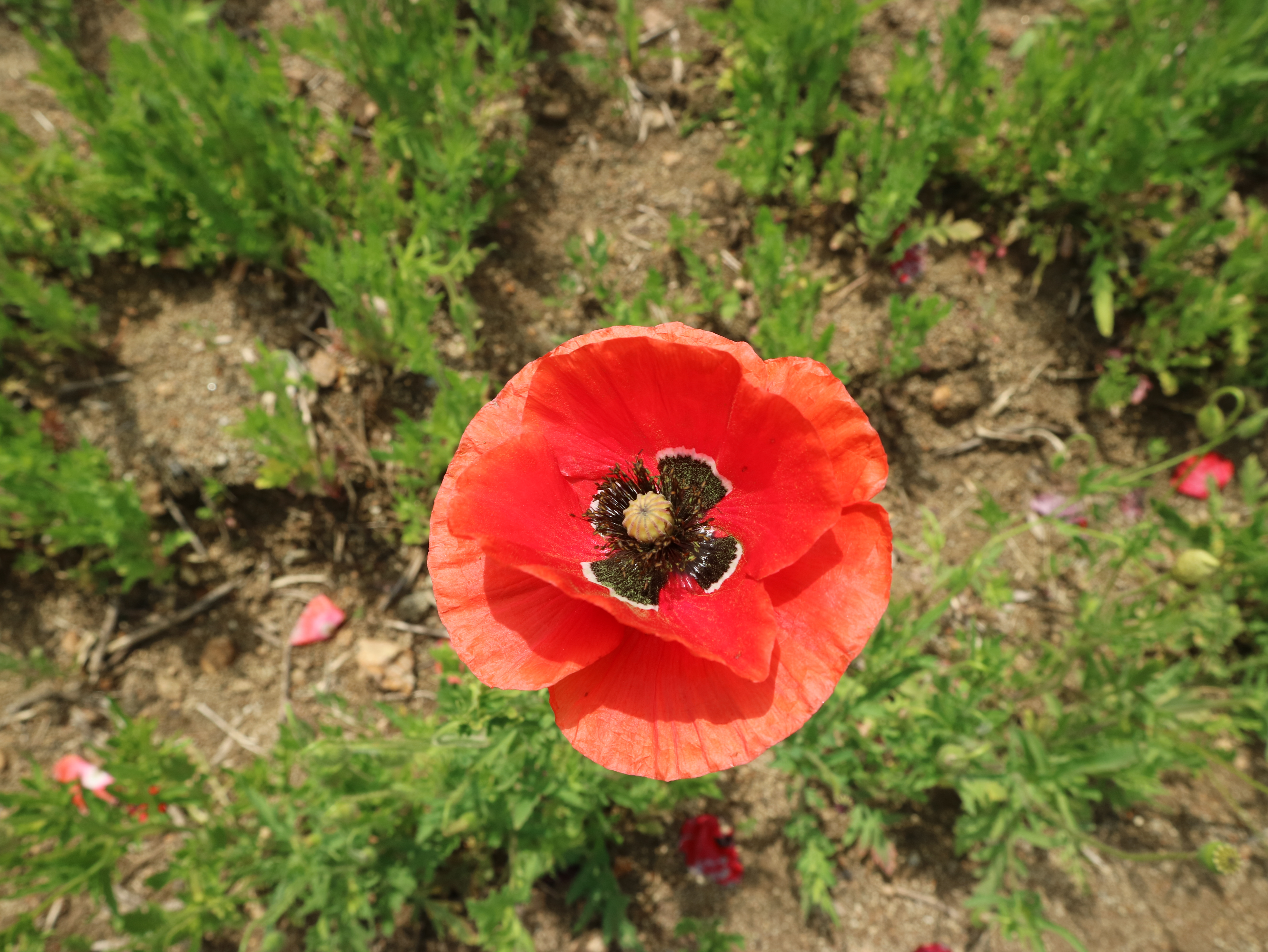 안쪽으로 들어가니 그래도 입구보다는 꽃이 많이 피었습니다. 꽃이 듬성듬성 있다보니 자연스럽게 꽃 한 송이 한송이에 눈길이 갔습니다. 꽃양귀비꽃은 새빨간 꽃잎 가운데 검은 수술이 있고 가장 안쪽에는 노란색 중심부가 있는 형태인데요. 모양과 색이 매우 강렬했습니다. 꽃양귀비는 개양귀비로도 불리는데요, 마약 양귀비와 달리 환각 성분이 없고 관상용입니다. 꽃양귀비의 꽃말은 '망각, 휴식, 위안, 덧없는 사랑'이라고 합니다.