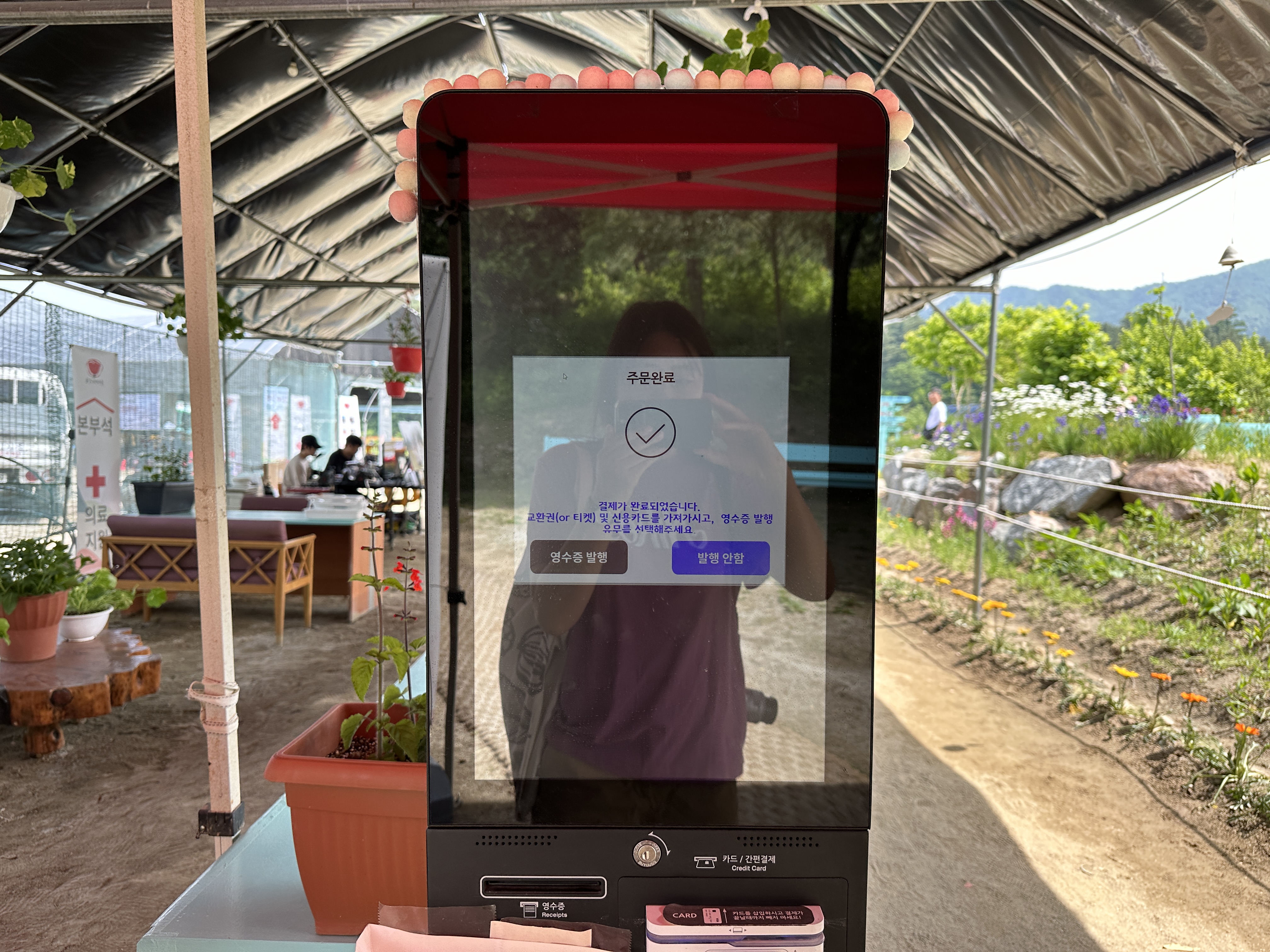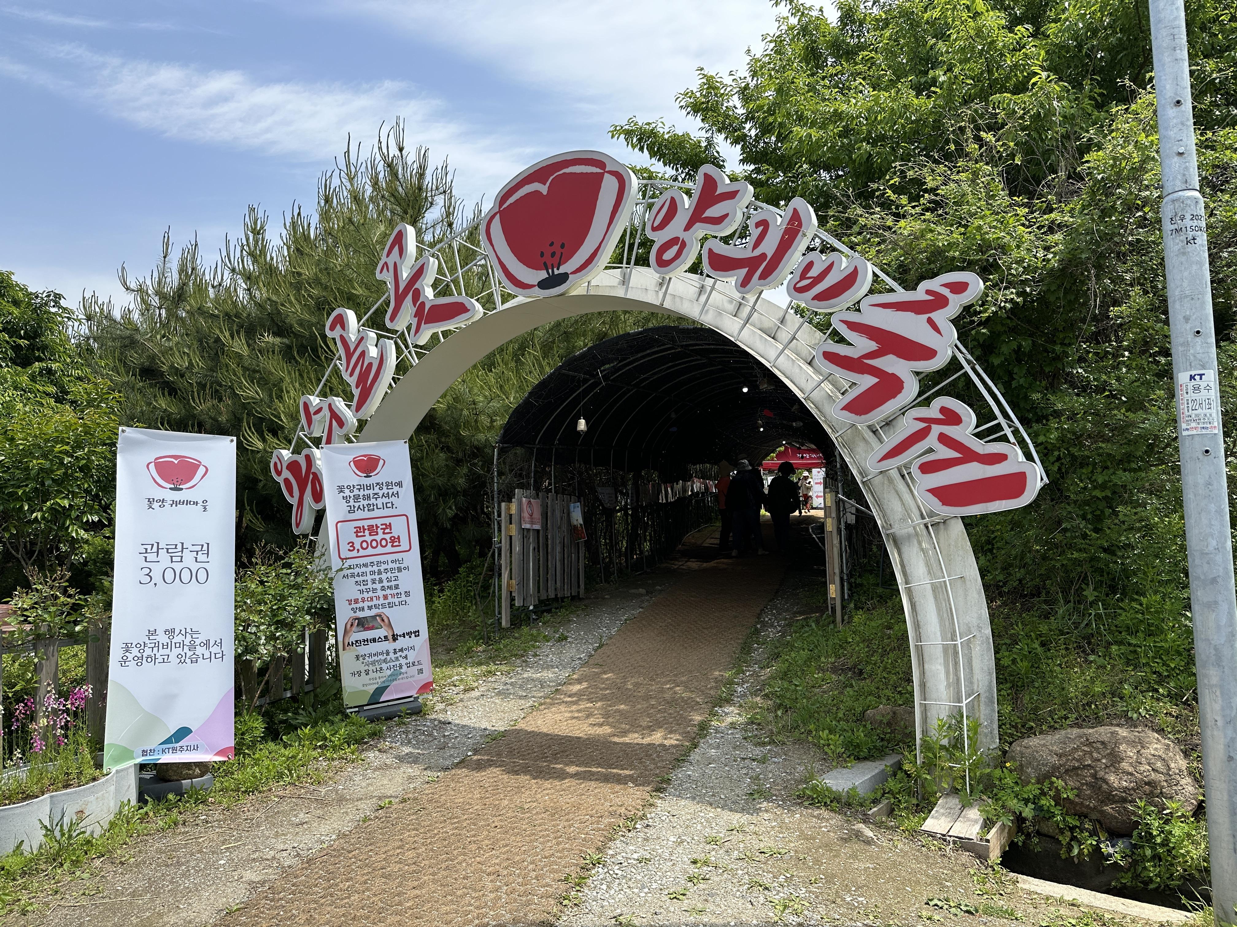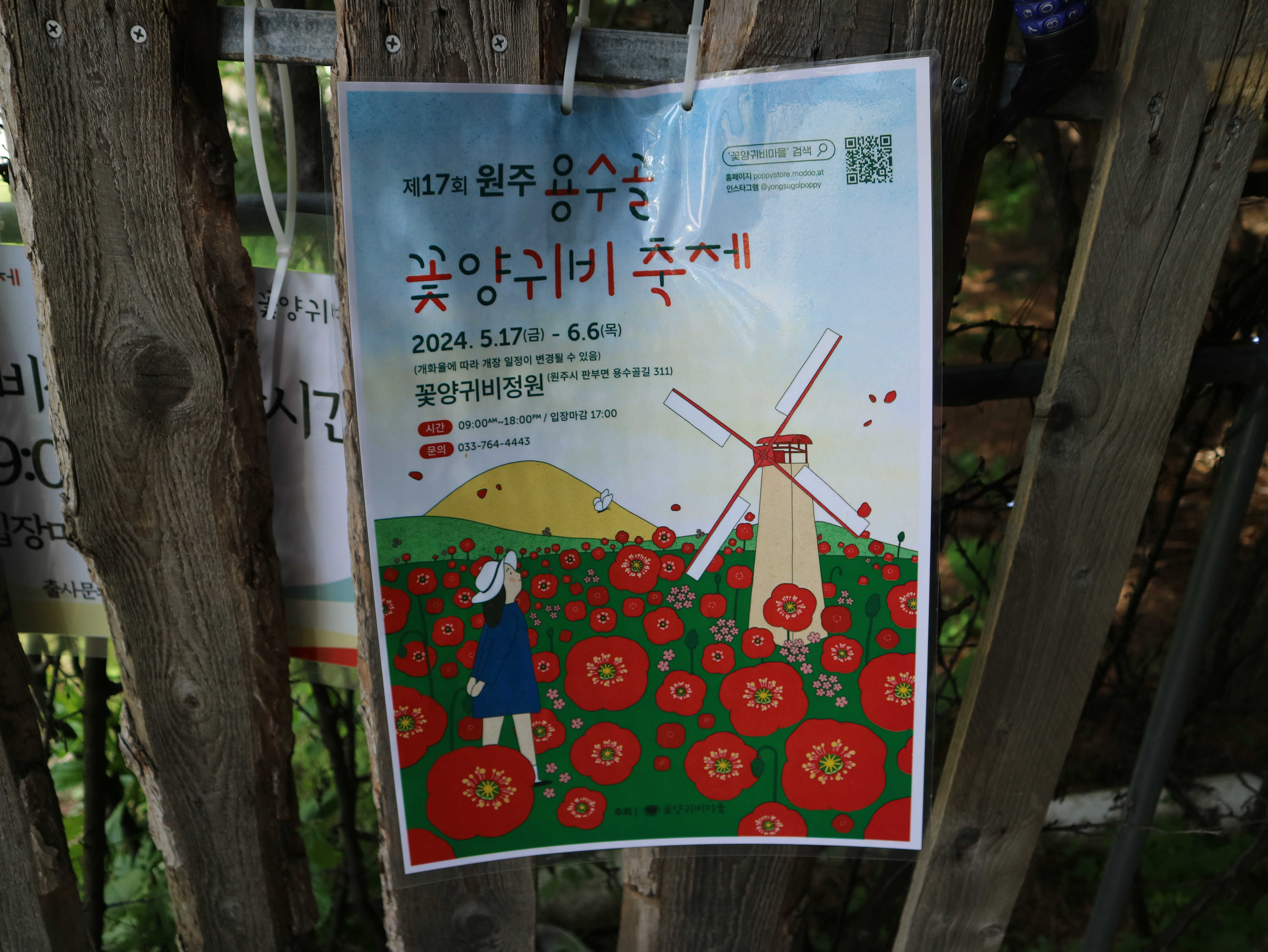 매표소까지 이어진 짧은 통로에는 지역 어린이들이 쓰고 그린 시화들이 전시되어 있었습니다. 어린이들도 참여하는 동네 잔치 느낌이었습니다. 통로를 지나면 안쪽에 간이 매표소가 있었는데요. 무인으로 입장권 구입할 수 있는 키오스크가 한 대 있고, 안내원에게서 일반 매표를 할 수도 있었습니다. 관람료는 3,000원입니다. 지역 축제를 가 보면 관람권 요금의 일부나 전액을 지역 상품권으로 돌려주어 현장에서 사용할 수 있는 경우가 많은데요. 용수골꽃양귀비축제는 페이백 행사는 따로 없었습니다. 아마 지역주관이 아니라 마을에서 운영해서 그런 듯했습니다.