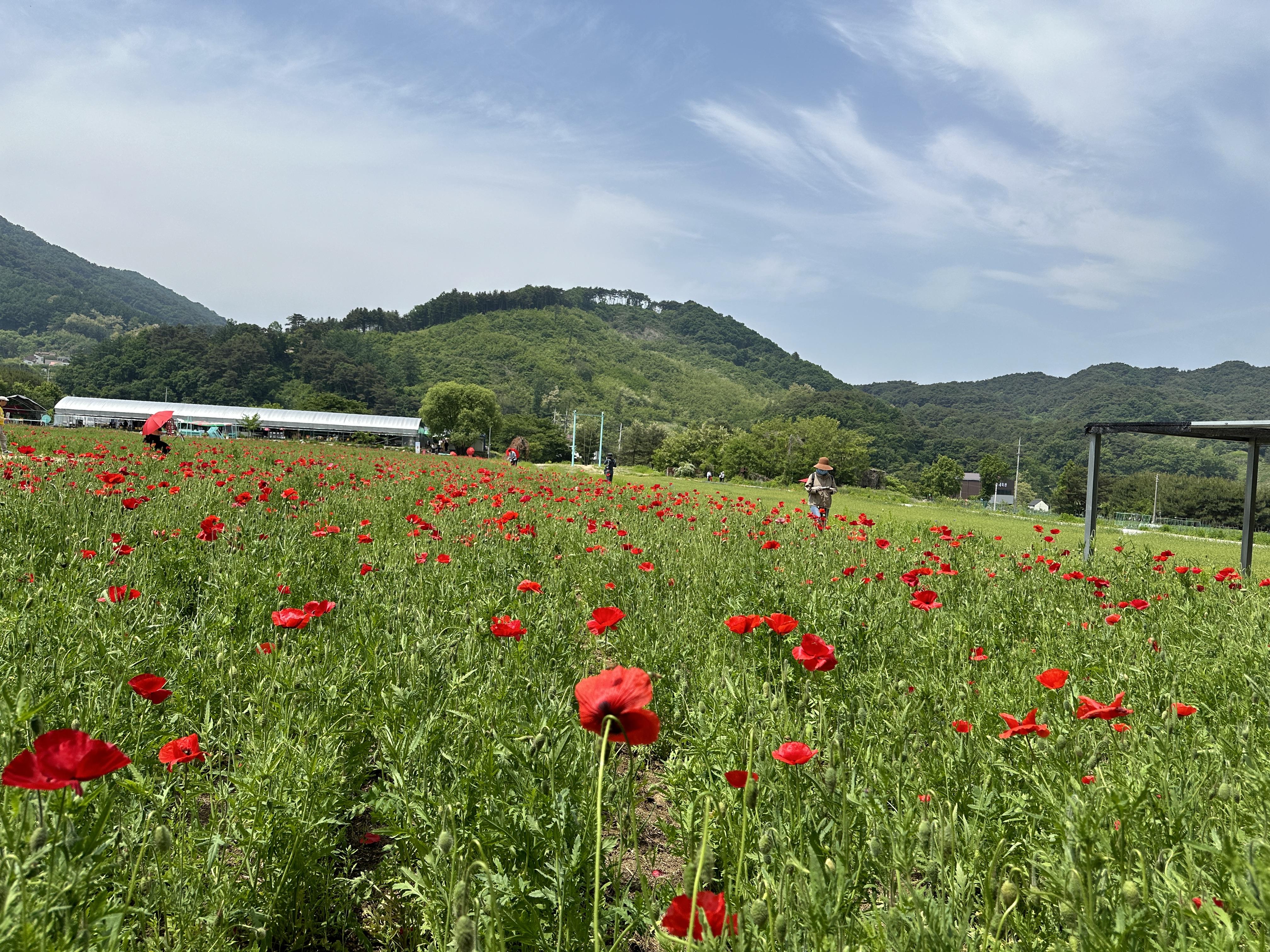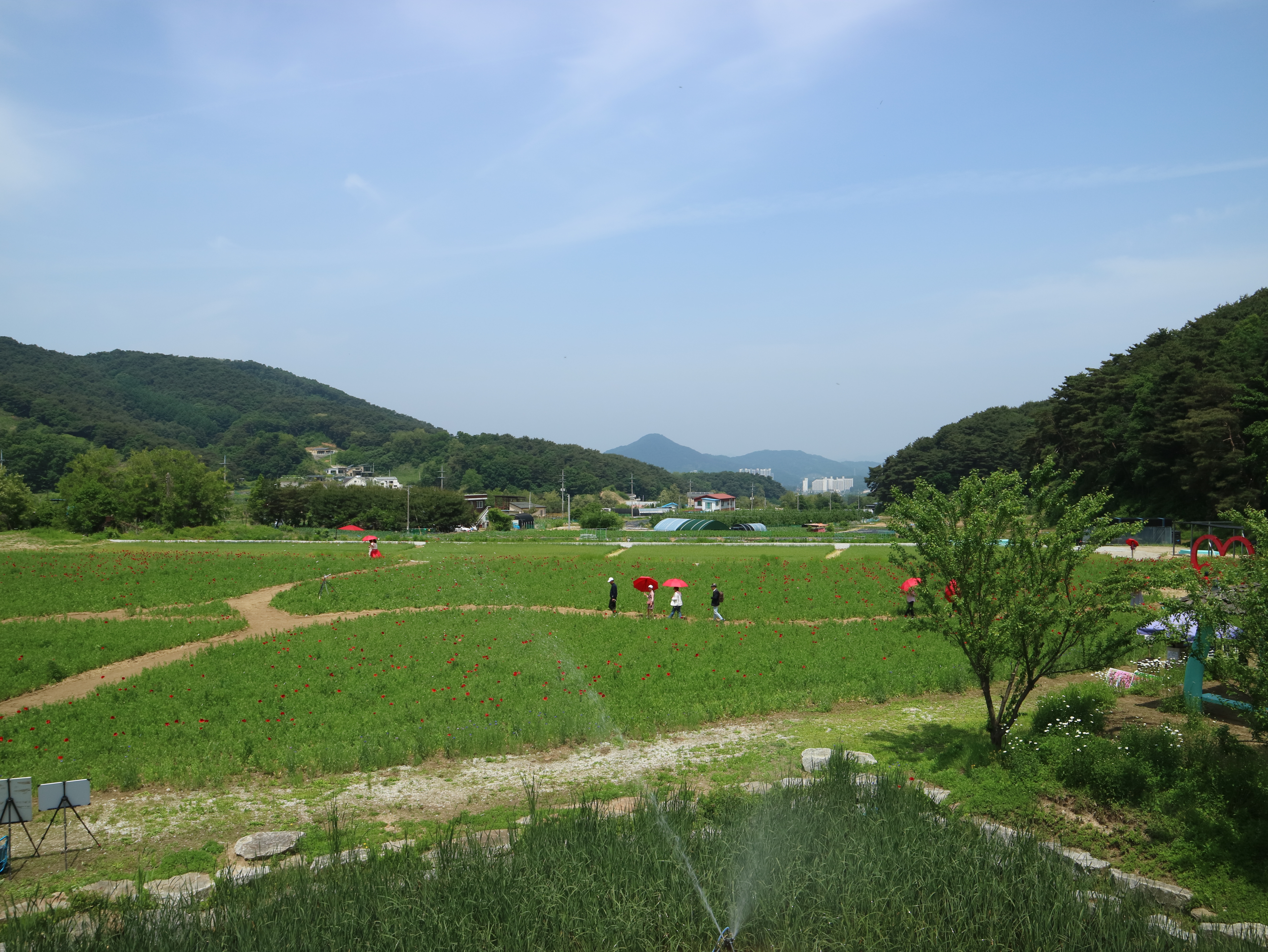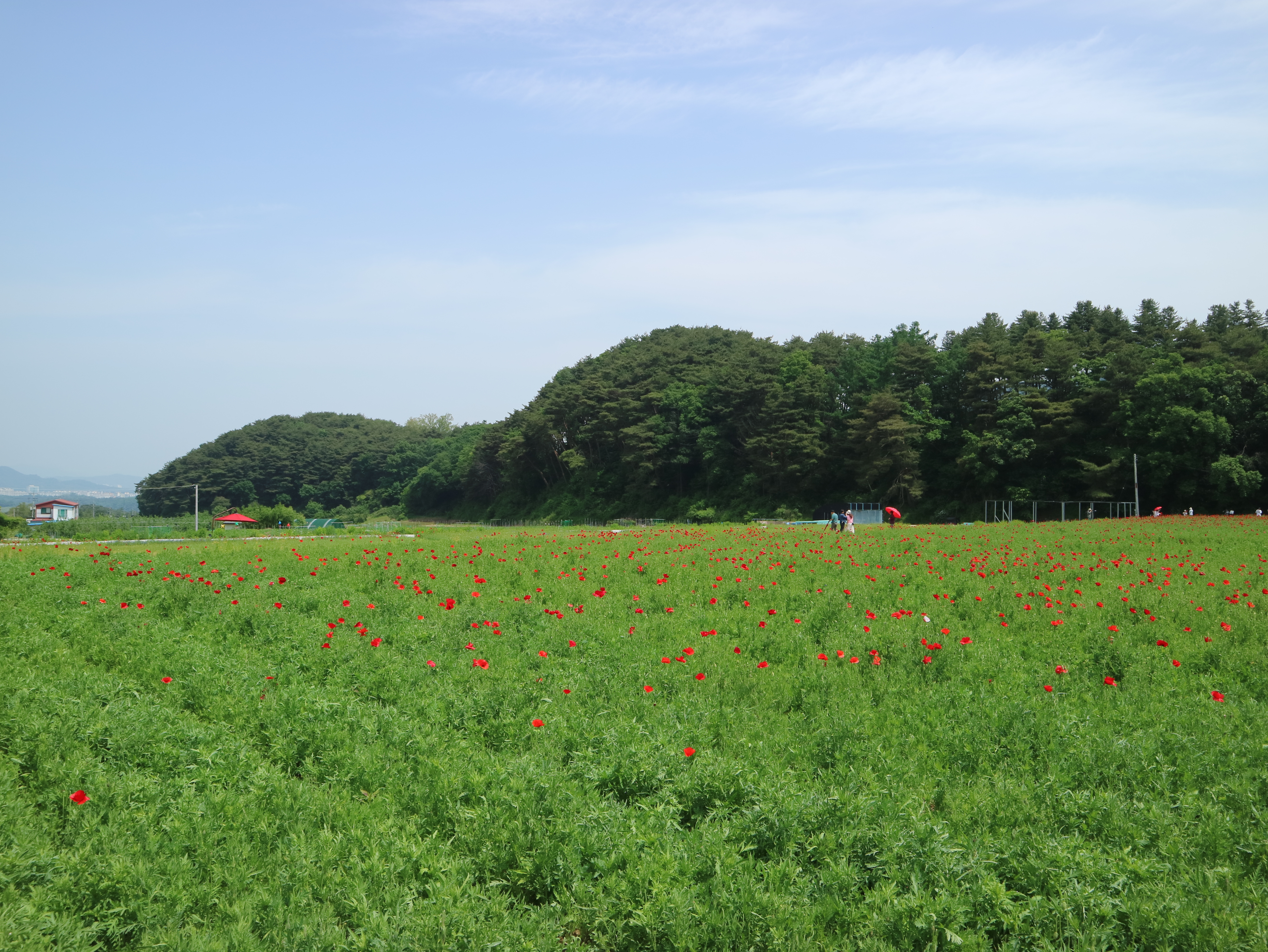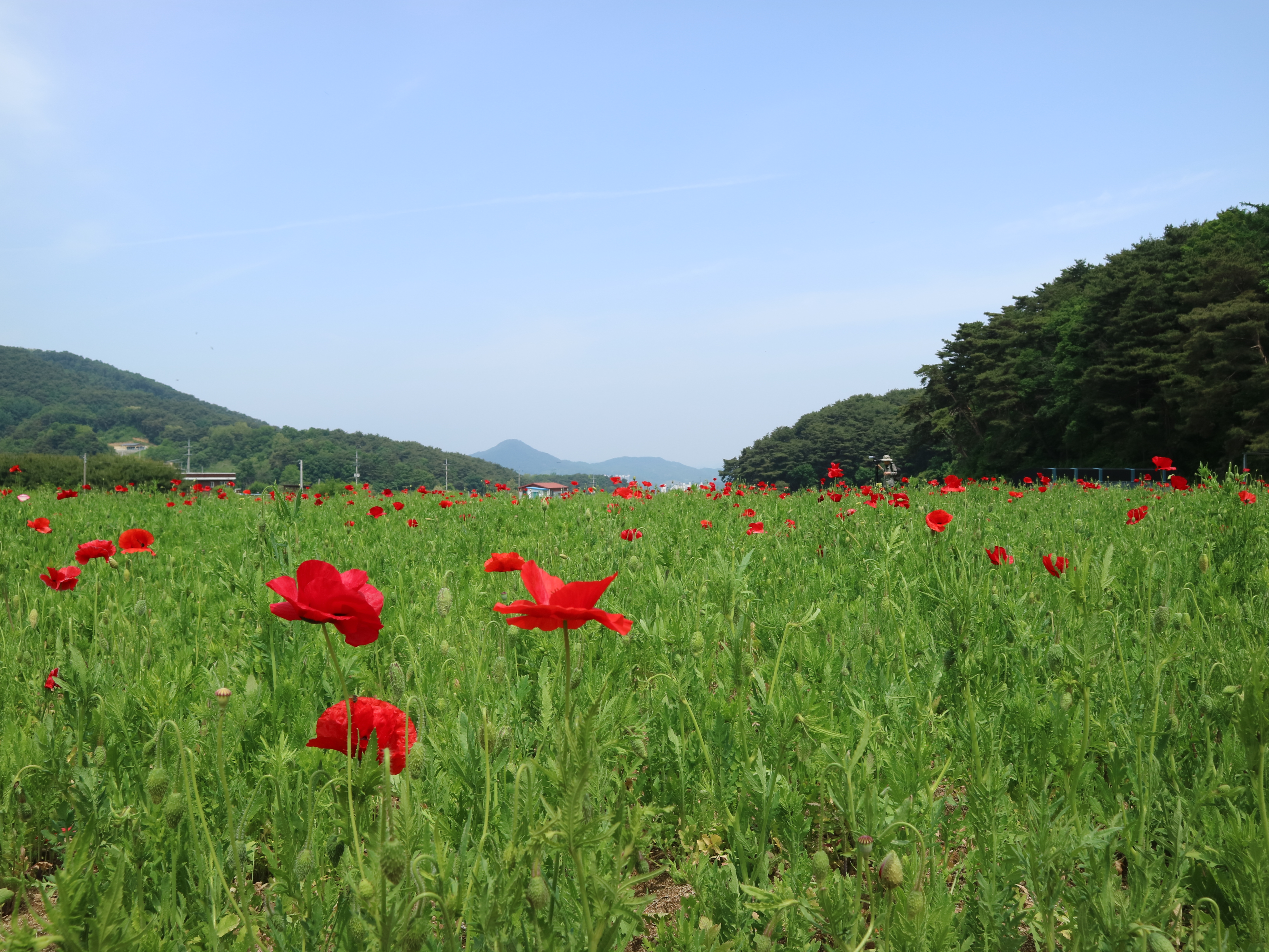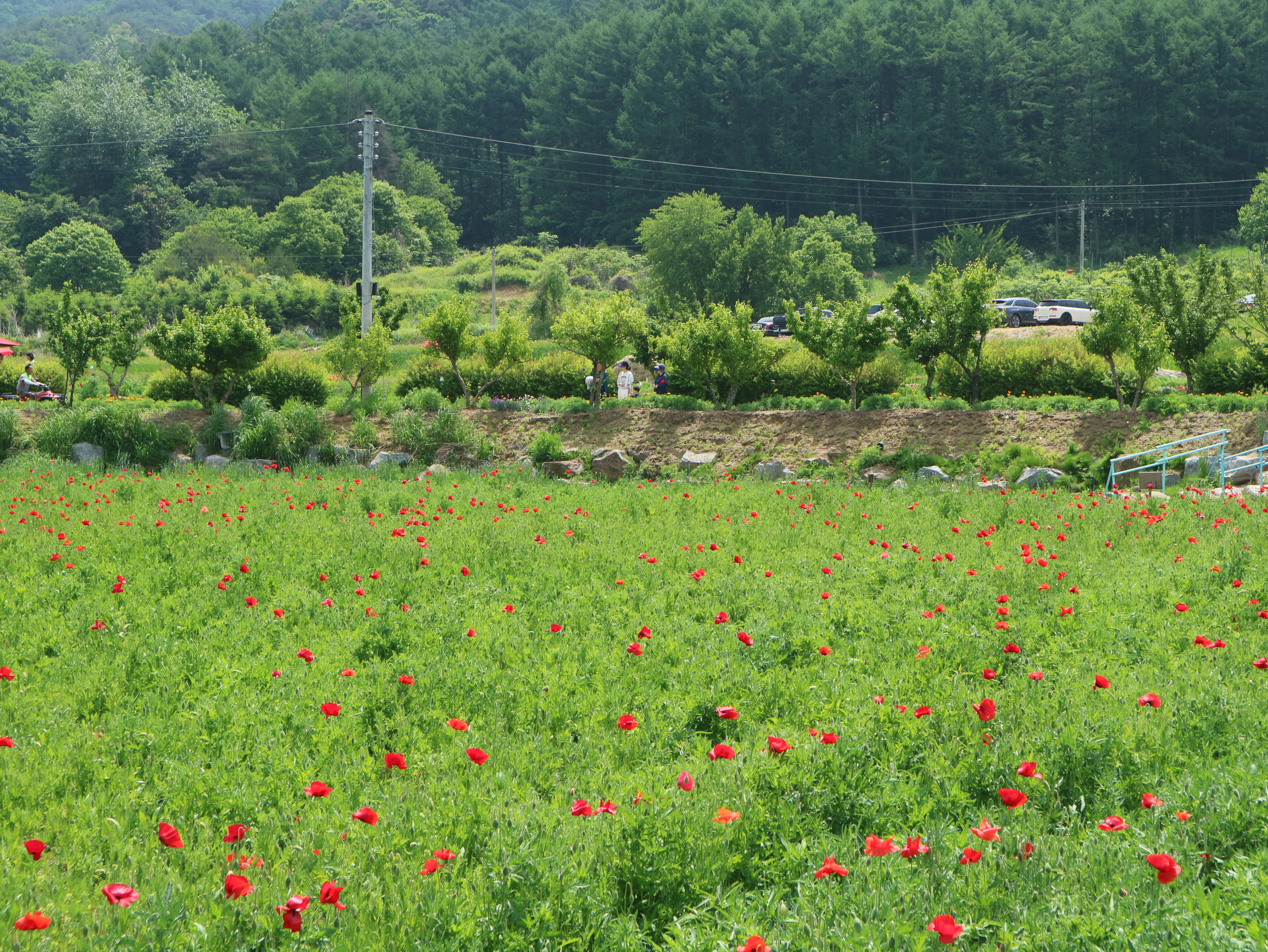 꽃양귀비정원은 축제장 입구를 기준으로 뿔형태로 조성되어 있습니다. 한 눈에 꽃 밭이 들어왔습니다. 온통 새빨간 풍경을 기대했는데, 축제 첫날이라 그런지 개화율이 25% 정도 되어 보였습니다. 빨간색보다는 초록 잎이 훨씬 많았어요. 엊그제 강원도 어느 곳에는 폭설이 내리기도 했다니 이상기후에 이 정도 개화율이면 양호하다 할 수 있을까요. 아마 다음주가 지나면(5월 말쯤) 개화율도 높아지도 훨씬 예쁜 풍경이 될 것 같습니다. 너무 일찍 왔다는 생각이 들었습니다.