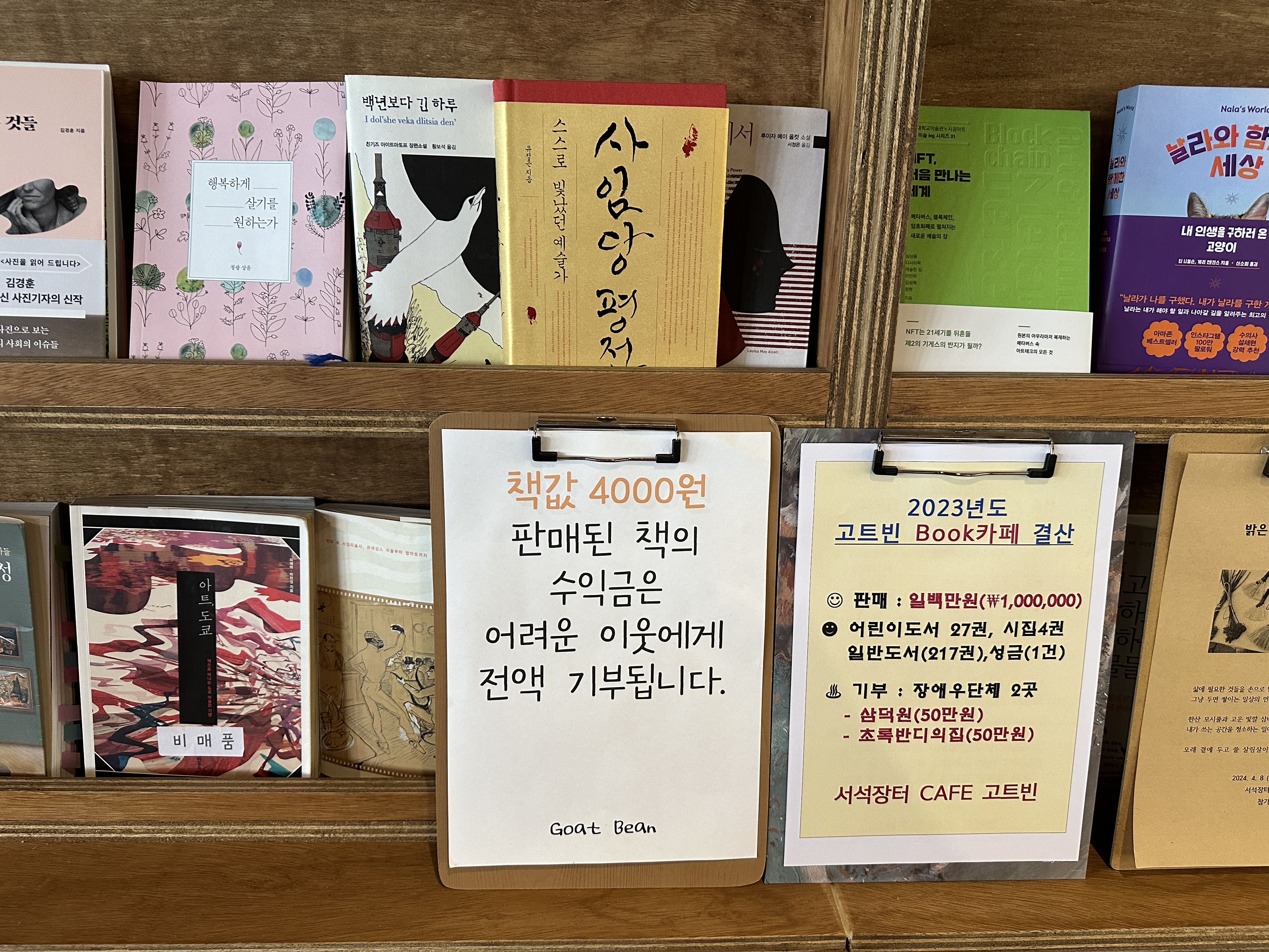 고트빈은 작은 책방이기도 했다. 카페 한 면은 책장으로 다양한 책이 구비되어 있었다. 카페에서 판매하는 책은 정가로 판매하는 신간과, 균일가 4,000원에 판매하는 책들이 있는데 정가로 판매하는 책은 실제 서점과 연계하여 판매하는 것이고, 균일가로 판매하는 책들(새책 & 헌책)의 판매 수익은 전액 기부된다고 한다. 카페 내부에 서 그림과 작품 전시도 하고 비정기적으로 음악회도 열린다고 한다. 지역과 상생하는 좋은 예라고 할 수 있다.