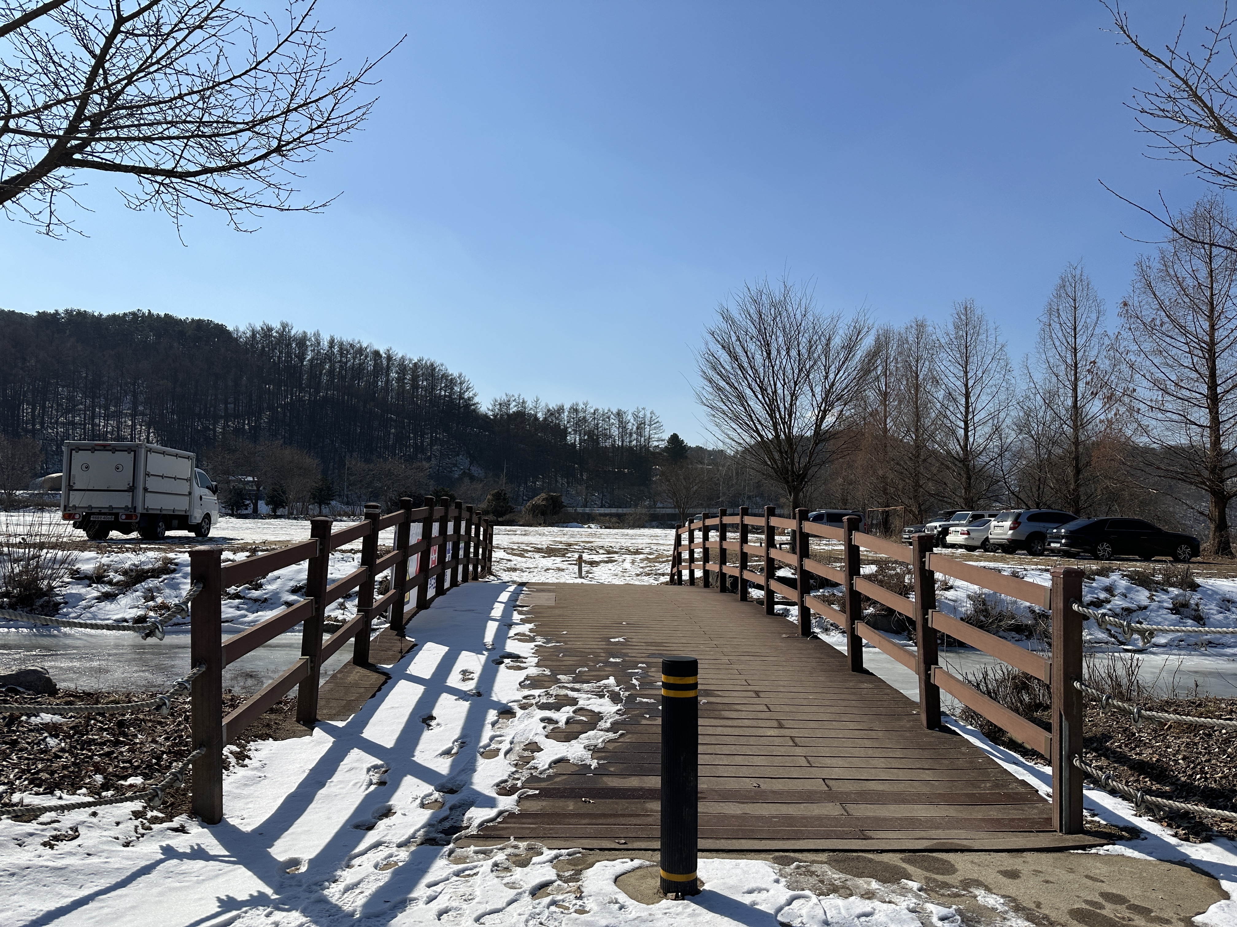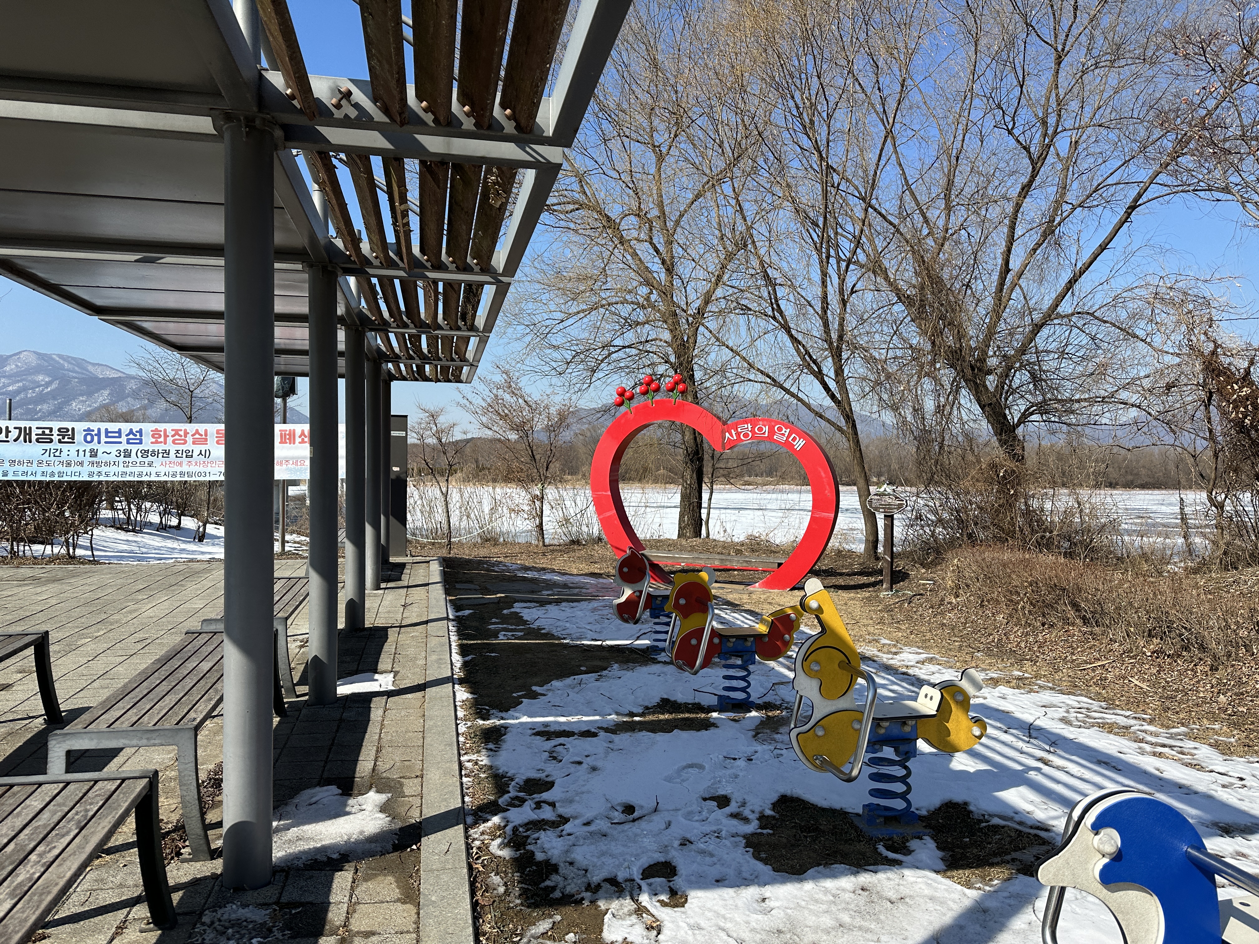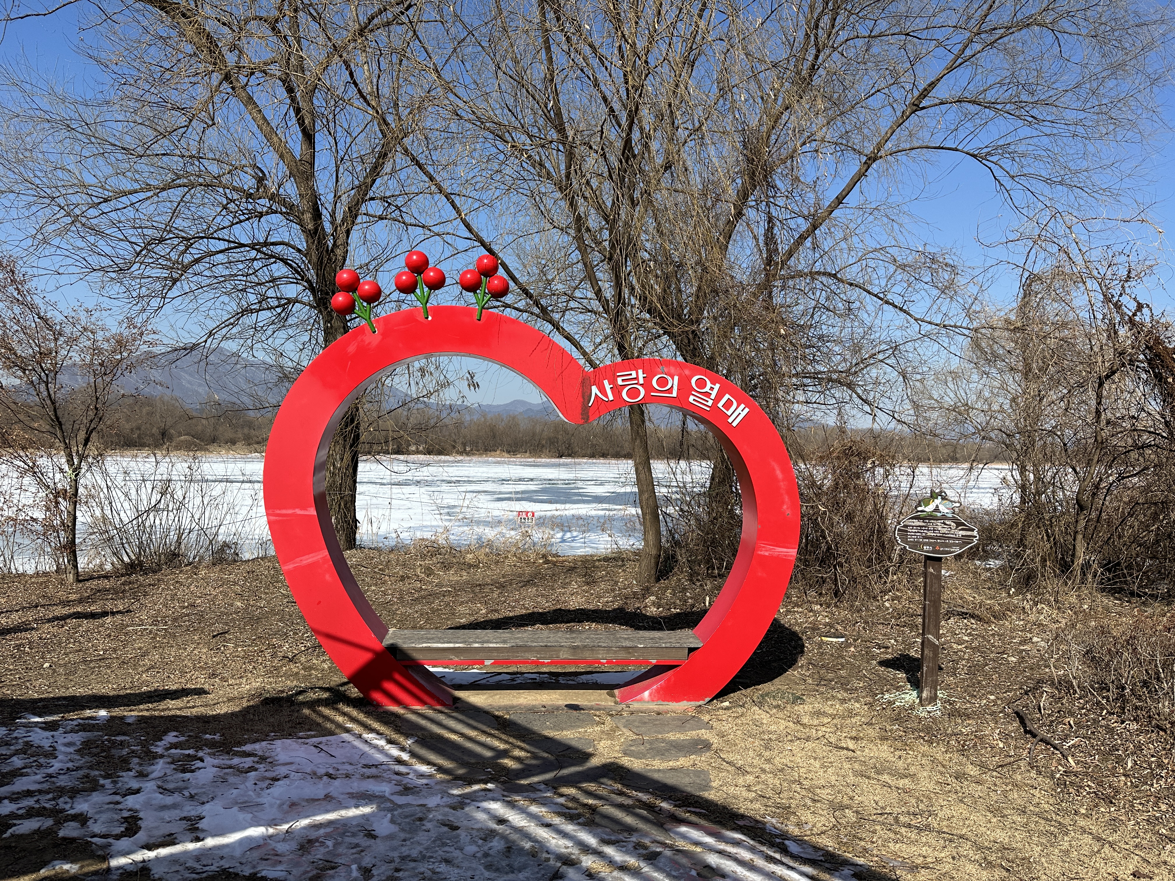 한낮이라 날씨는 좀 풀려서 많이 춥지 않았다. 다만 겨울이라 꽁꽁 언 강과 앙상한 나무들, 허허벌판을 마주해야 했다. 산책로 입구에는 아이들이 놀 수 있는 작은 놀이터와 사랑의 열매 포토부스가 마련되어 있었다.