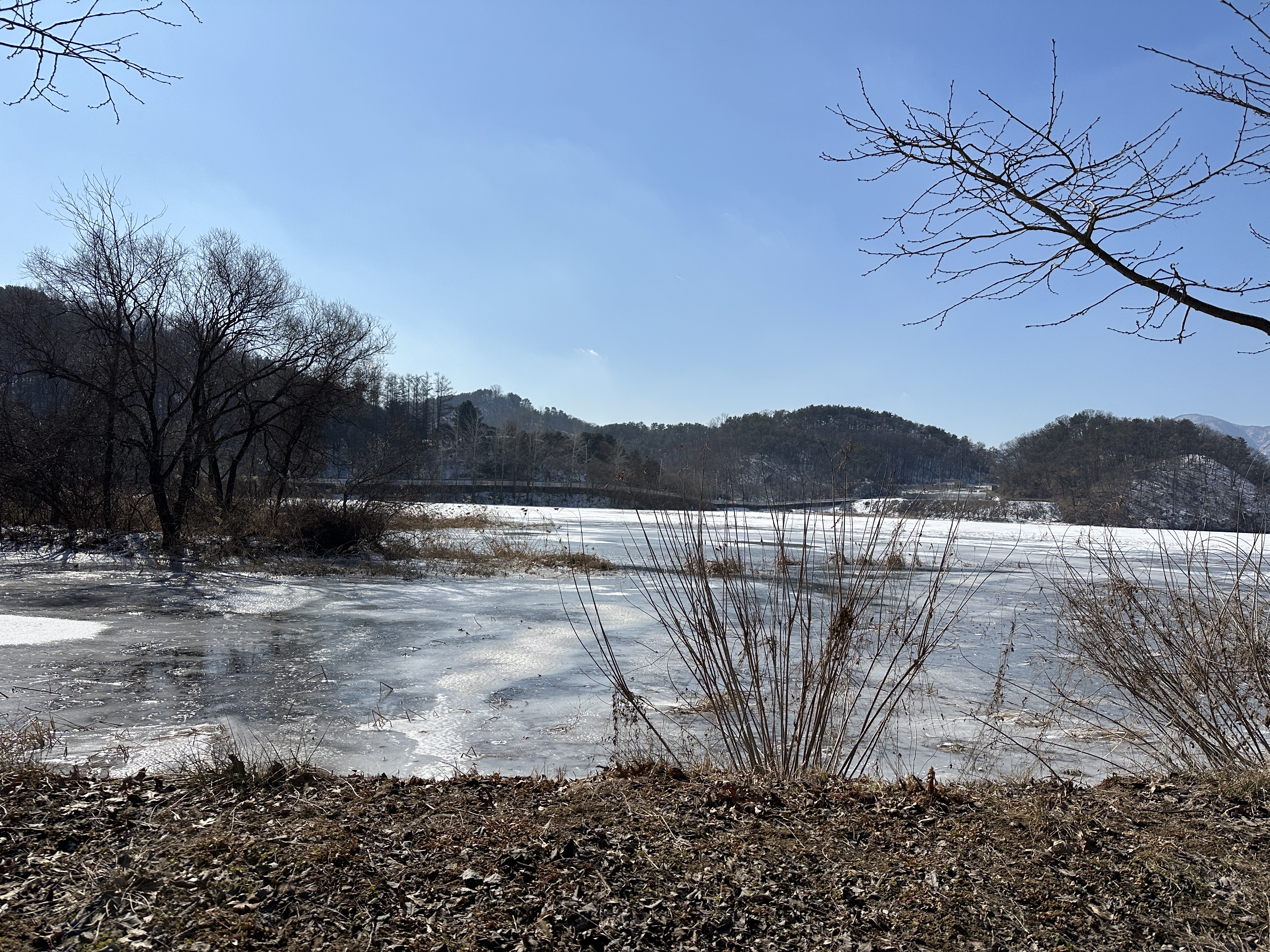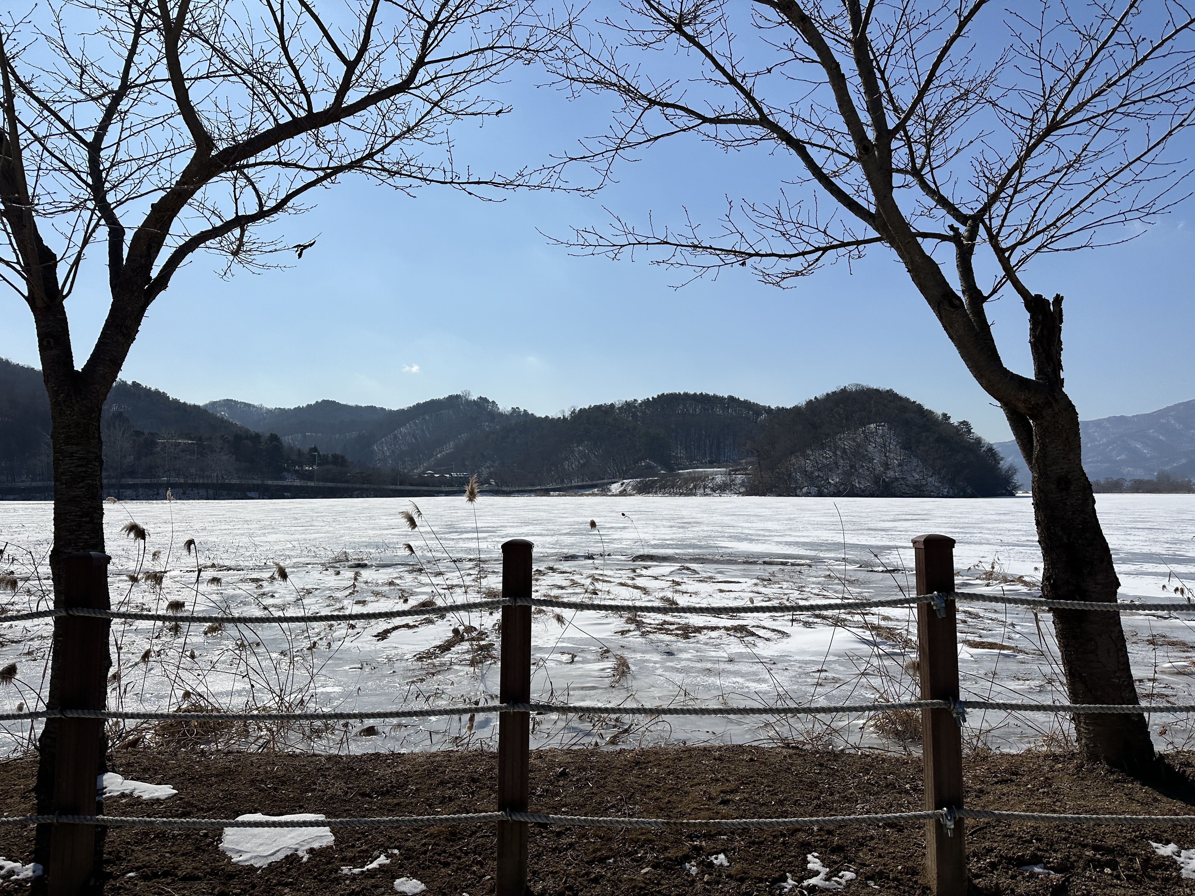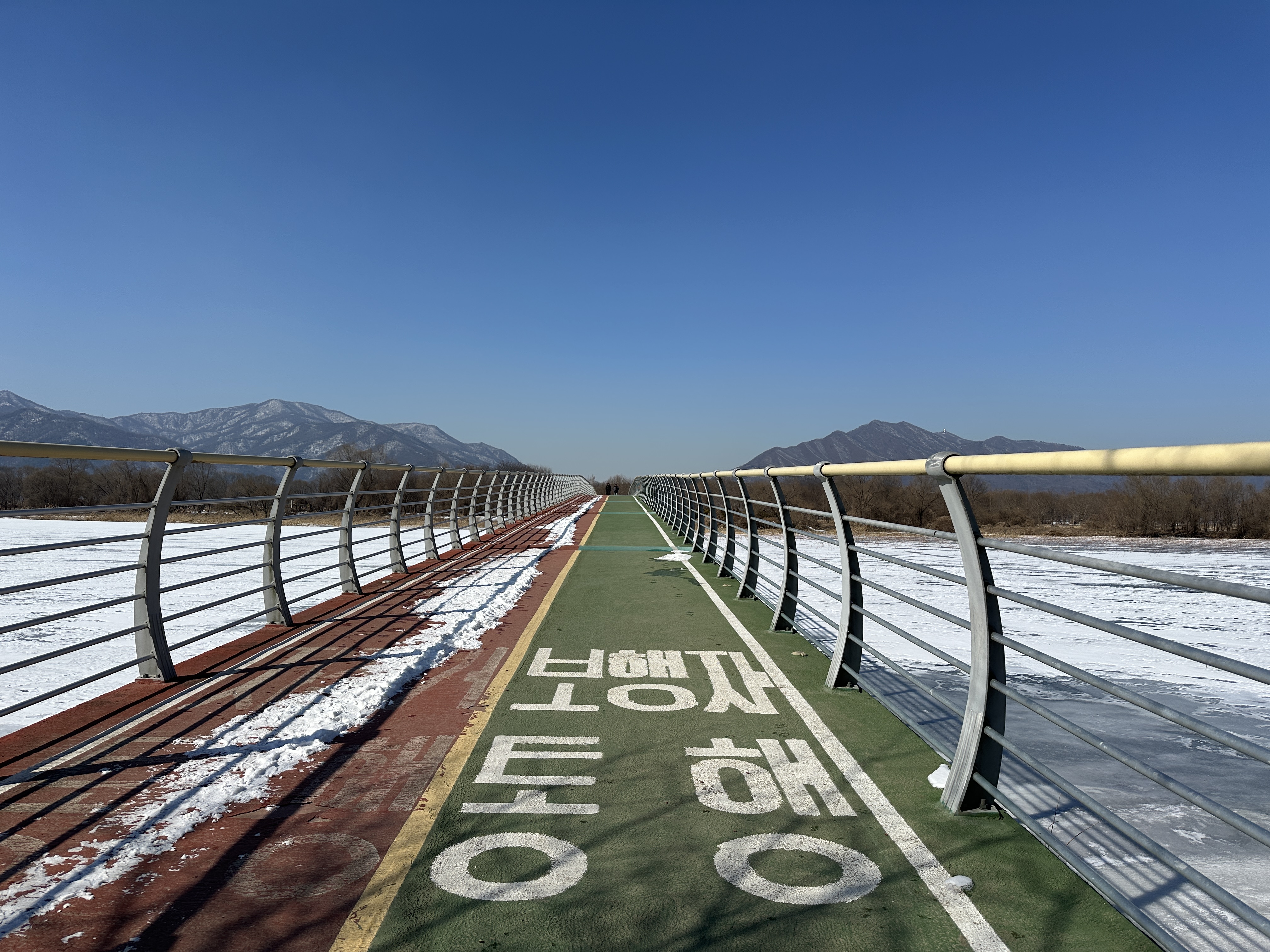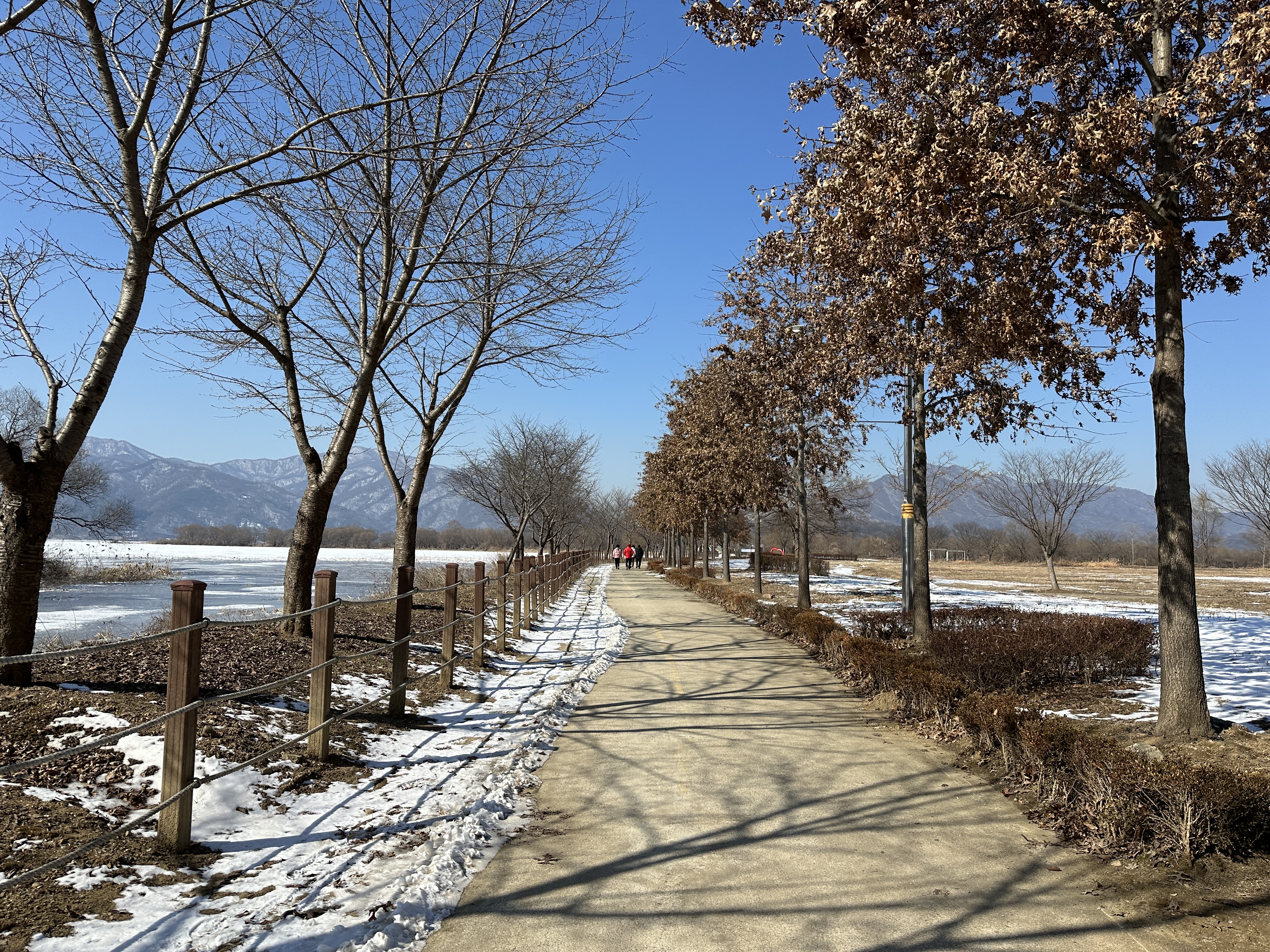 팔당물안개공원 산책로는 긴 타원형태인데 겨울이라 계속 똑같은 풍경이 지루해서 반원을 가로질러 반바퀴만 돌았다. 반원을 도는데도 한 시간 가까이 걸렸다.