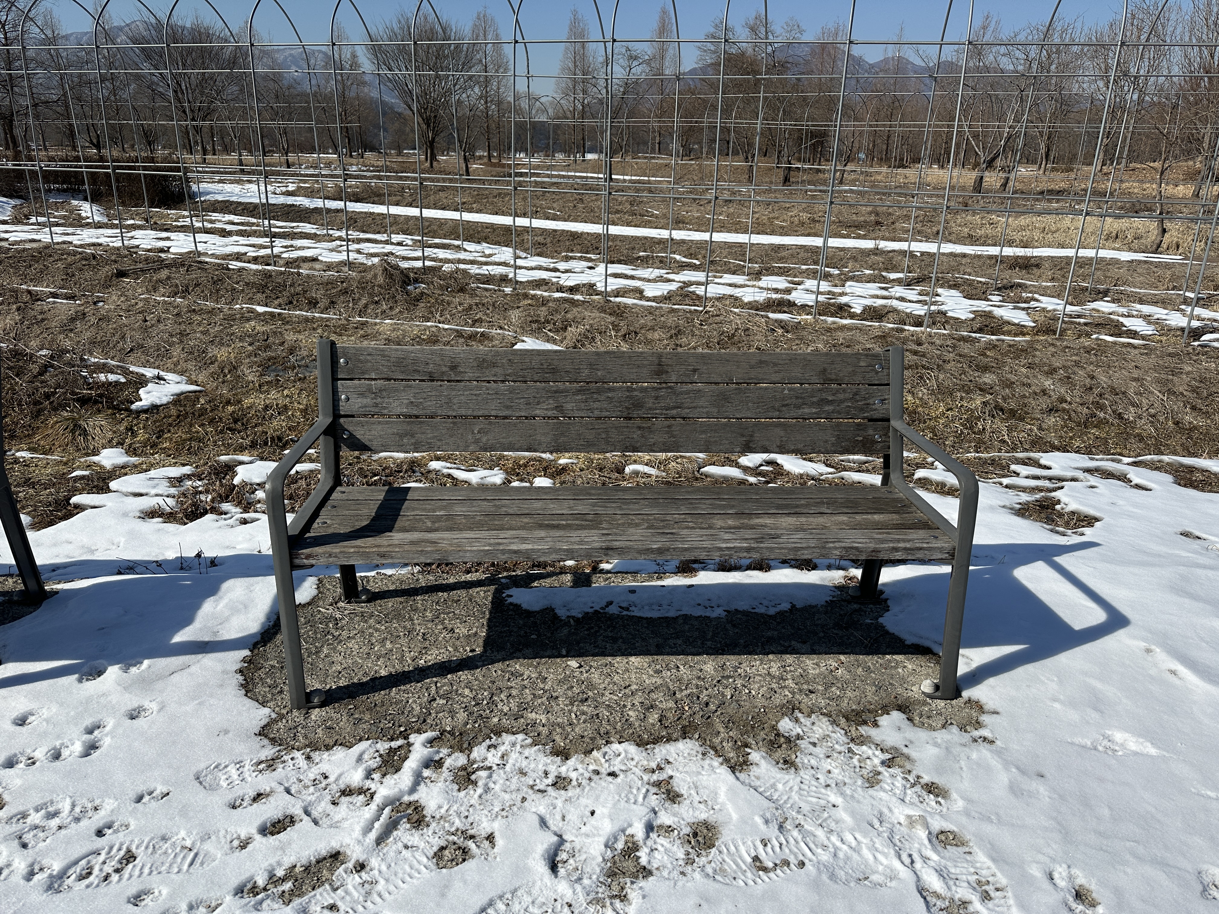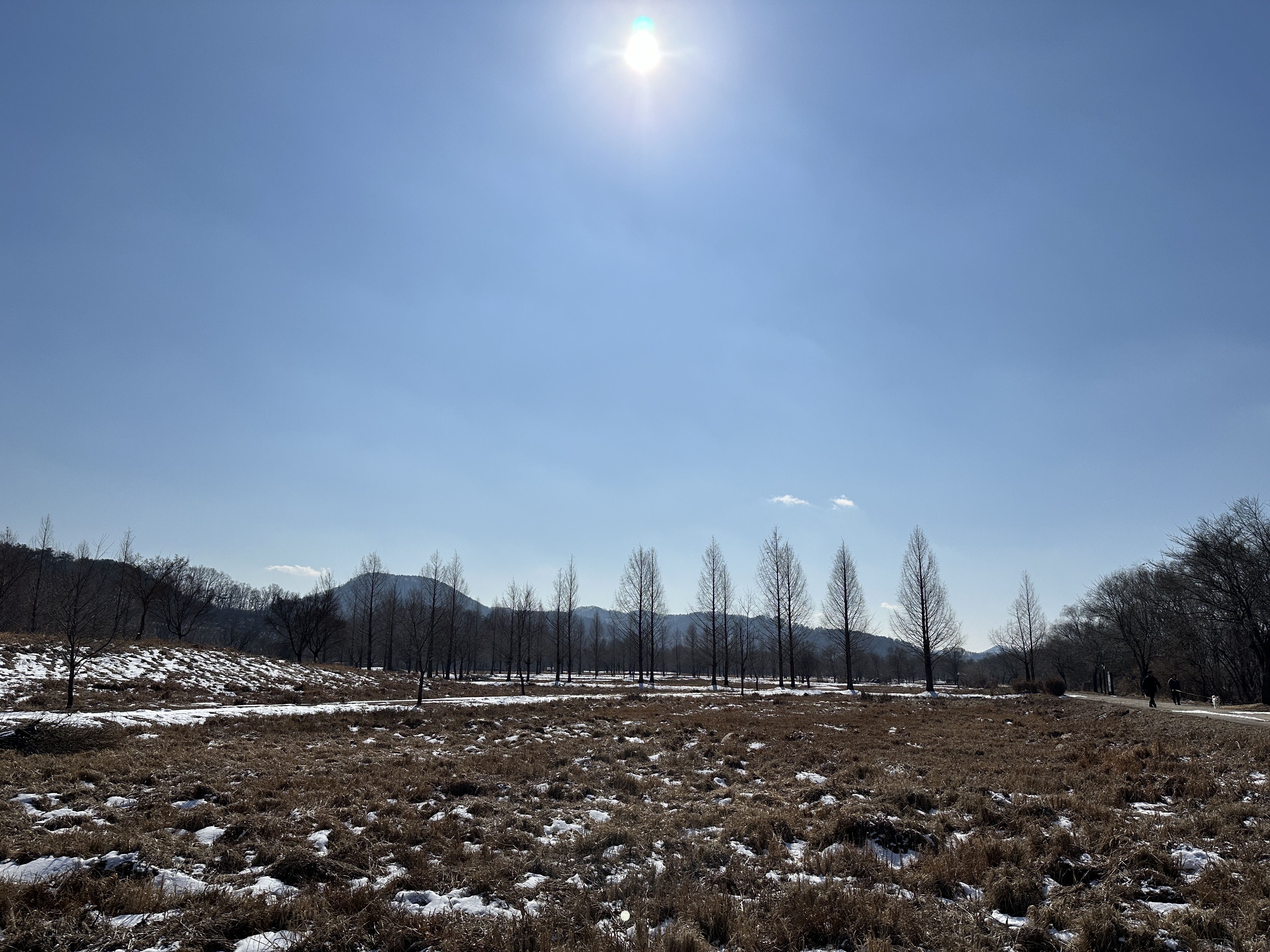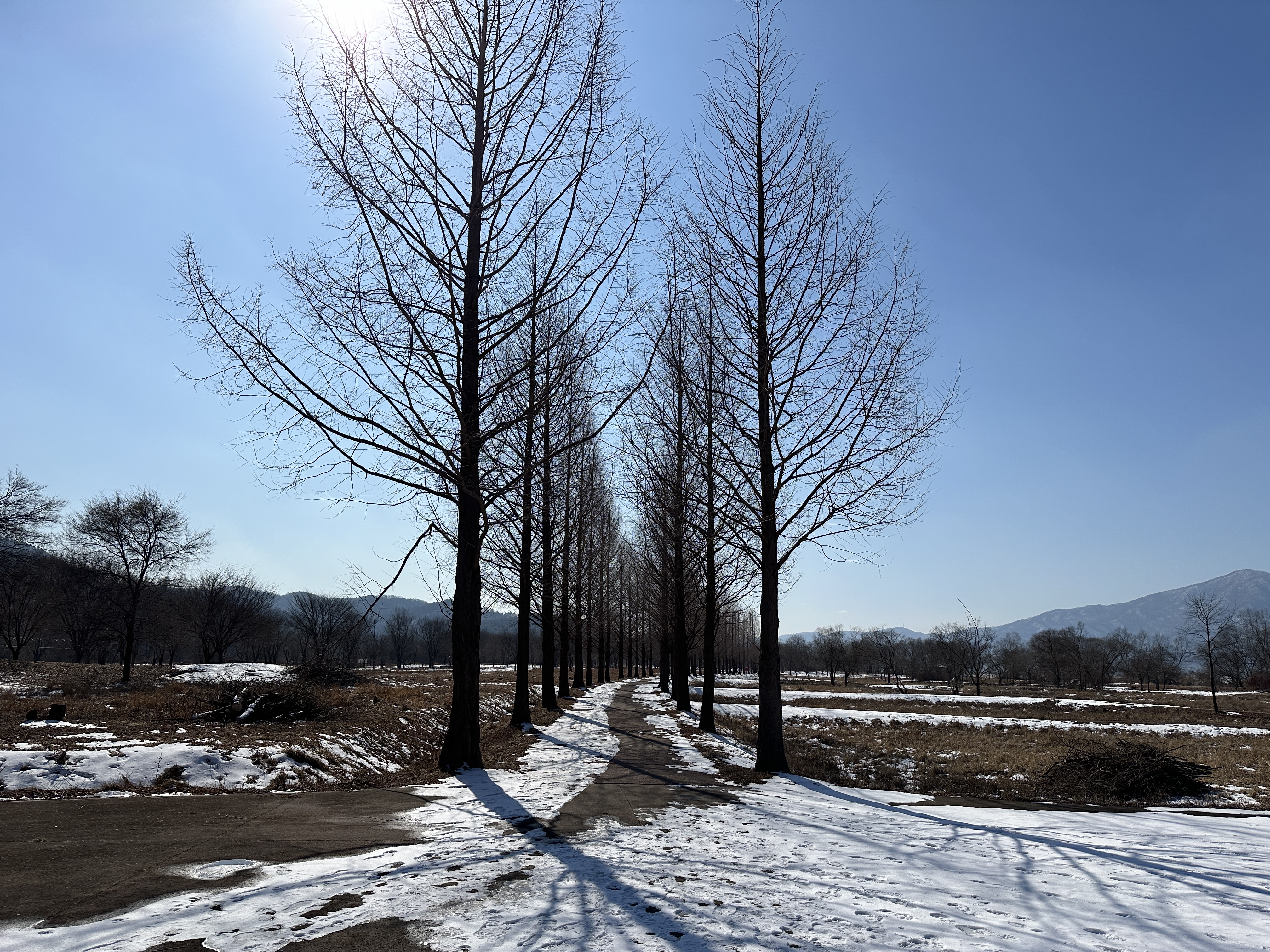그럼에도 황량해 보이는 들판에 잎 하나 없이도 꼿꼿이 서 있는 메타세쿼이아 나무들이 참 아름다웠다.
