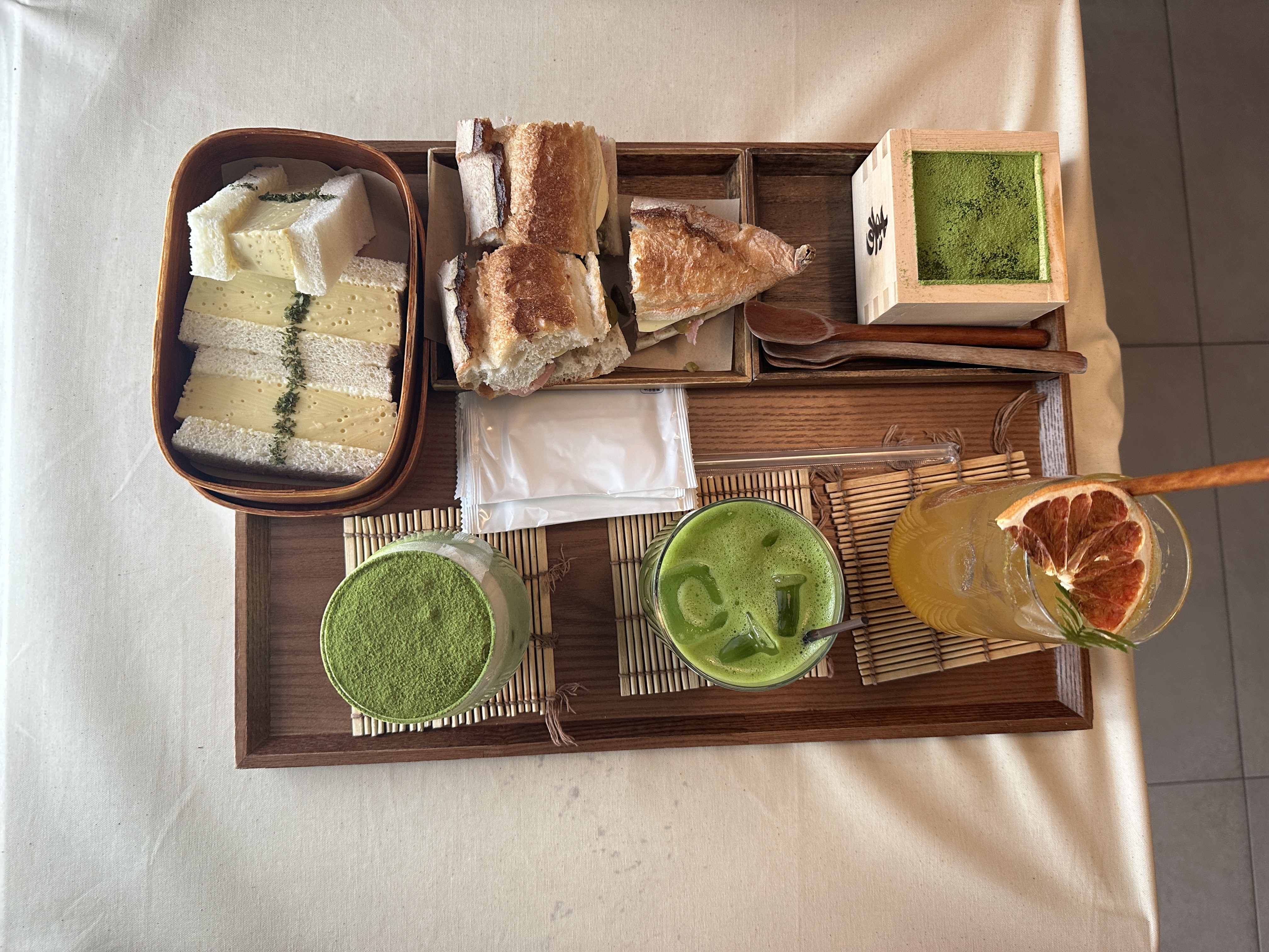 주문은 음식을 만드는 카운터 앞에 설치되어있는 패드로 할 수 있다. 음료와 디저트를 고르고 선결제하면 된다. 우리는 말차라떼와 말차, 한라봉에이드 그리고 디저트는 에그산도와 프렌치 잠봉뵈르, 교토말차 티라미수를 주문했다. 명란에그산도도 맛보고 싶었는데 품절이었다. 인스타그램에서 실컷 보았던 딸기모찌는 시즌이 끝나서 판매가 중단된 상태였다. 아쉬웡.