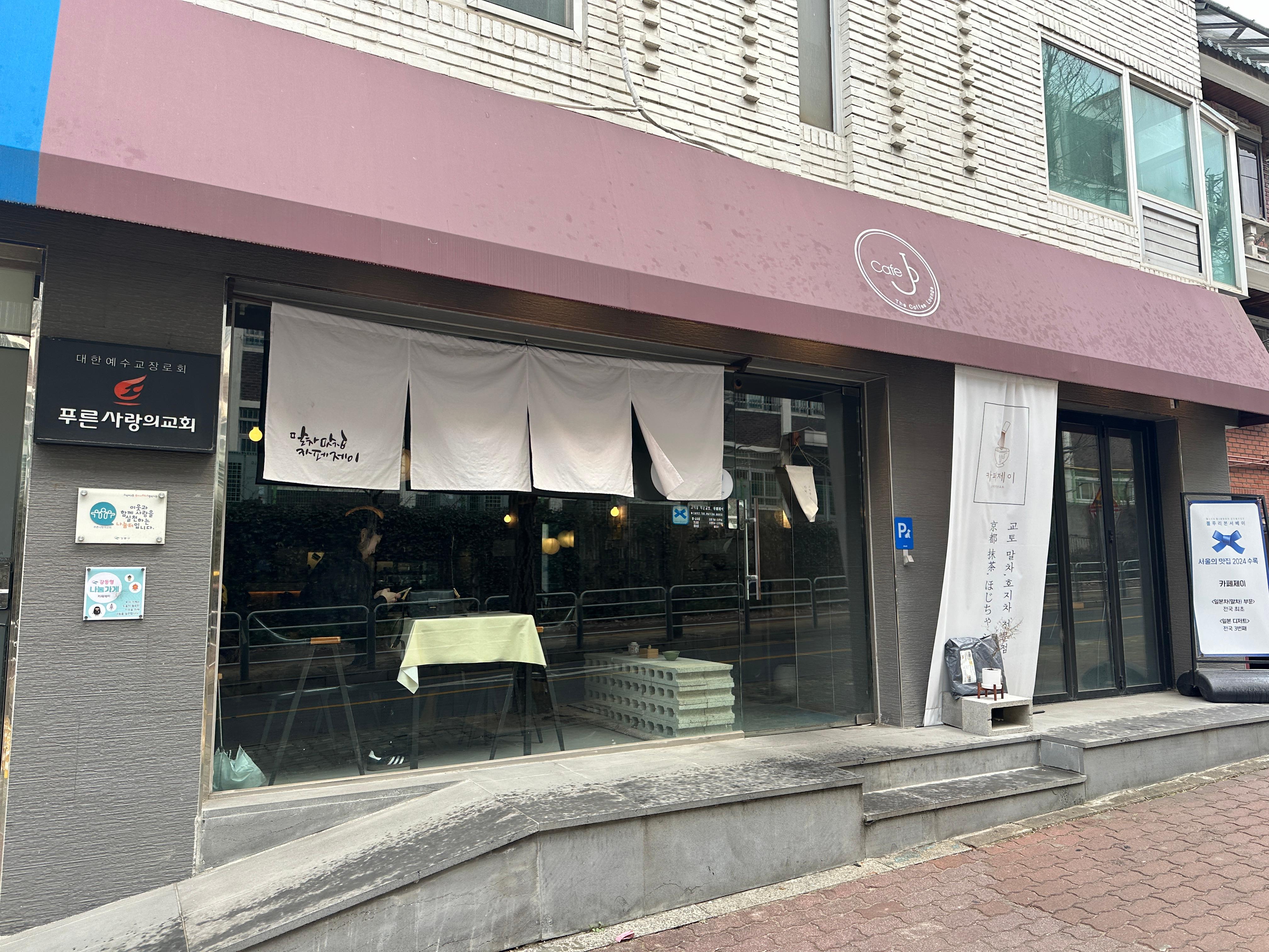 토요일 오픈 시간인 11시를 조금 넘어 각자 카페에 모였다. 카페제이는 베이지색 건물 1층에 위치해 있다. 문 위에는 팥색 천막이 쳐져있고 밖에 '교토 말차, 호지차 전문점'이라는 문구가 적힌 현수막과 블루리본 서베이 서울의 맛집 수록 홍보물이 놓여있었다.