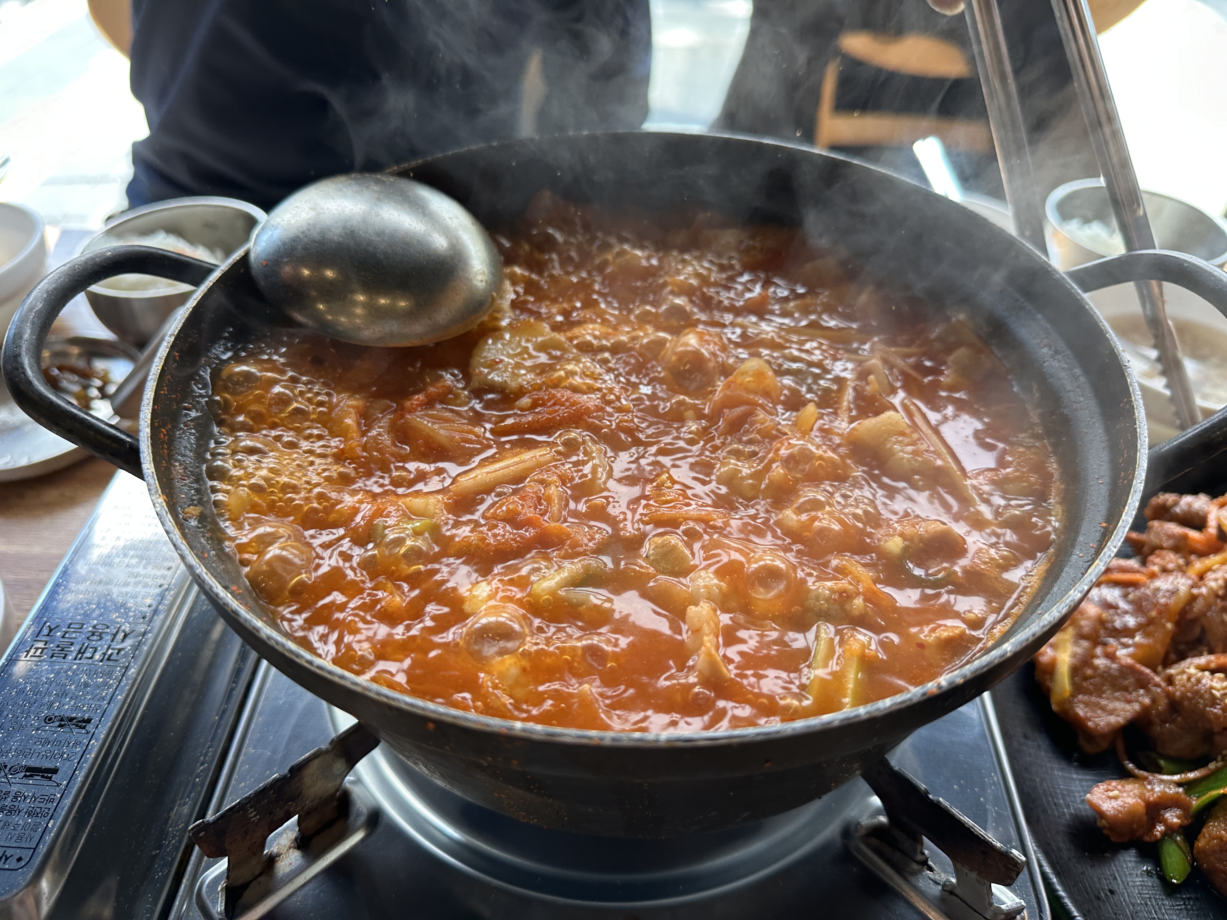 오늘 점심 메뉴는 김치찌개다. 다섯 명이 함께 먹어서 여러 메뉴를 주문해 나눠먹기로 했다. 식당의 메인 메뉴인 김치찌개와 추가로 제육볶음, 계란말이를 주문했다.