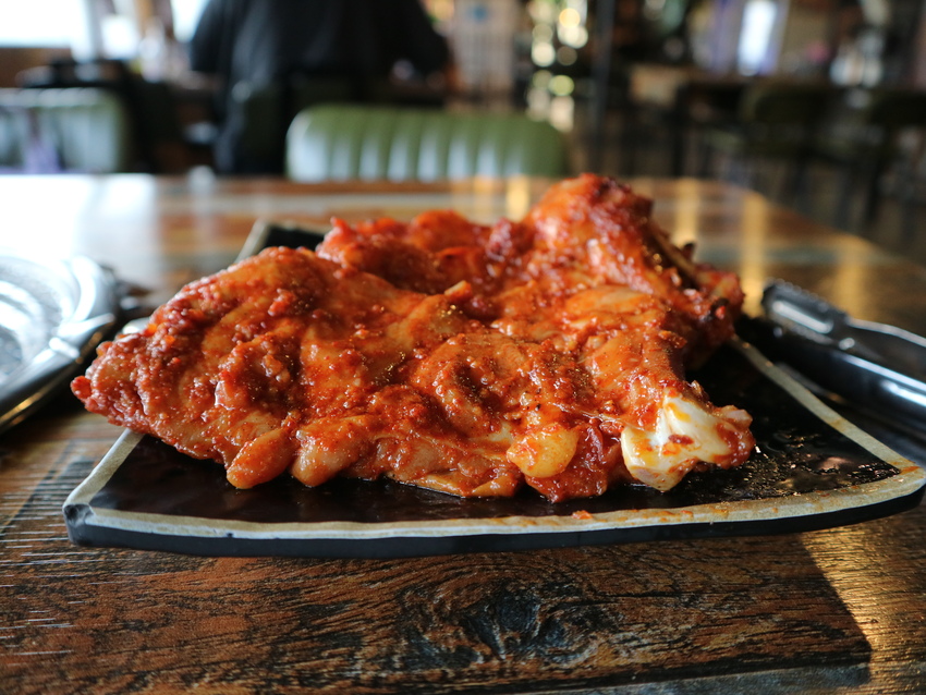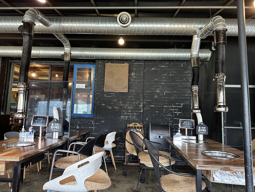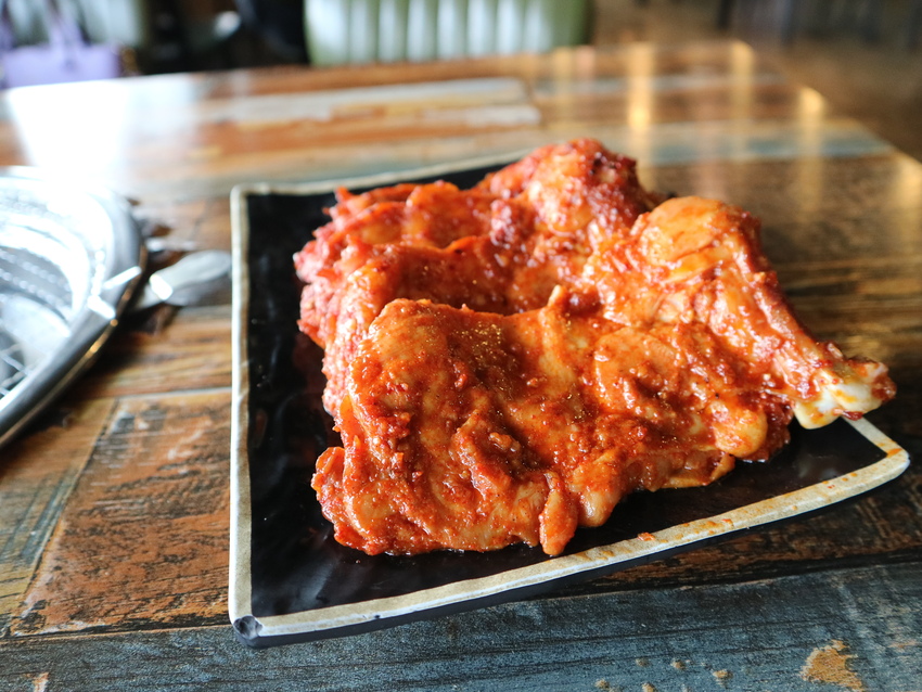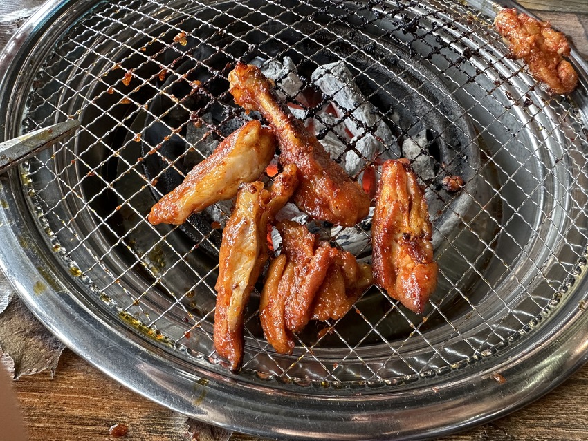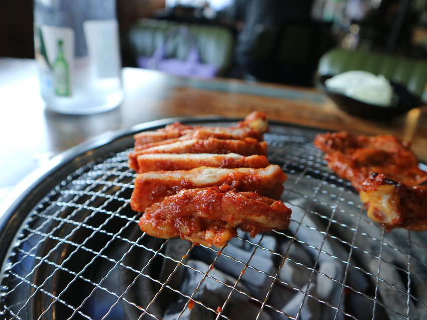 닭갈비는 1인분에 2 덩이씩 총 4 덩이가 나왔는데요. 빨갛게 양념된 생고기였어요. 가위로 잘라 숯불 위에 올려줍니다. 나란히 나란히 줄을 세우고 타지 않게 자주 뒤집어 주어야 해요. 고기가 익는 동안 셀프바에서 반찬과 동치미, 쌈을 가져왔습니다.