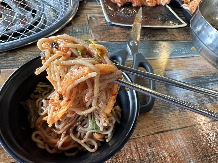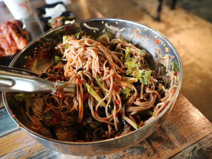 고기가 거의 익을 때쯤 막국수도 나왔는데요. 국물 없이 나오는데 여기에 동치미 국물을 부어서 비비면 잘 비벼지고 맛도 한결 시원해집니다. 잘 익은 닭갈비를 상추에도 싸 먹고 막국수에도 올려 먹었어요. 잘 구워진 닭갈비는 보들보들하고 고소했습니다. 양도 적당해서 배부르게 먹었어요.