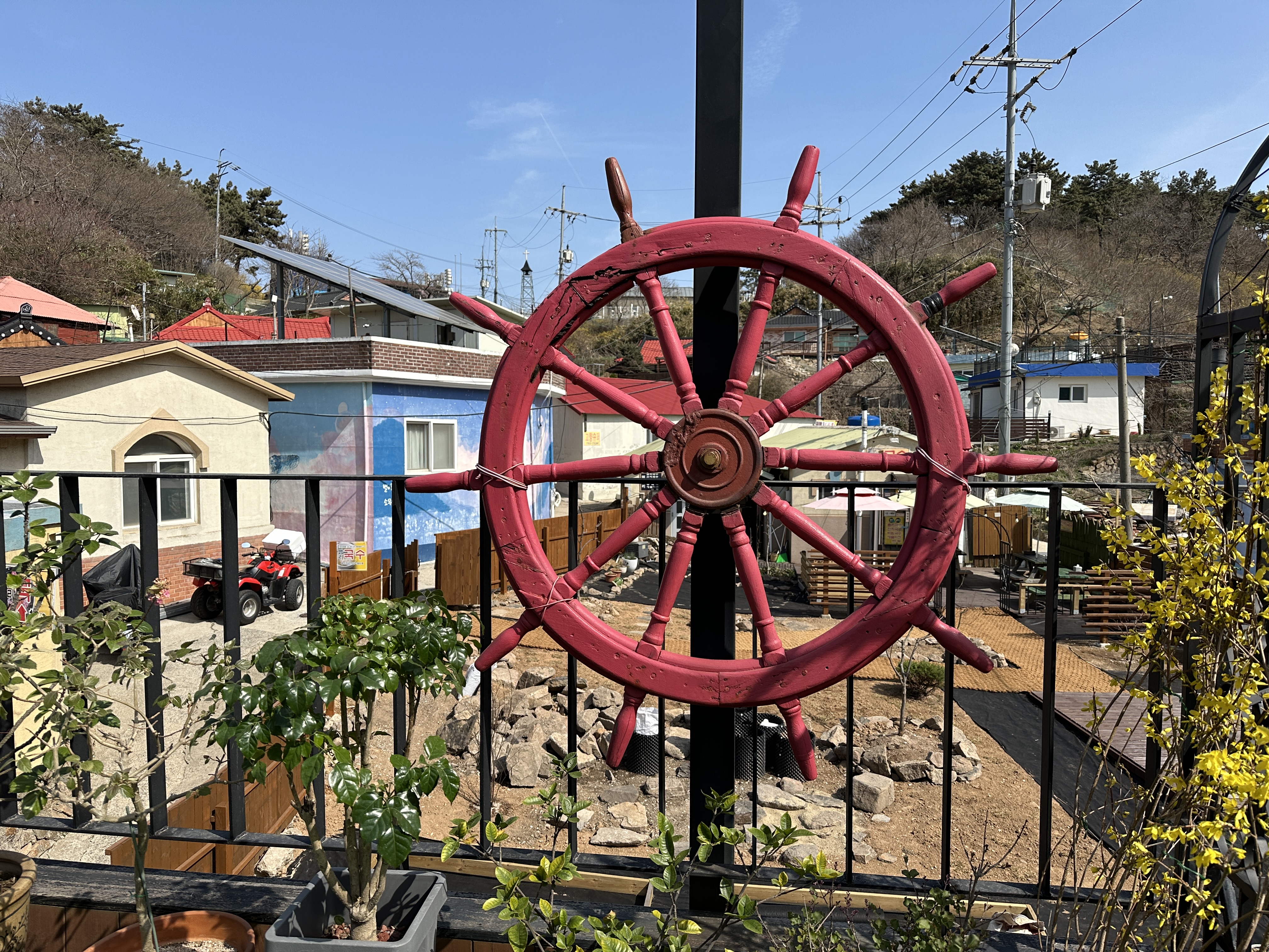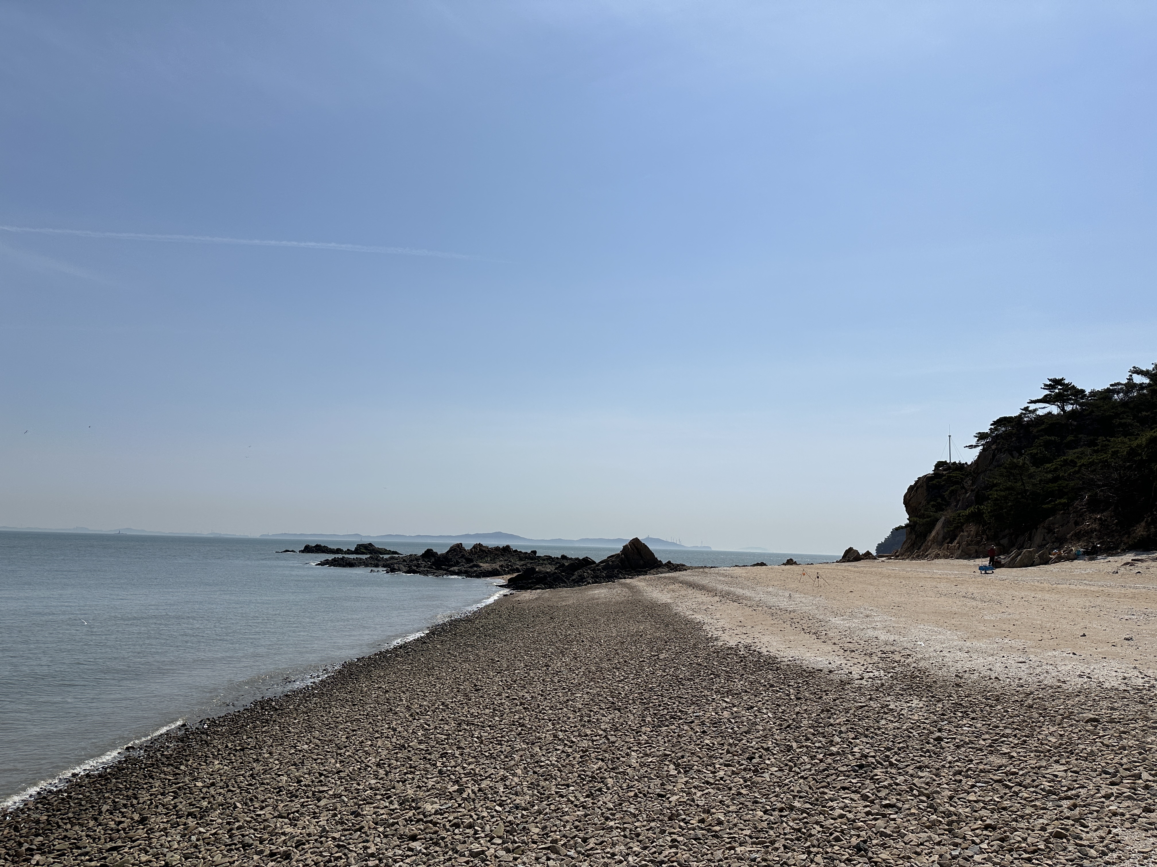 무의바다누리길 5구간은 해변이었다. 검은 자갈로 이루어져 있는몽여해변과 마을로 이루어져 있었다. 5구간은 2구간의 정 반대편이다. 섬의 가운데 언덕을 중심으로 무의바다누리길 2구간과 5구간 두 마을이 이어져있었다. 2구간에서 5구간 몽여해변에 산길로 걸으면 20분 정도 소요되지만 두 마을을 잇는 가운데 지름길로 걸으면 5분이면 될 듯했다. 5구간은 2구간과 마찬가지로 주택이 몇 채 있는 마을이다. 이곳에는 여행자센터와 공중화장실, 카페, 식당이 있었다.