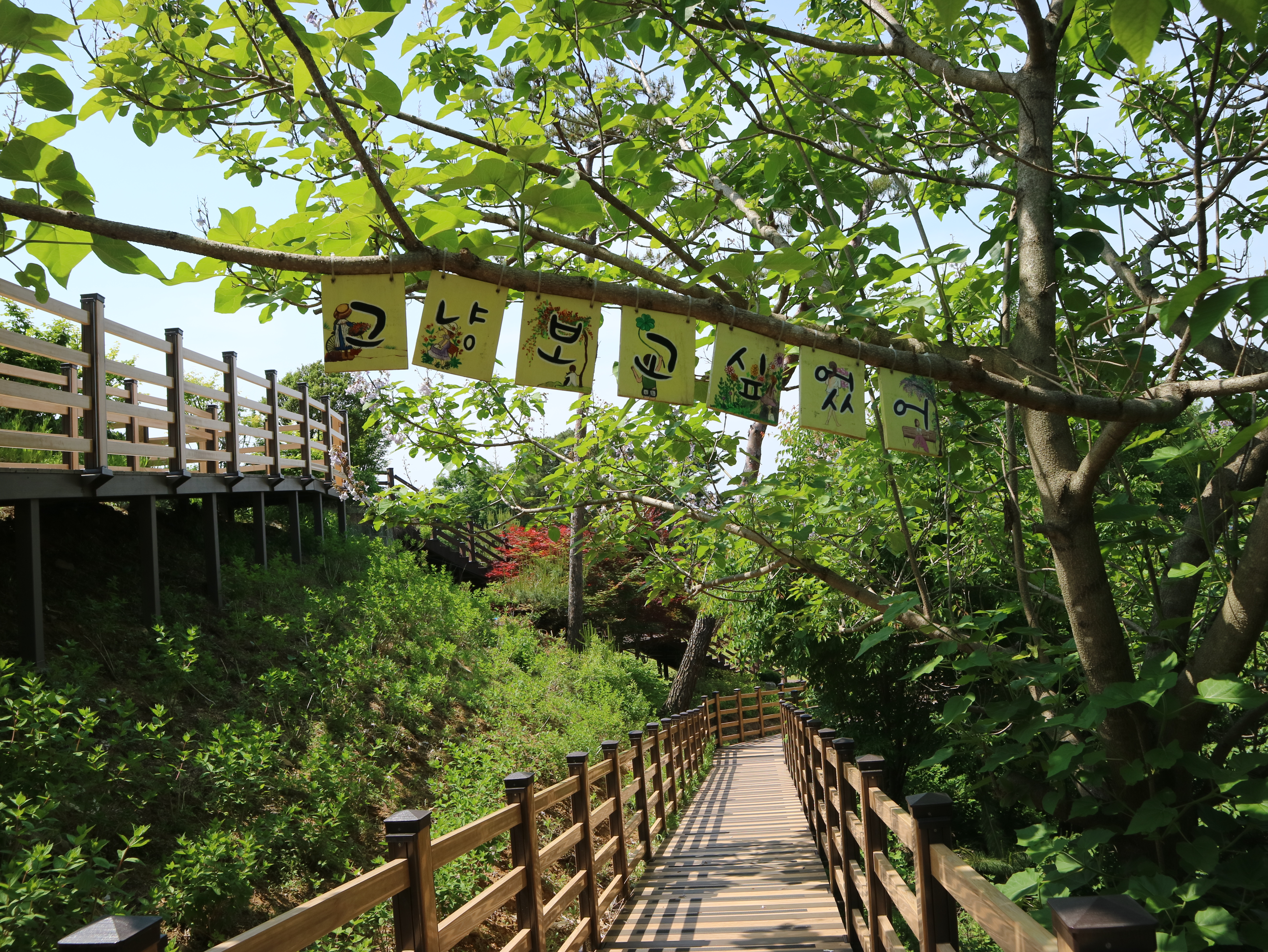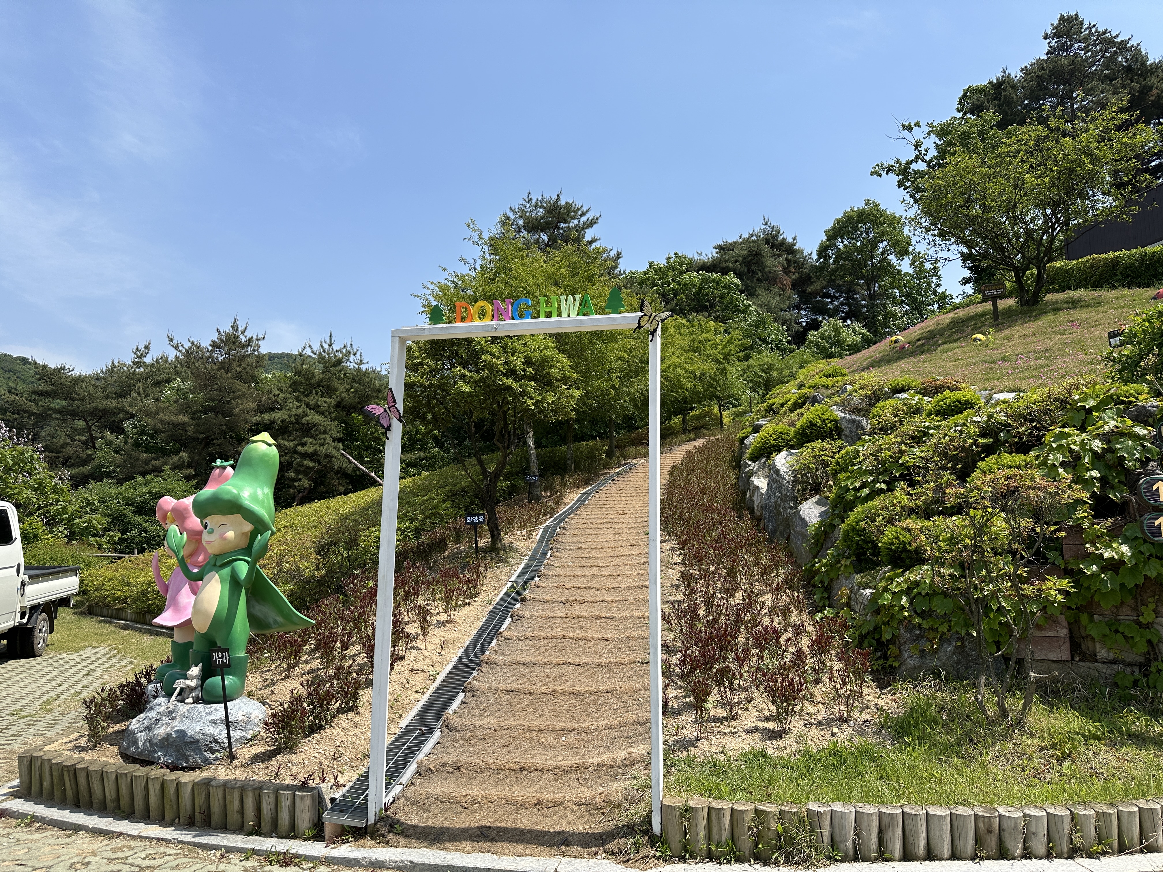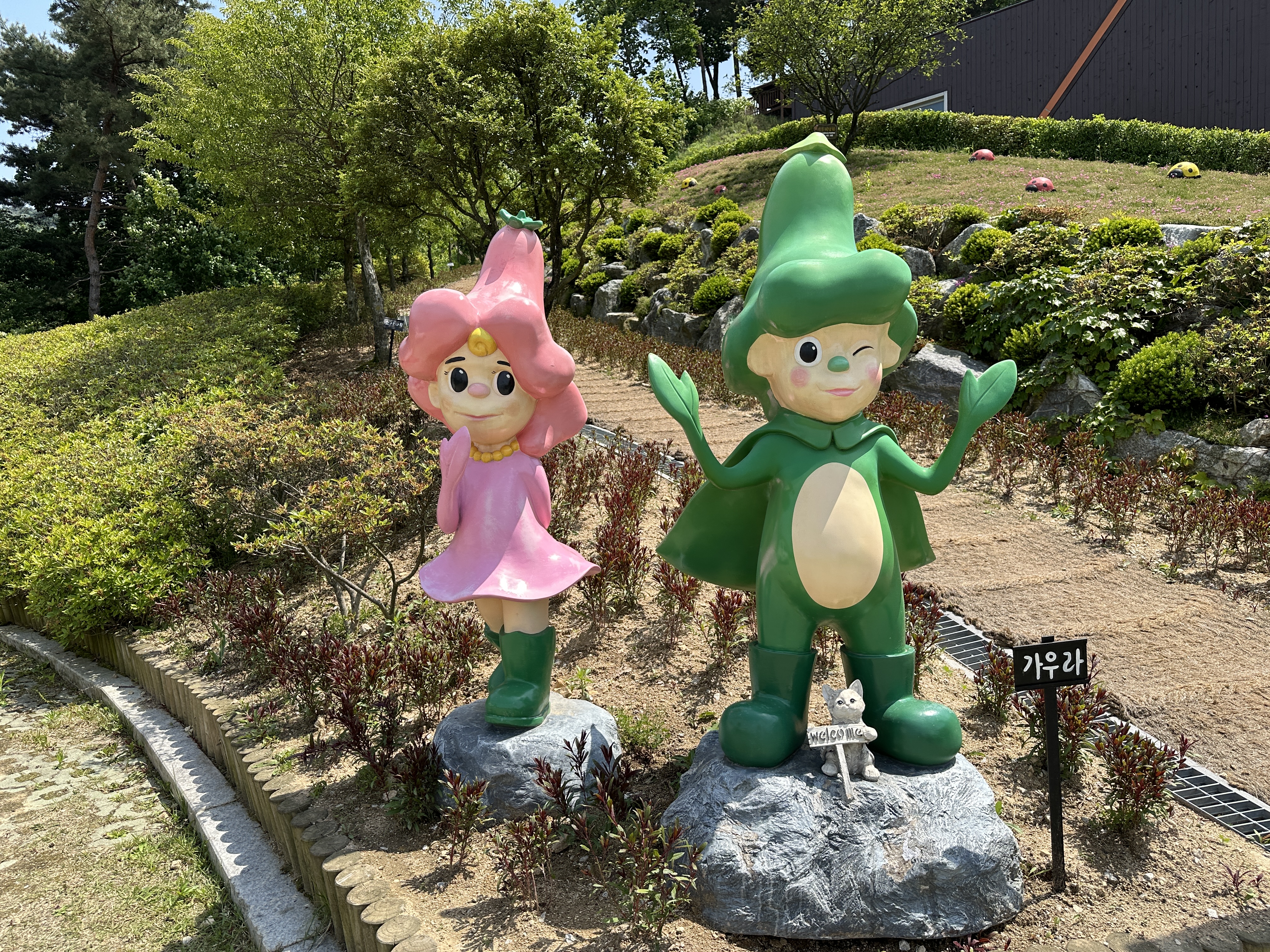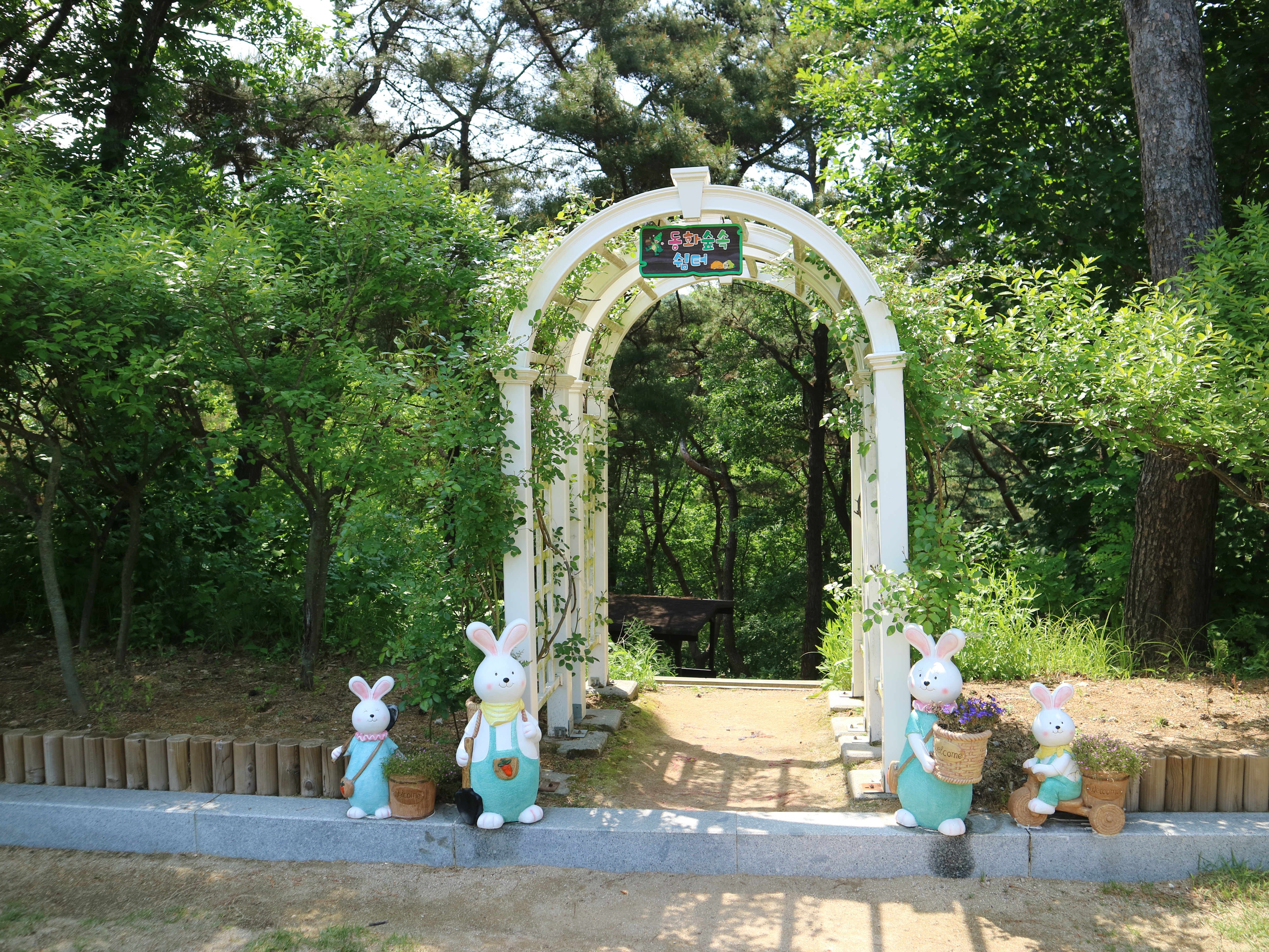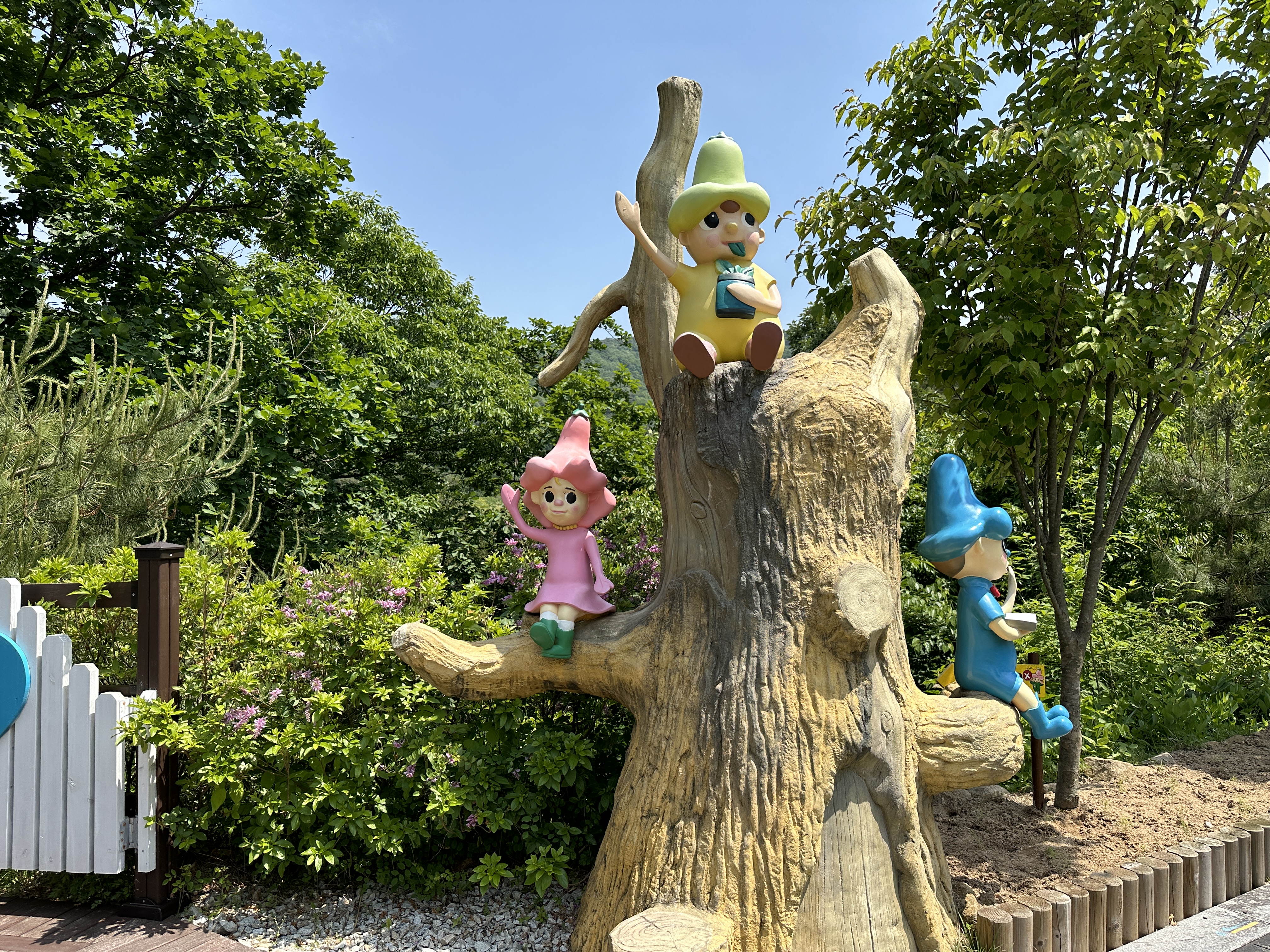수목원으로 올라가는 길은 나무데크와 미끄럼 방지 깔개가 깔려있어 걷기 편했다. 나무들이 한창 울창하게 잎을 피워 쨍한 햇빛을 막아주었다. 공기도 맑고 선선해 발걸음이 가벼웠다. 수목원 메인 건물인 방문자 센터까지 올라가는 데는 15분 정도 걸렸다. 숲 곳곳에 쉬어갈 수 있는 벤치가 비치되어 있다. 동화마을 수목원이라는 이름에 걸맞게 여러 동화 속 주인공들이 숲과 수목원 내에 장식되어 있다. 아이들과 함께 방문하면 내가 좋아하는 동화 속 주인공 찾기 놀이를 할 수도 있겠다.
