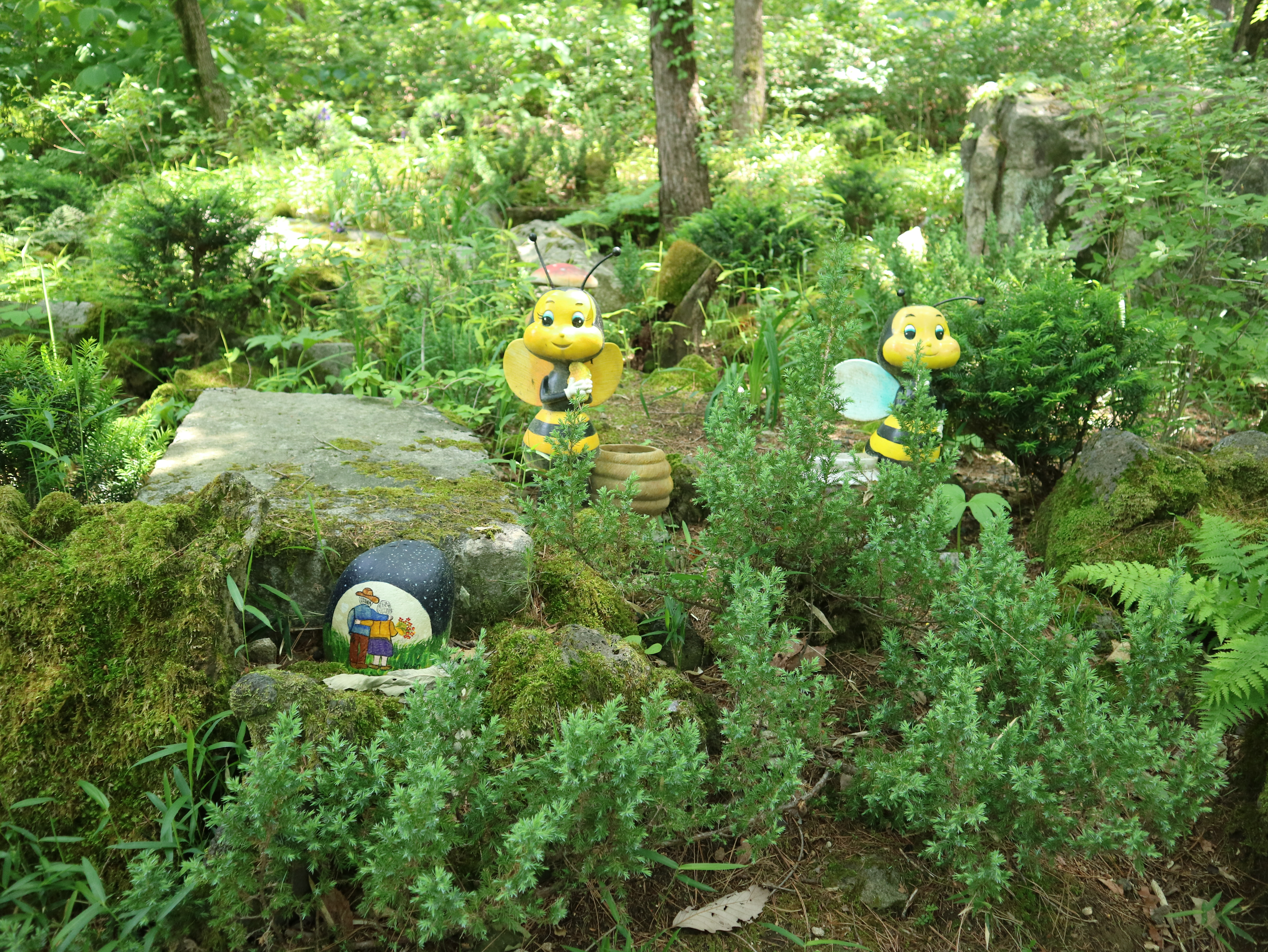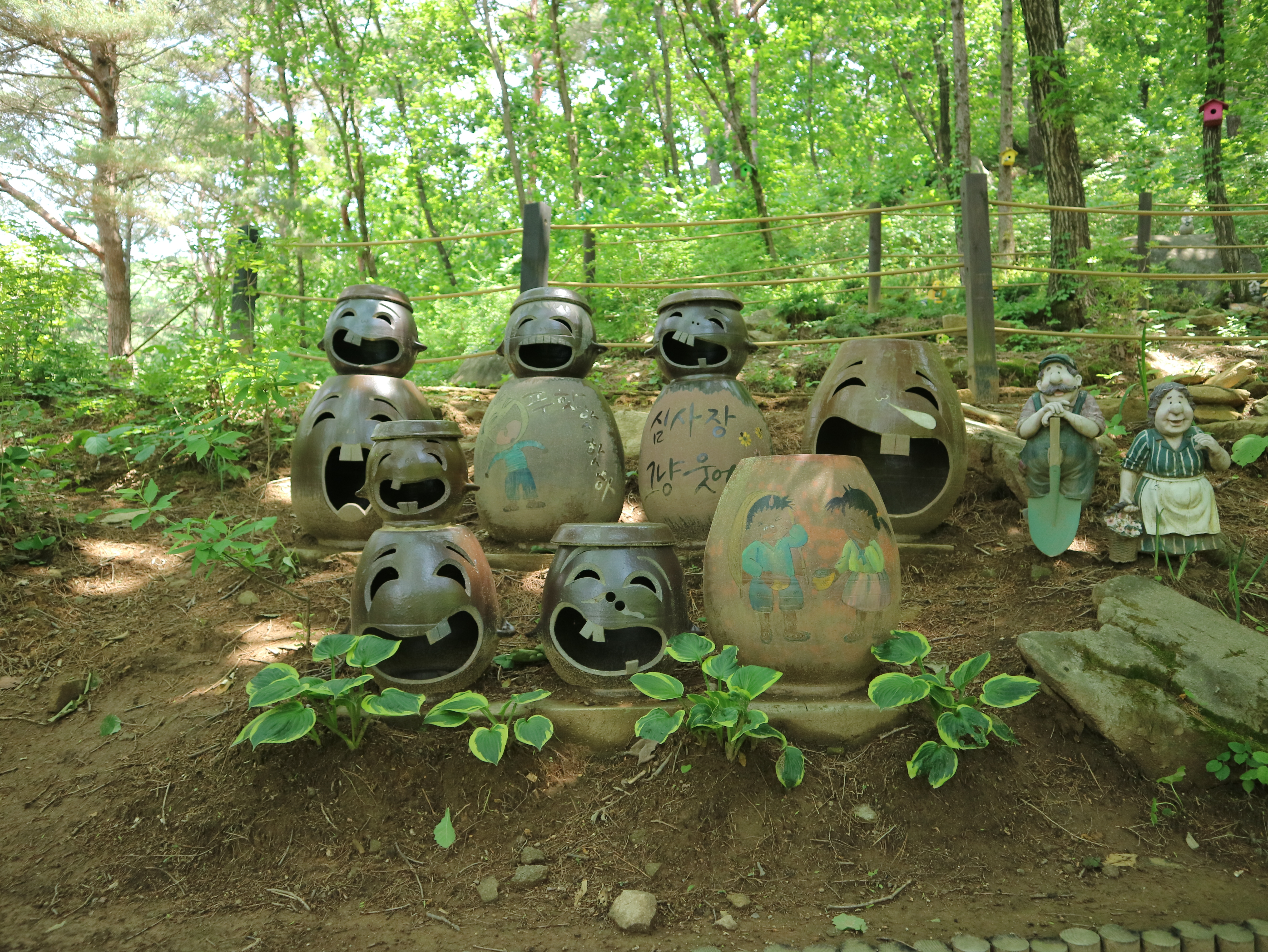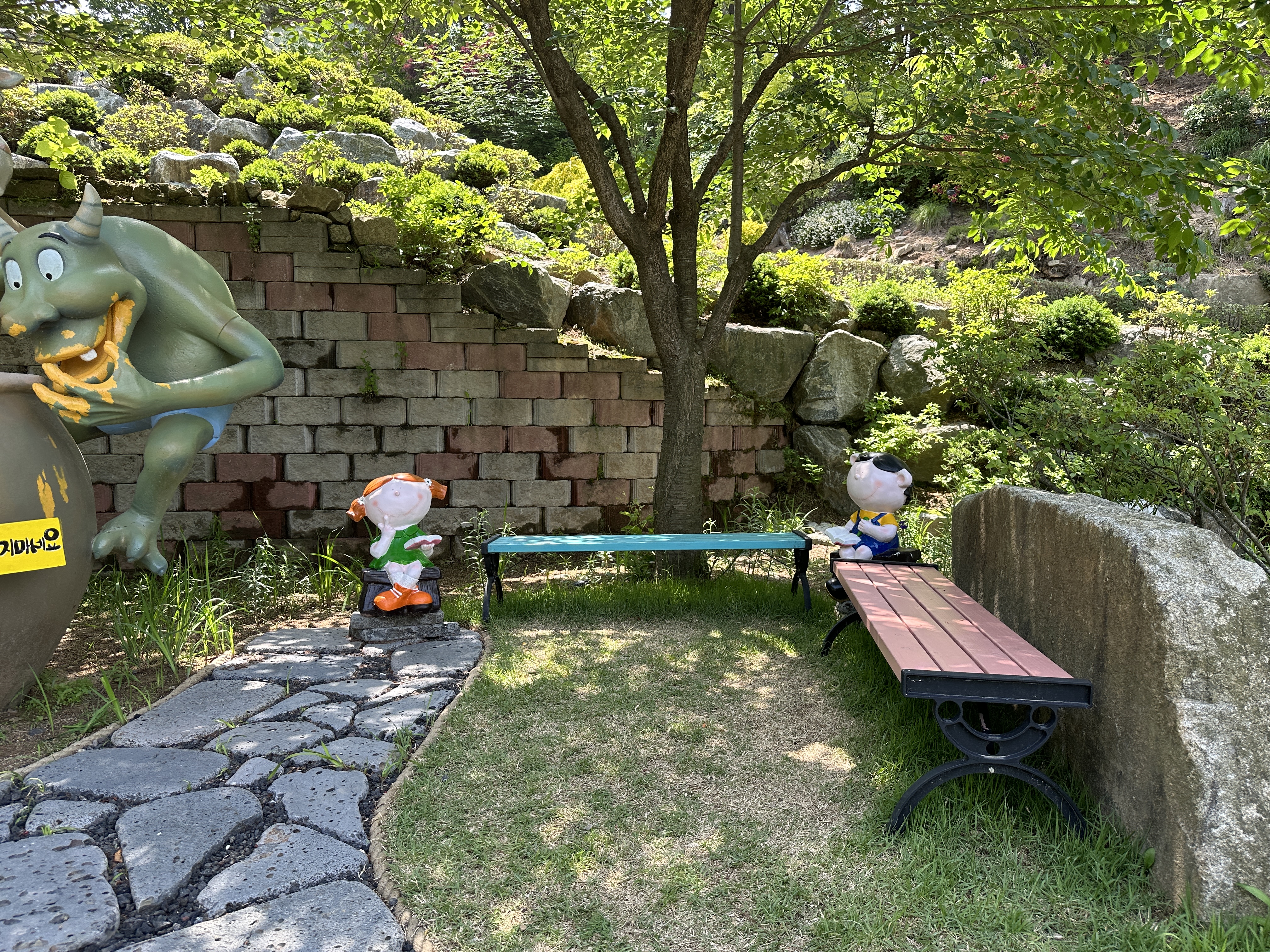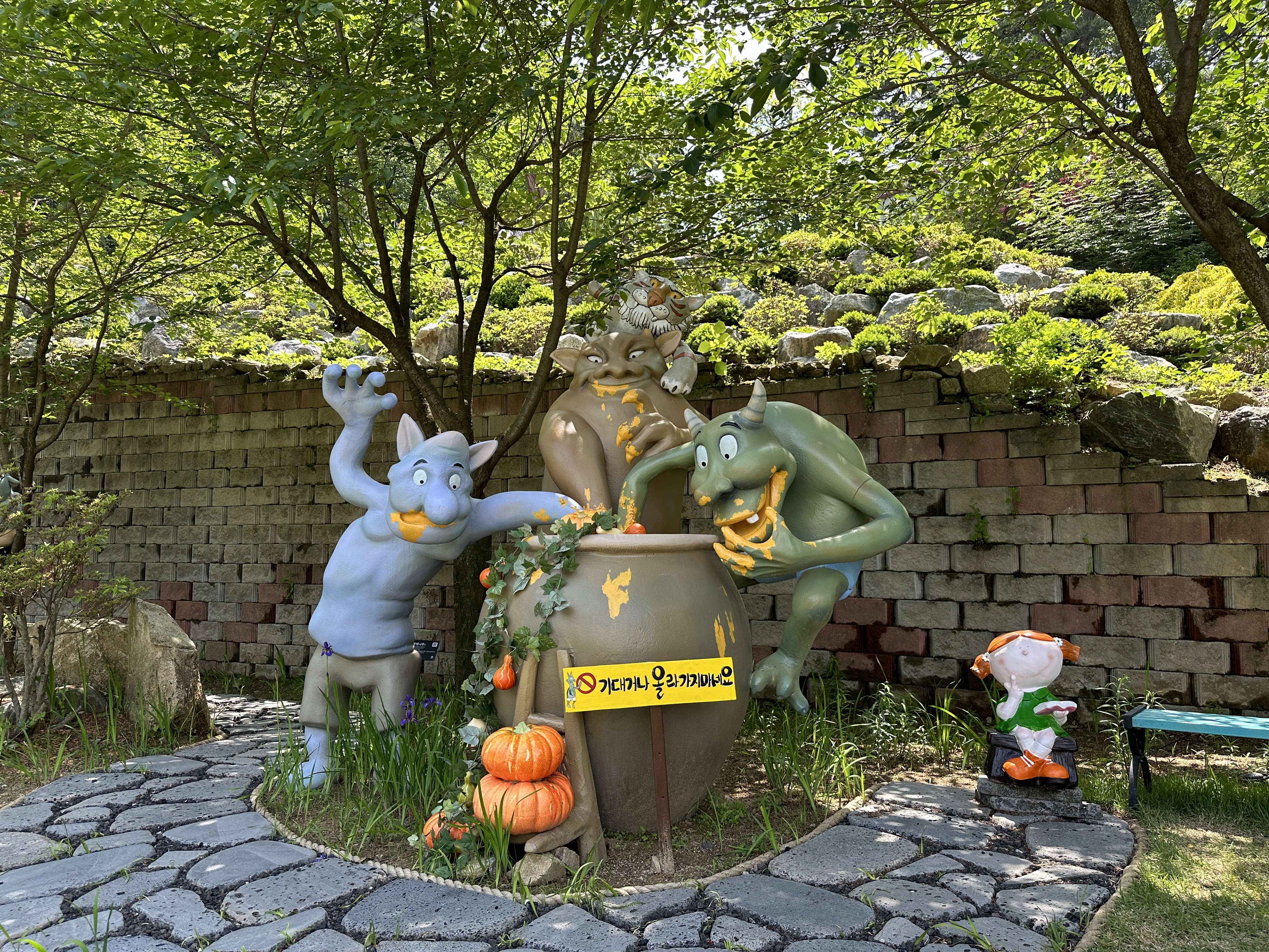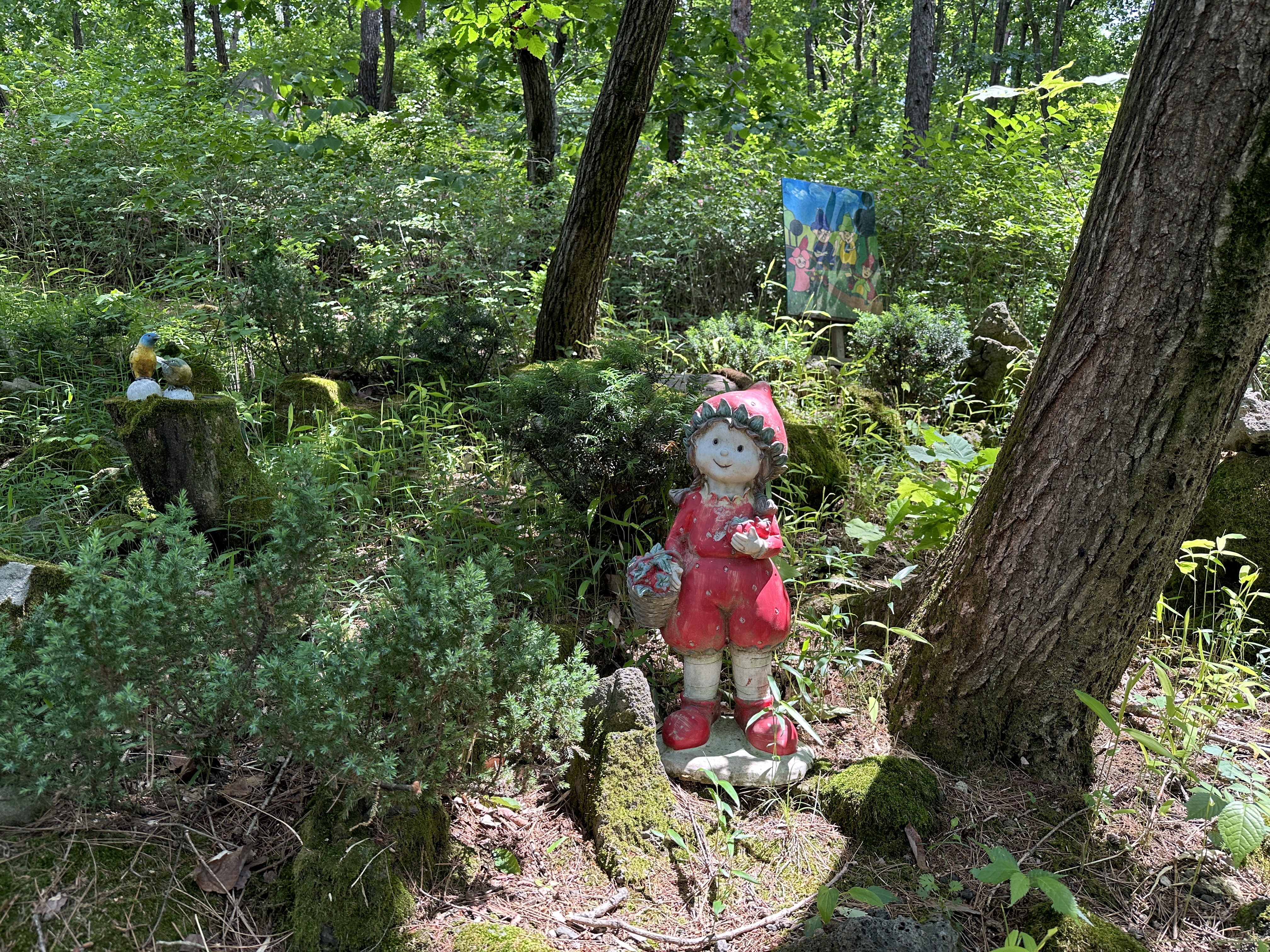 수목원으로 올라가는 길은 나무데크와 미끄럼 방지 깔개가 깔려있어 걷기 편했다. 나무들이 한창 울창하게 잎을 피워 쨍한 햇빛을 막아주었다. 공기도 맑고 선선해 발걸음이 가벼웠다. 수목원 메인 건물인 방문자 센터까지 올라가는 데는 15분 정도 걸렸다. 숲 곳곳에 쉬어갈 수 있는 벤치가 비치되어 있다. 동화마을 수목원이라는 이름에 걸맞게 여러 동화 속 주인공들이 숲과 수목원 내에 장식되어 있다. 아이들과 함께 방문하면 내가 좋아하는 동화 속 주인공 찾기 놀이를 할 수도 있겠다.