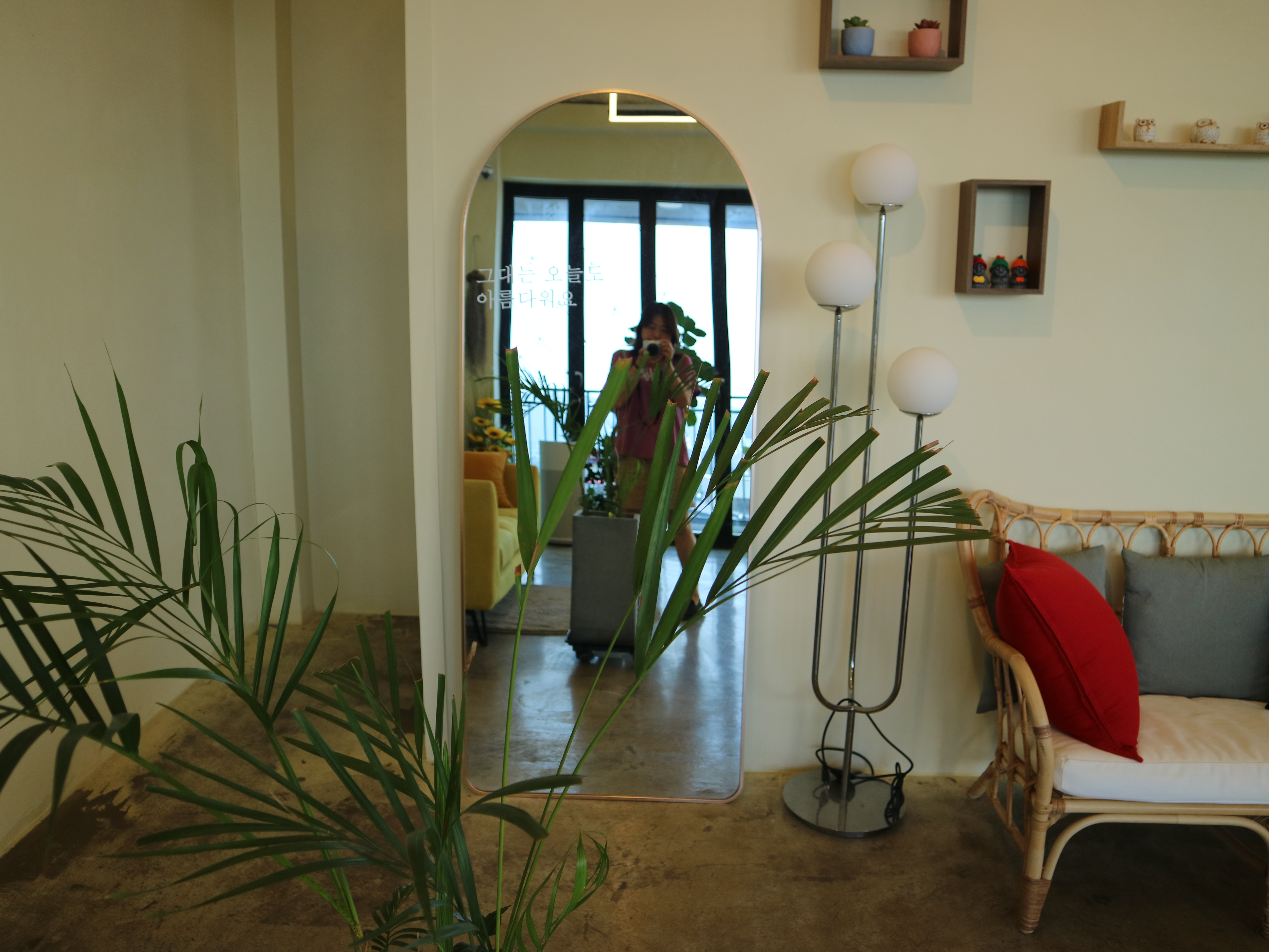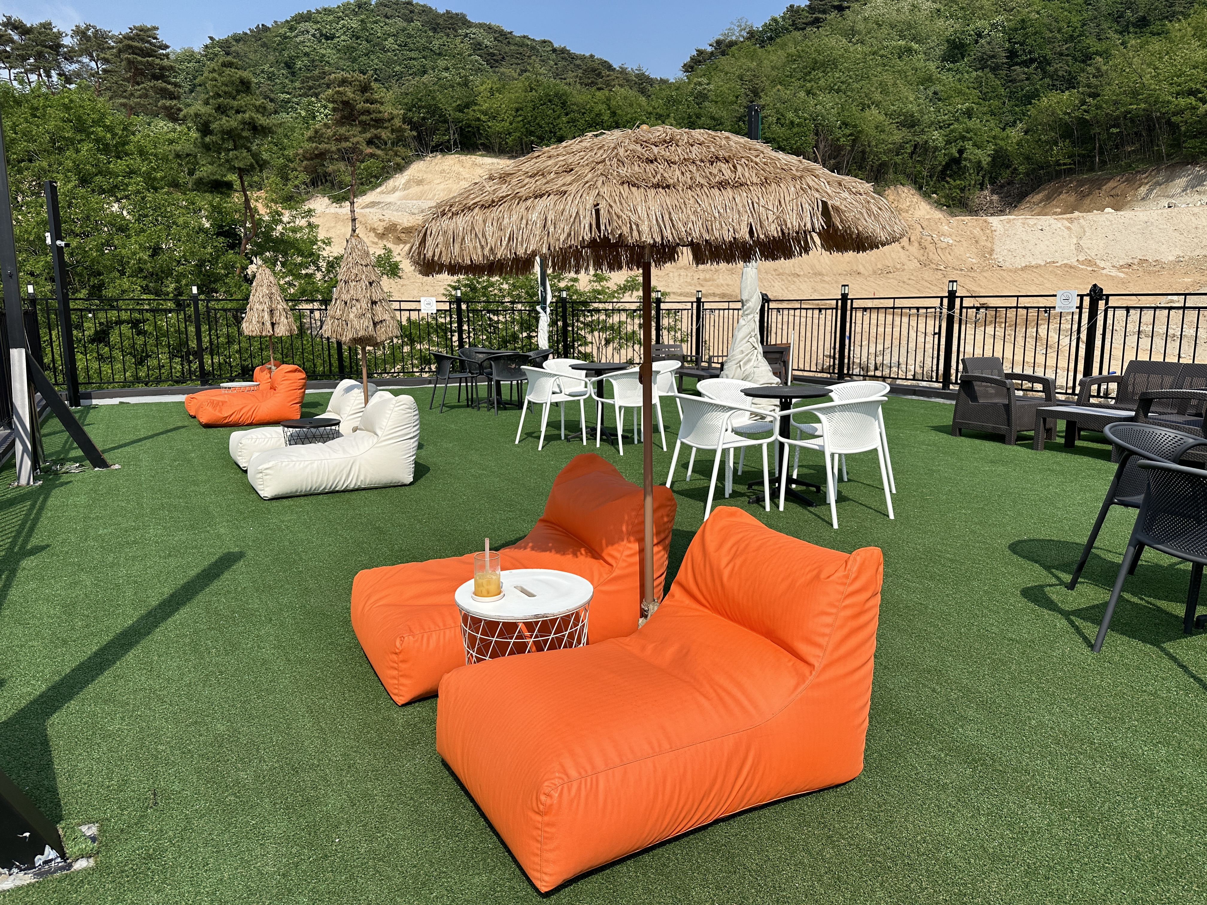 카페 실내에 좀 앉아있다가 루프탑으로 다시 올라갔다. 바닥에 깔린 초록 잔디와 주황색 소파, 푸른 하늘이 선명하게 대비되었다. 밀짚 소재의 파라솔은 햇빛을 가리기에 충분했다. 가만히 누워서 하늘을 바라보는 기분이 좋았다. 주문한 오렌지에이드는 상큼했다.