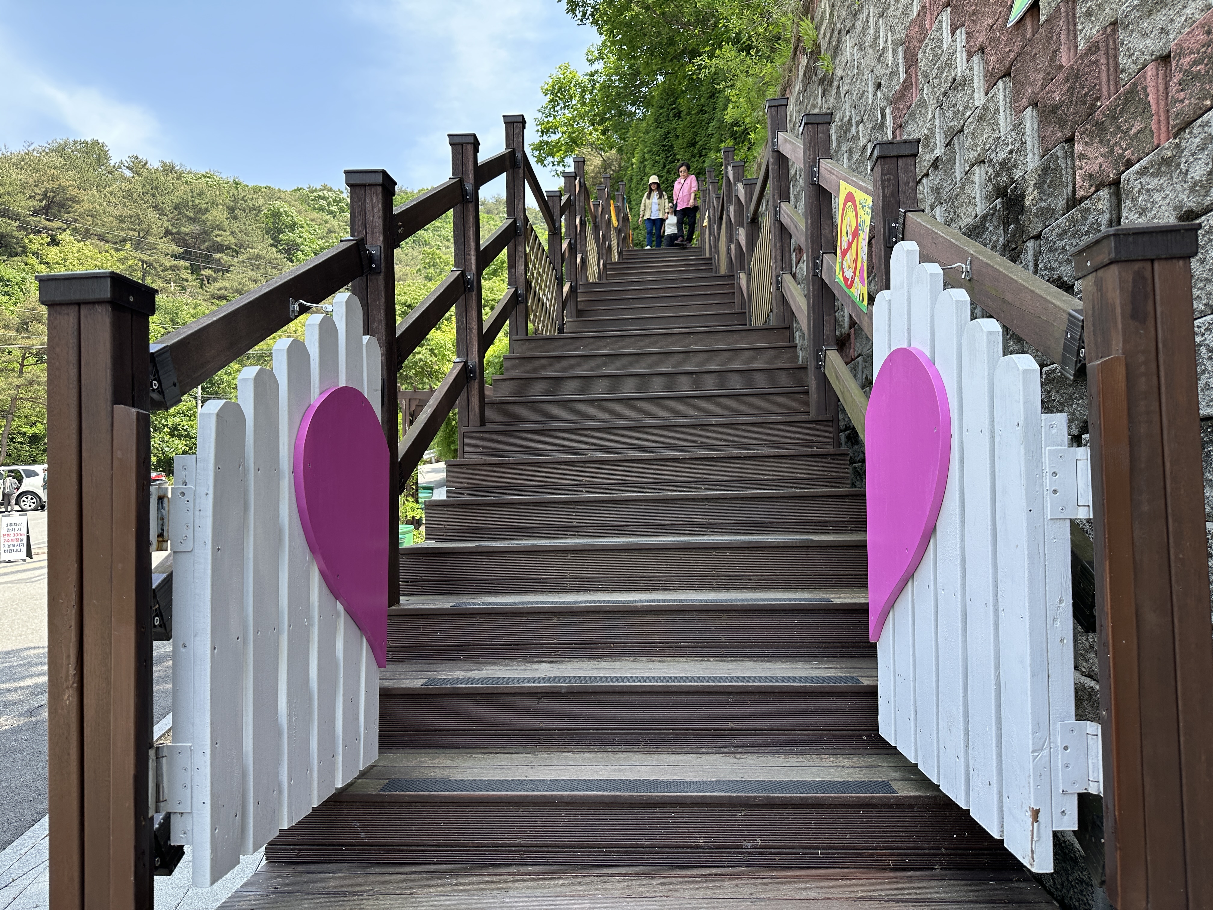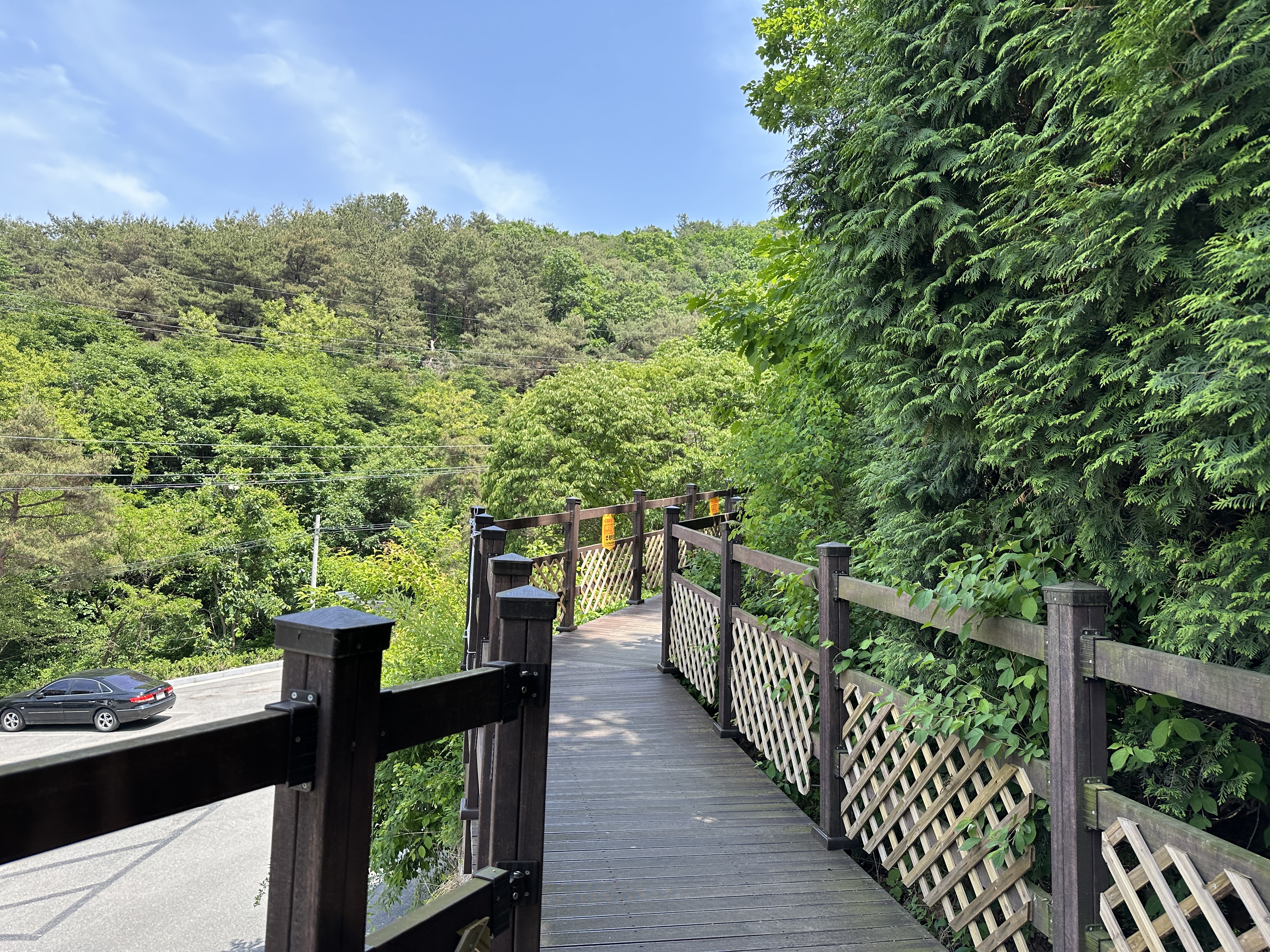 주차장 앞 수목원 입구라고 적힌 곳에는 나무 데크 계단이 있었다. 솔직히 얼마나 올라가야 수목원이 나오는지, 수목원 가는 길이 맞기는 한 지 가늠할 수 없어 갈까 말까 고민되었다. 마침 내려오는 아주머니들이 계셔서 “여기가 수목원 가는 길 맞아요?” 하고 물었더니 “여기로 올라가면 수목원 나와요”라는 대답이 돌아왔다.