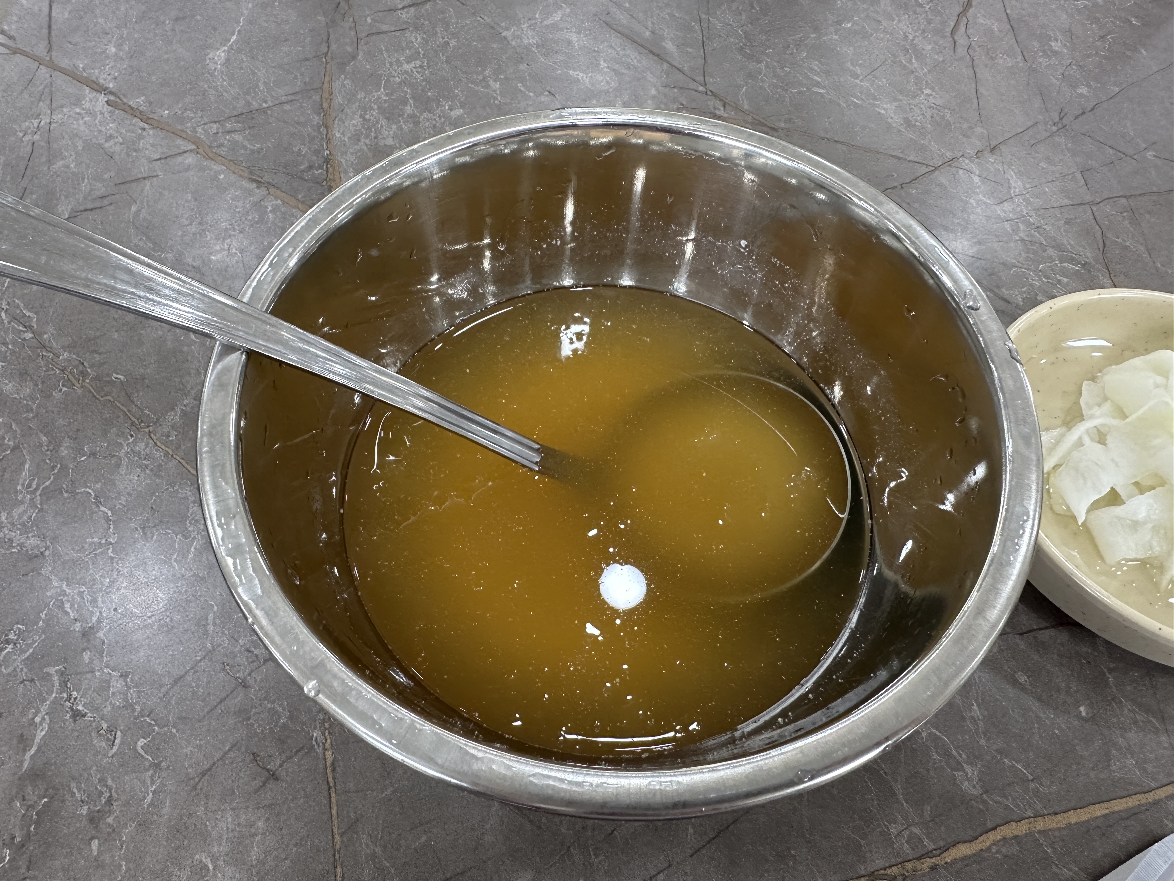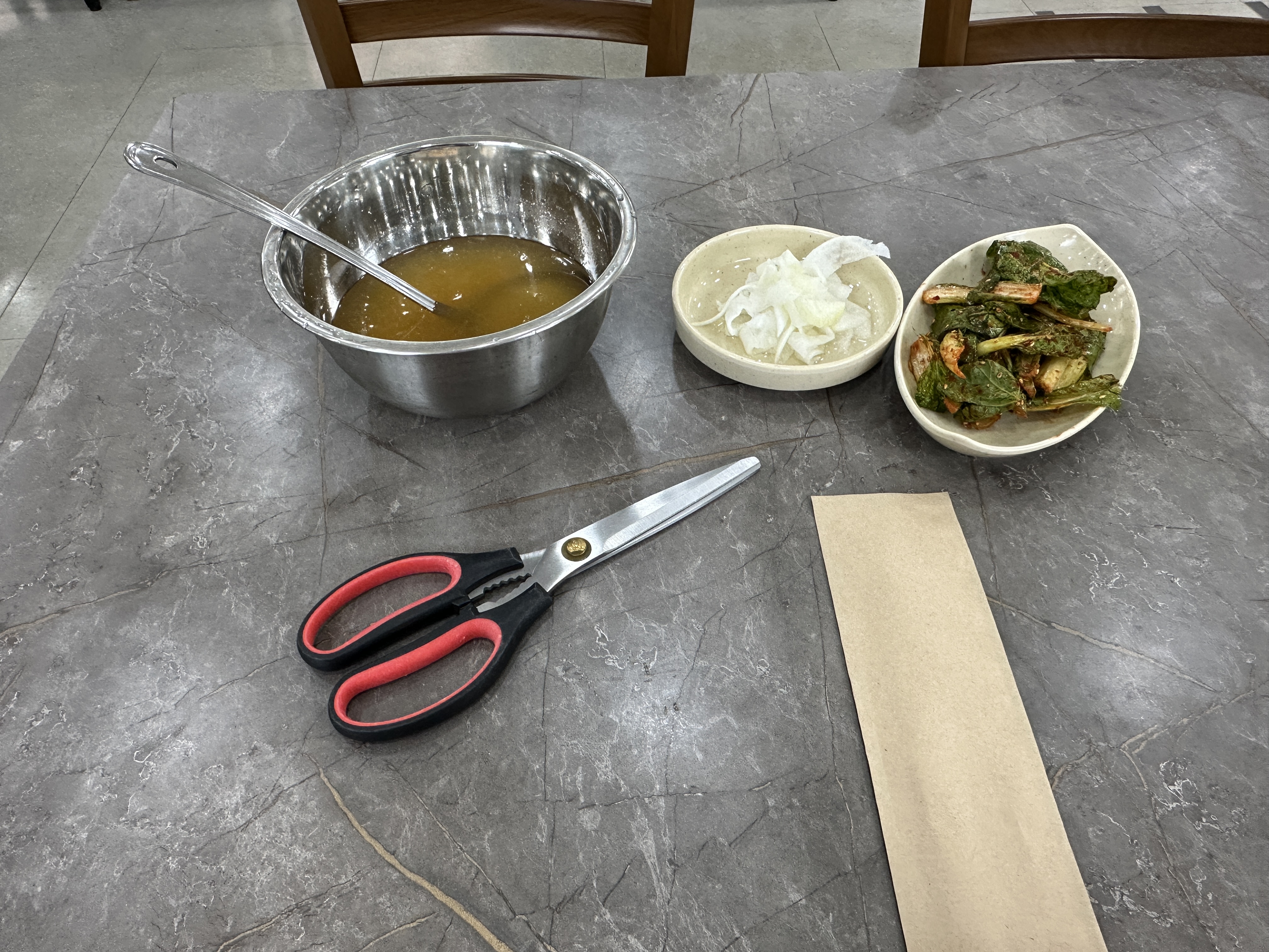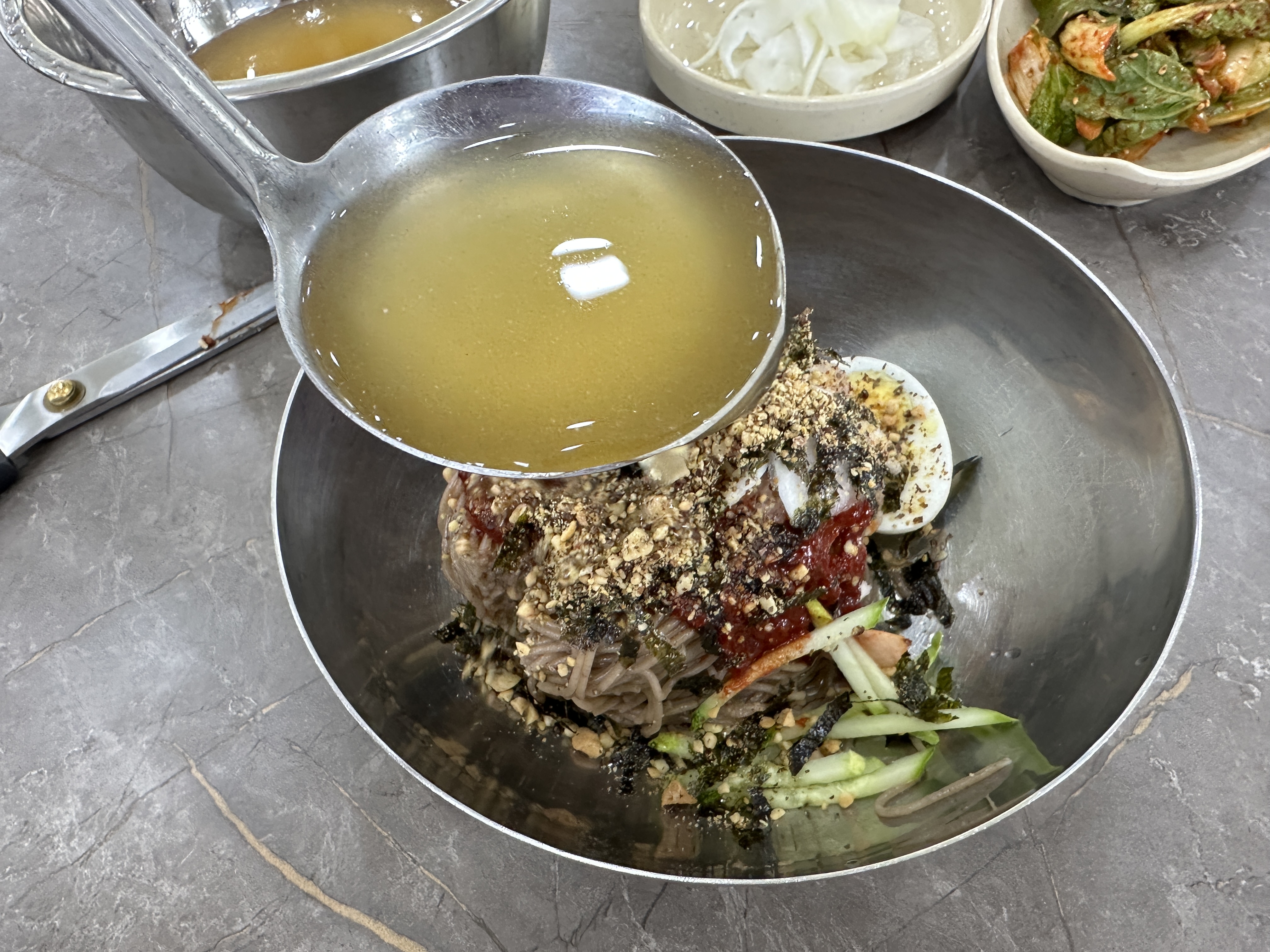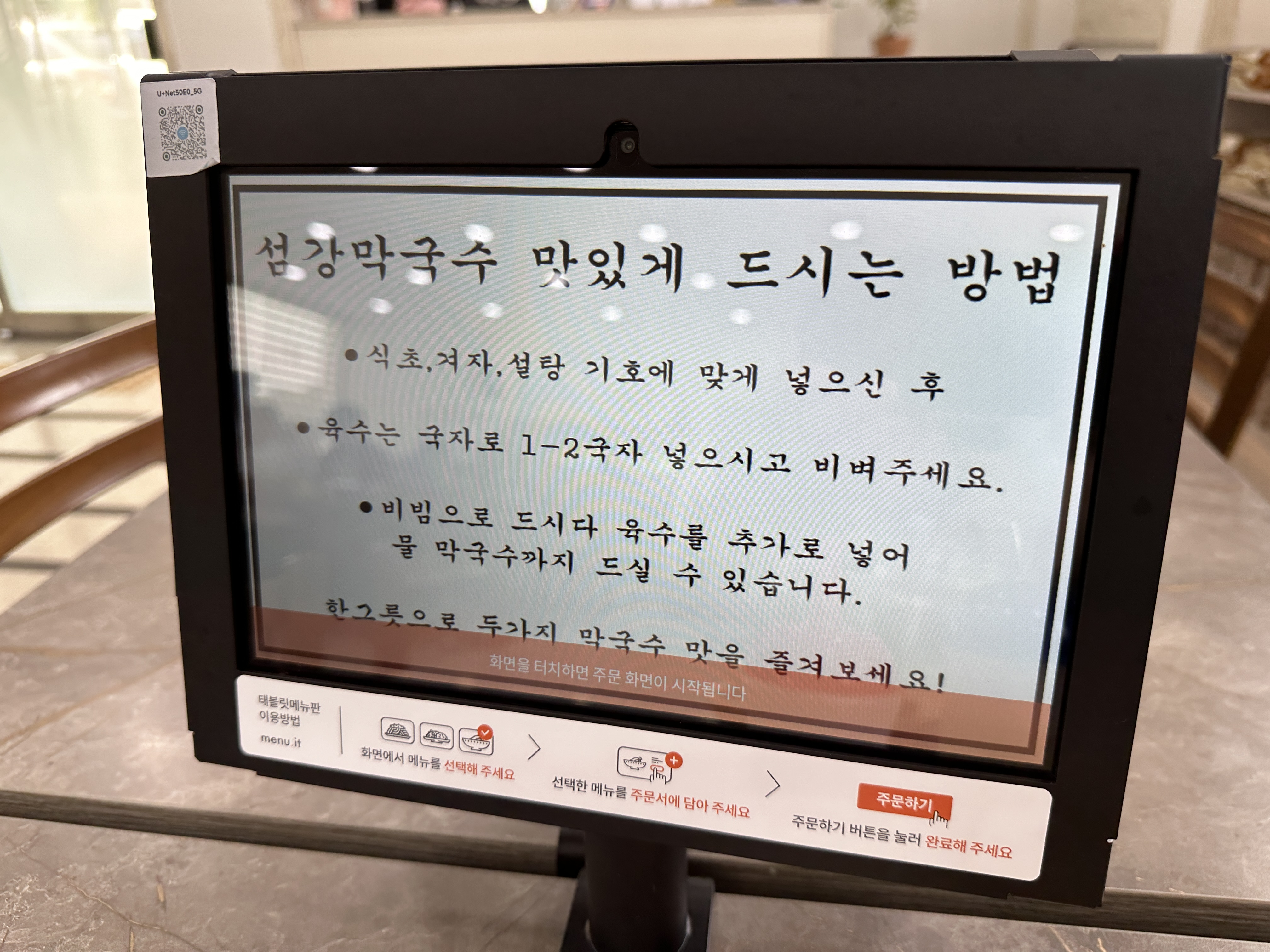 키오스크 화면에 막국수를 맛있게 먹는 법이 나온다. 먼저 식초와 겨자, 설탕을 기호에 맞게 넣는다. 육수를 국자로 1~2국자 넣고 비빈다. 비빔으로 먹다가 육수를 추가로 넣어 물 막국수로 먹는다.