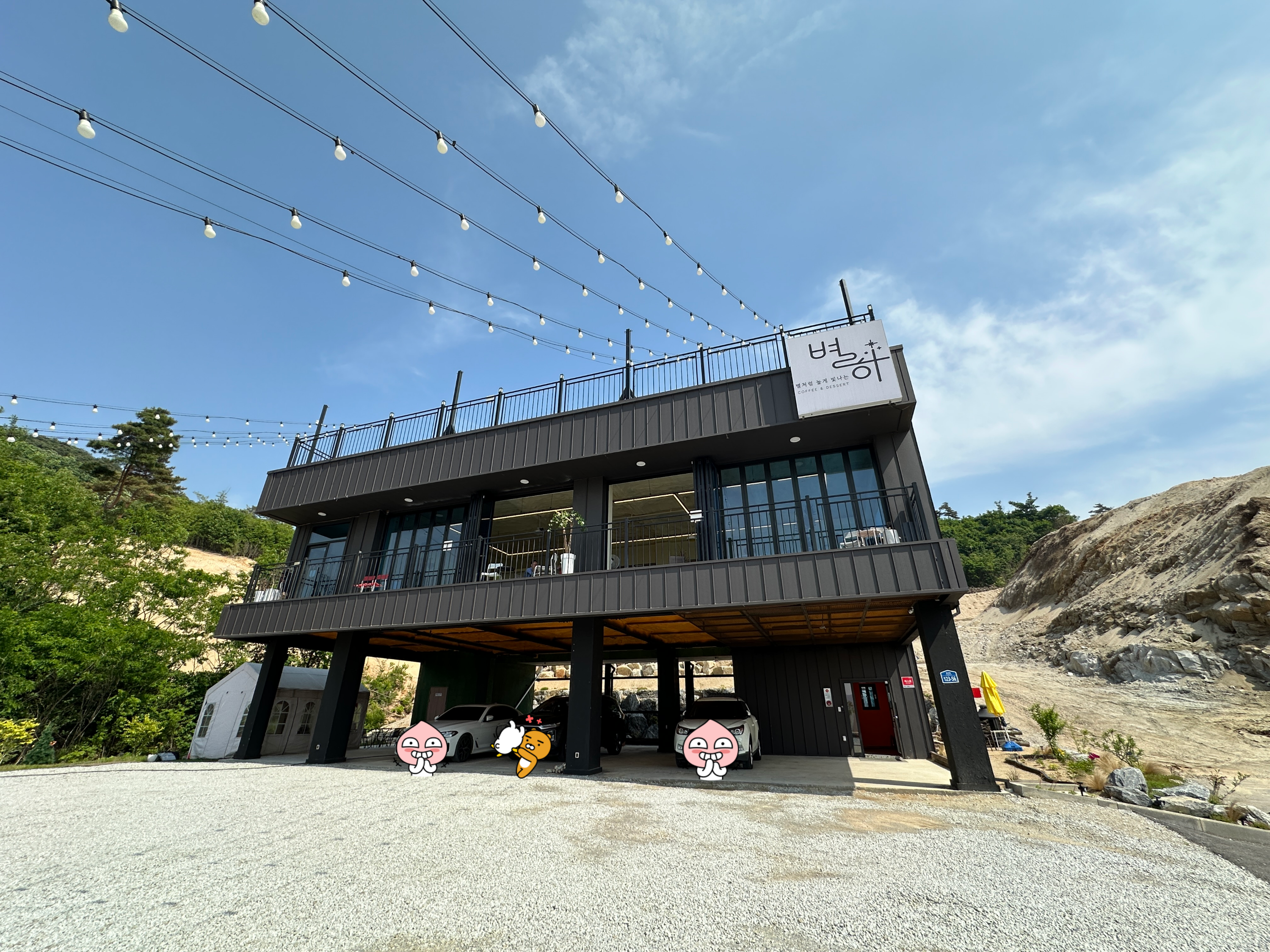 수목원을 나와 카페로 향했다. 차로 7분 거리에 있는 ‘별하’라는 이름의 카페였다. 별하는 명봉산 호수마을 꼭대기에 위치한 카페다. 카페 건물이 마을 꼭대기에 있고 3층에 루프탑이 있어서 서울로 돌아가기 전 잠깐 쉬었다 가기 좋은 곳이었다.