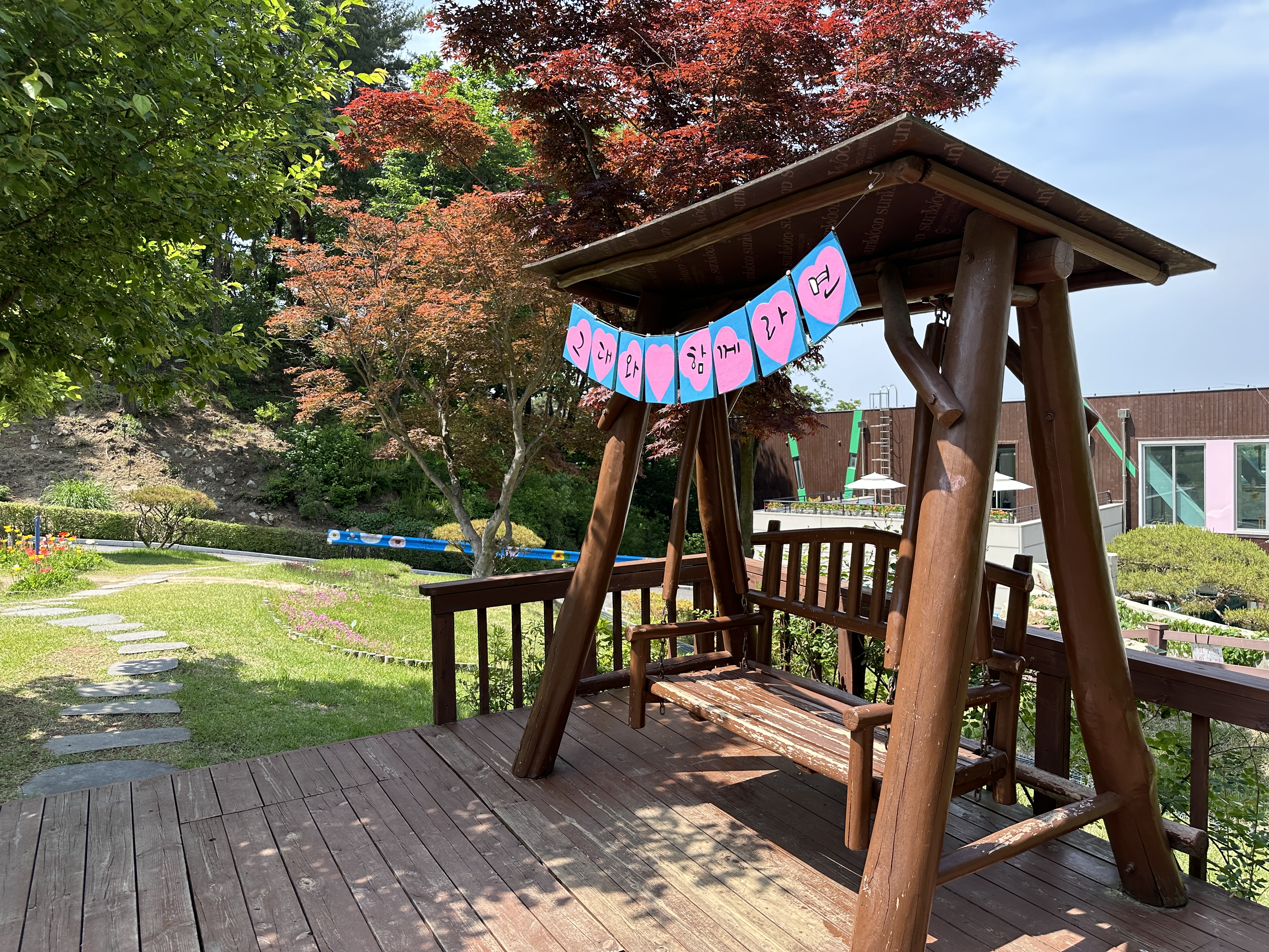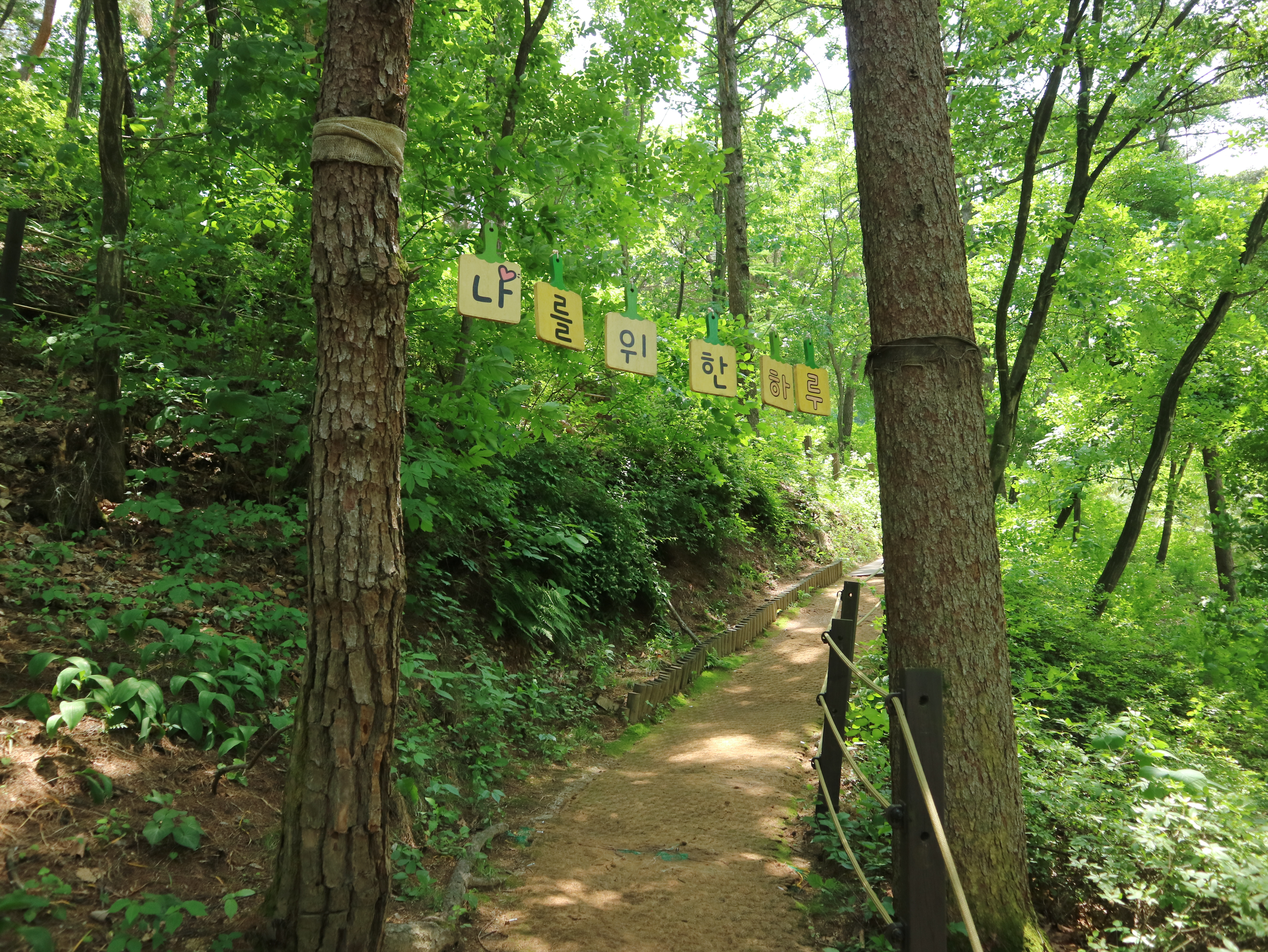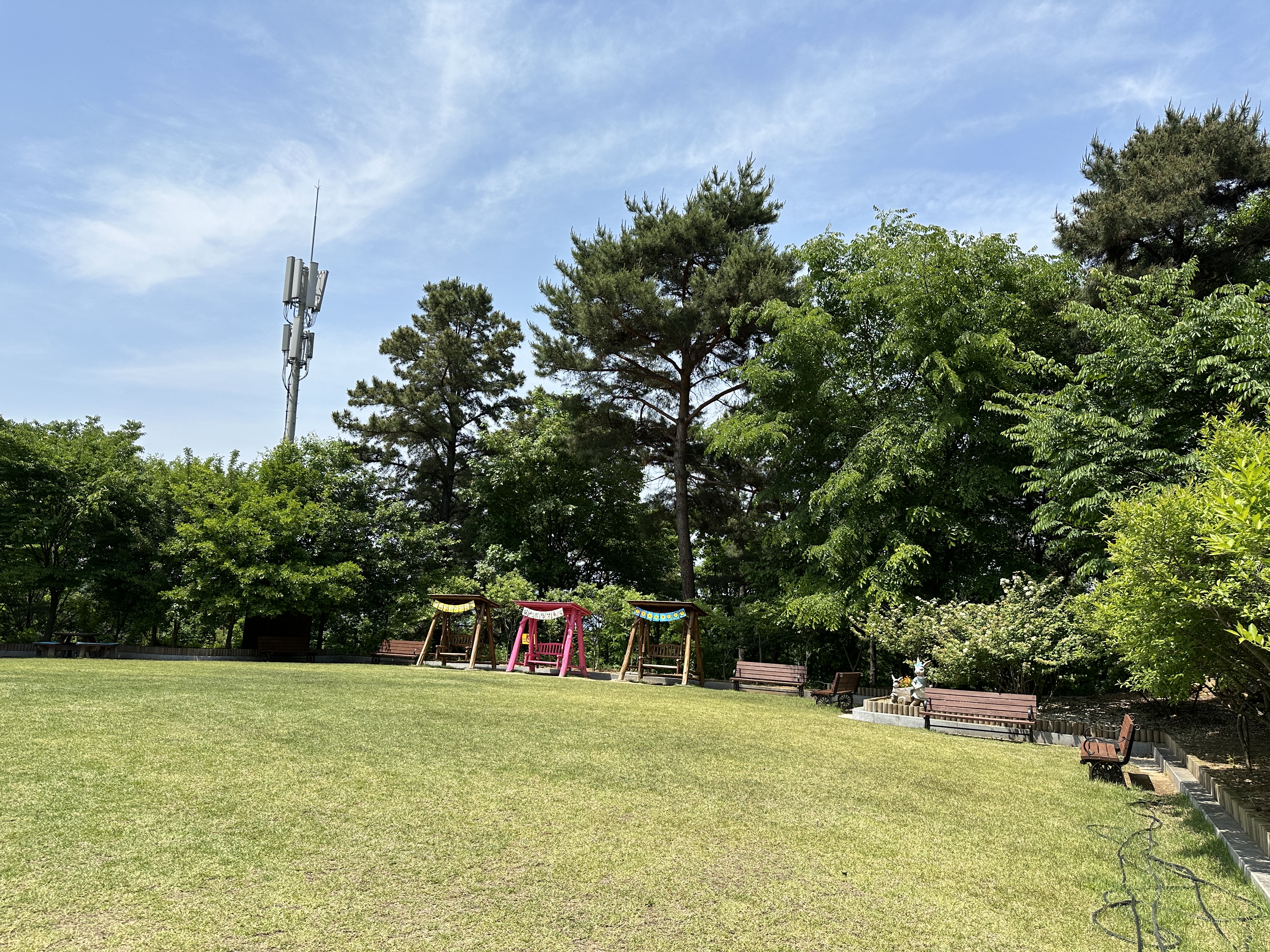 숲길을 벗어나 수목원 입구에 들어서자 꽤 넓은 잔디마당이 펼쳐졌다. 잔디마당 가장자리에는 벤치와 나무그네가 있었다. 마음껏 뛰어놀고 쉴 수 있는 공간이었다. 휴식을 뒤로 미루고 일단 더 올라가 보기로 했다. 진짜 수목원이 있는 곳으로.
