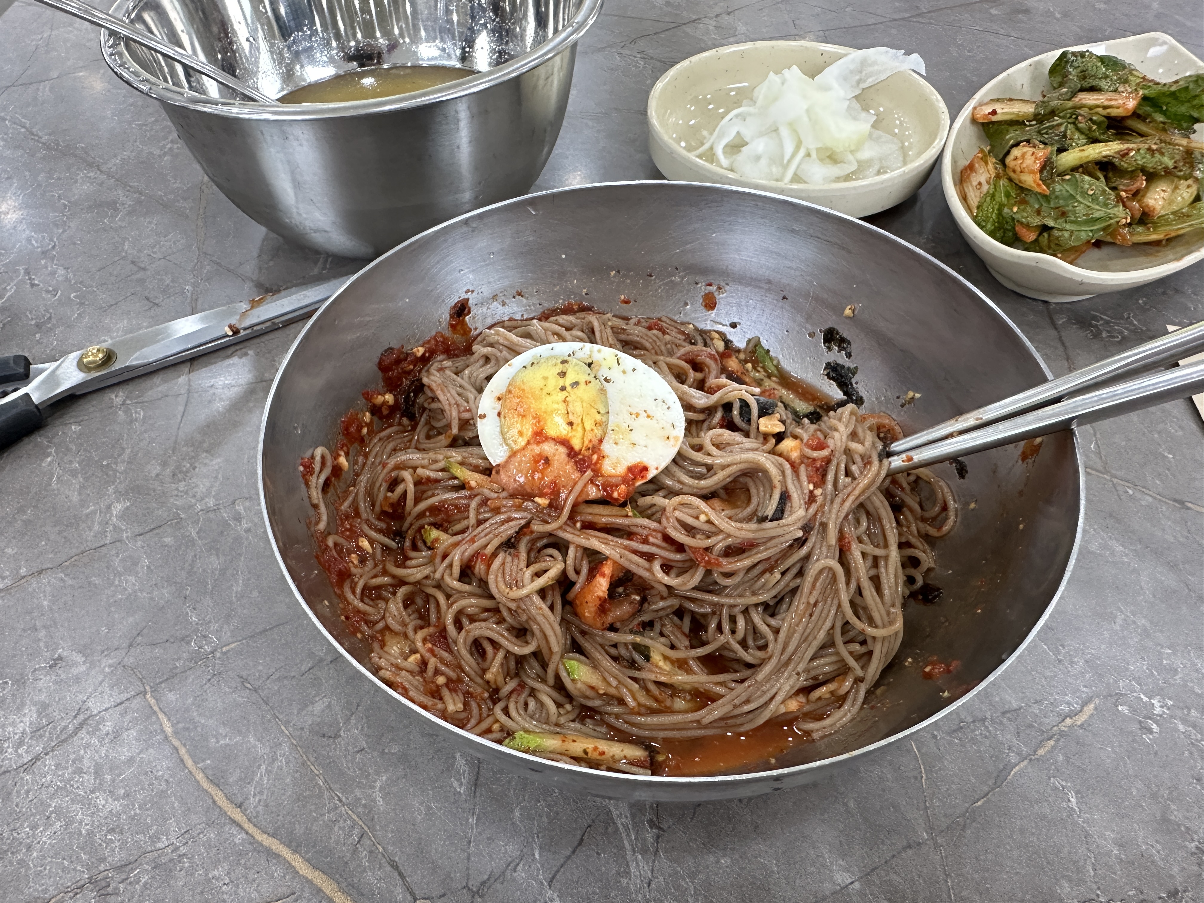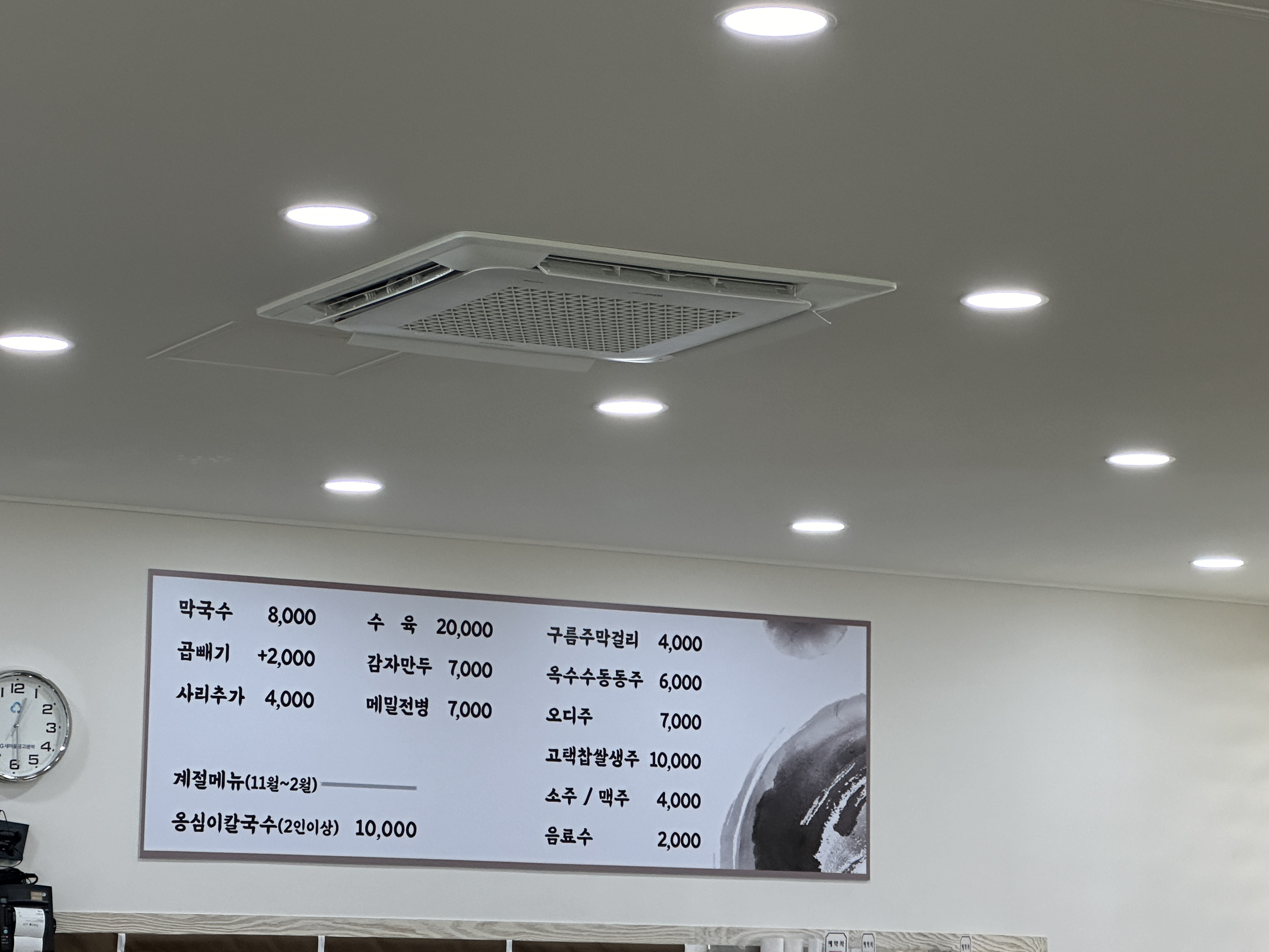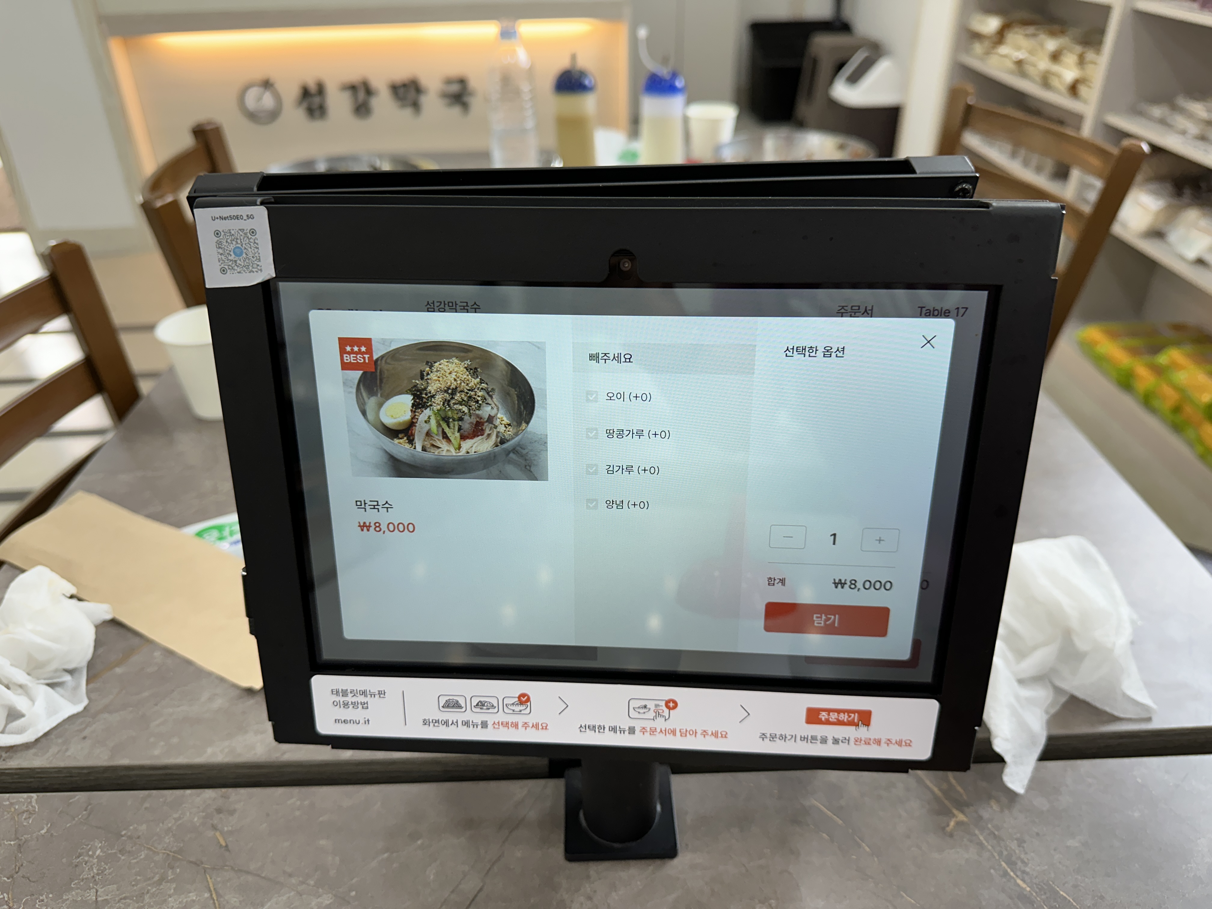 ‘물’이나 ‘비빔’ 문구가 들어가지 않은 그냥 막국수다. 키오스크 화면에서 ‘막국수’를 선택하고 주문을 눌렀다. 키오스크에서는 주문만 가능하고 결제는 나갈 때, 카운터에서 하면 된다.