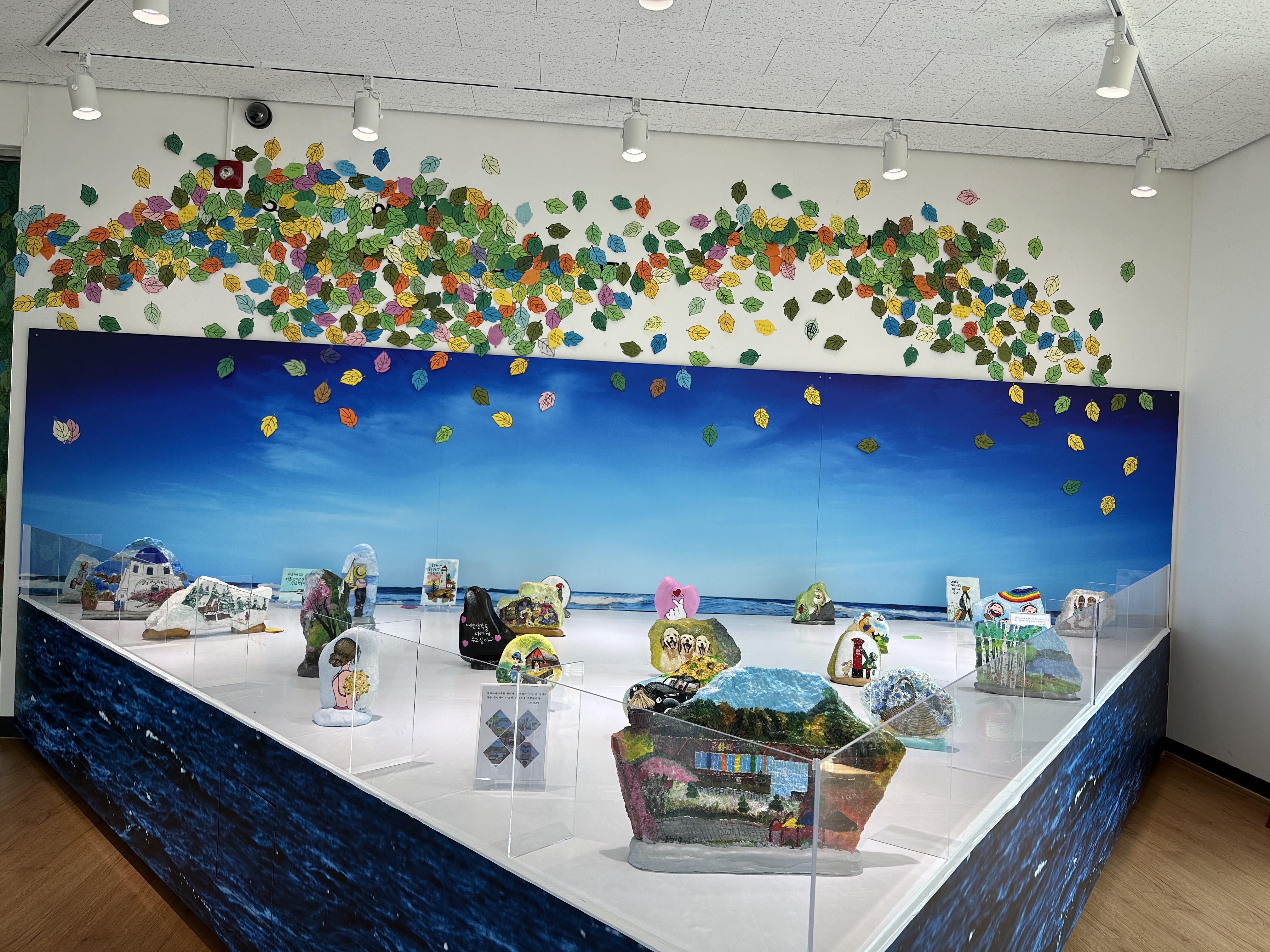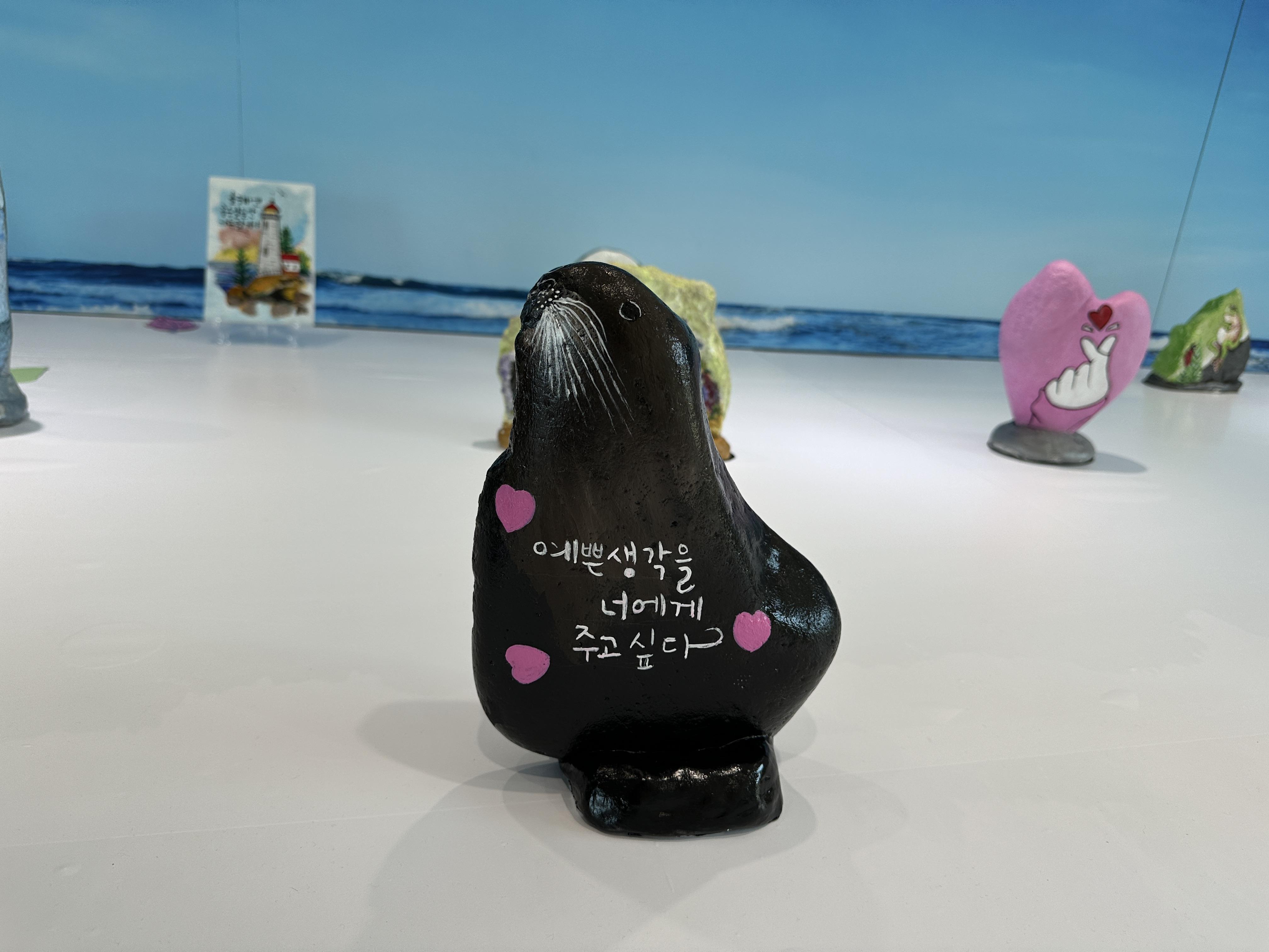 섬유에 그림을 그려 만든 가방 작품과 돌에 그림을 그린 것들이었다. 귀여운 것들이 많았는데 가장 마음에 든 것은 돌에 그려진 검은색 물개 그림이었다.