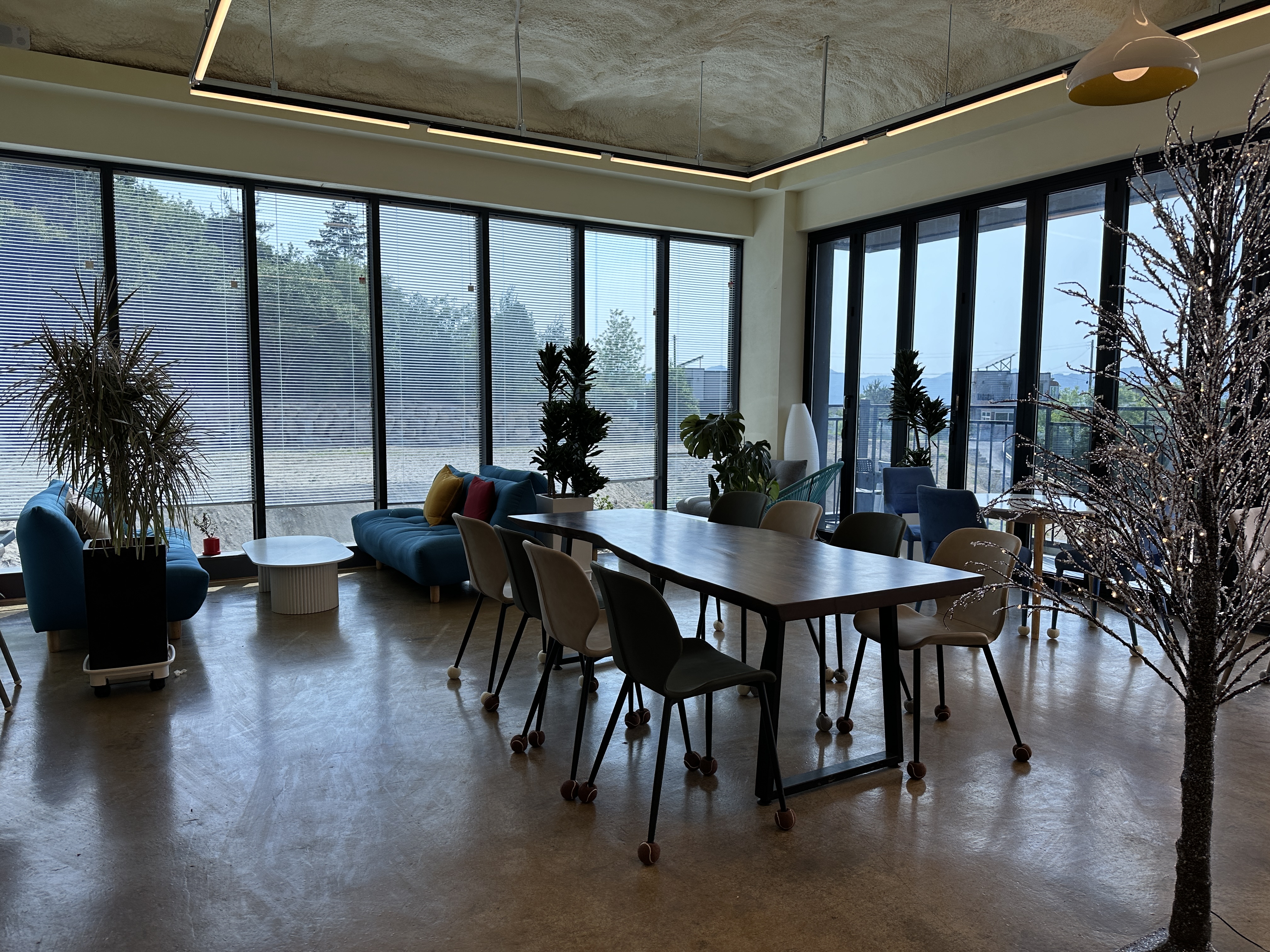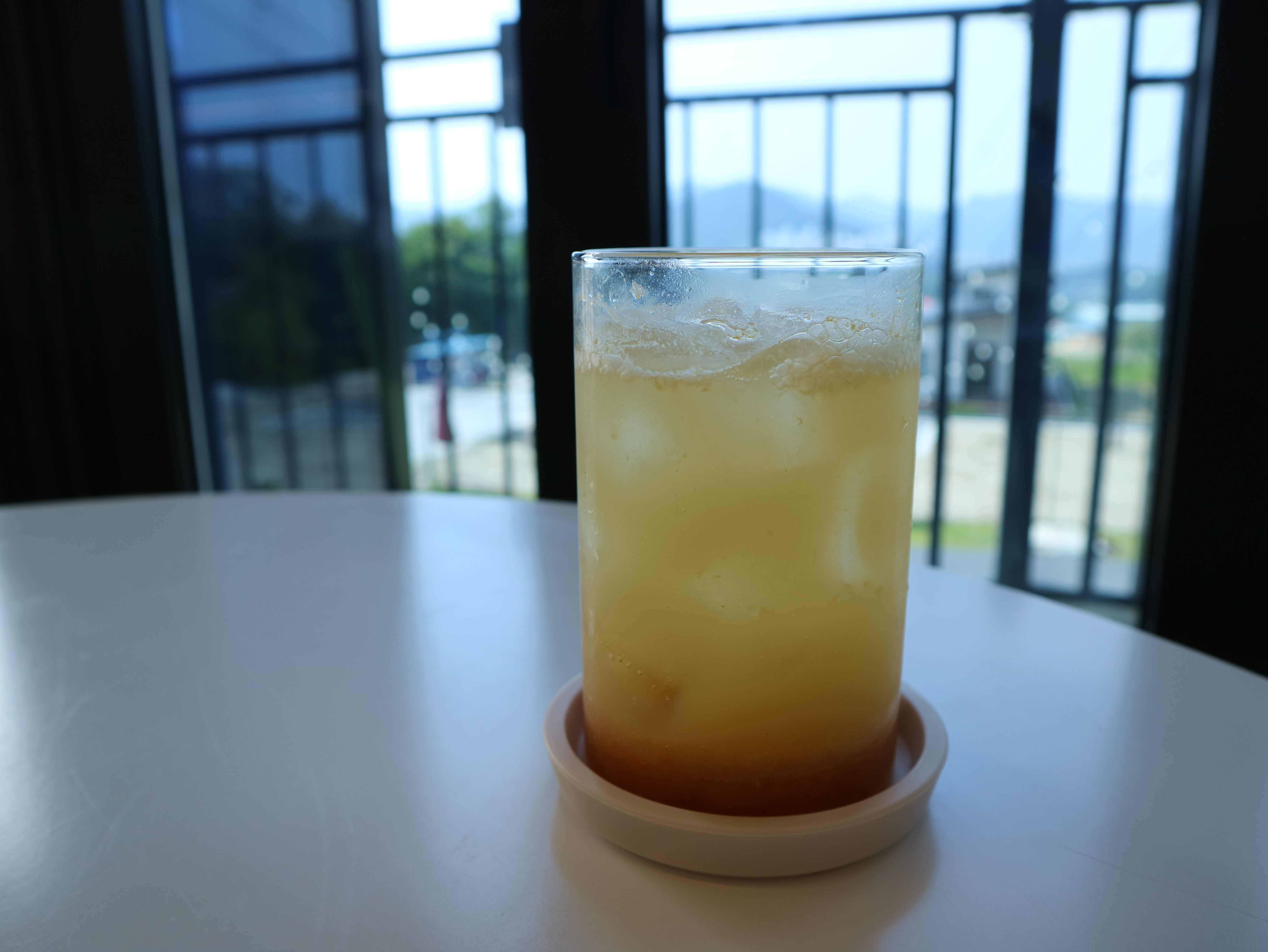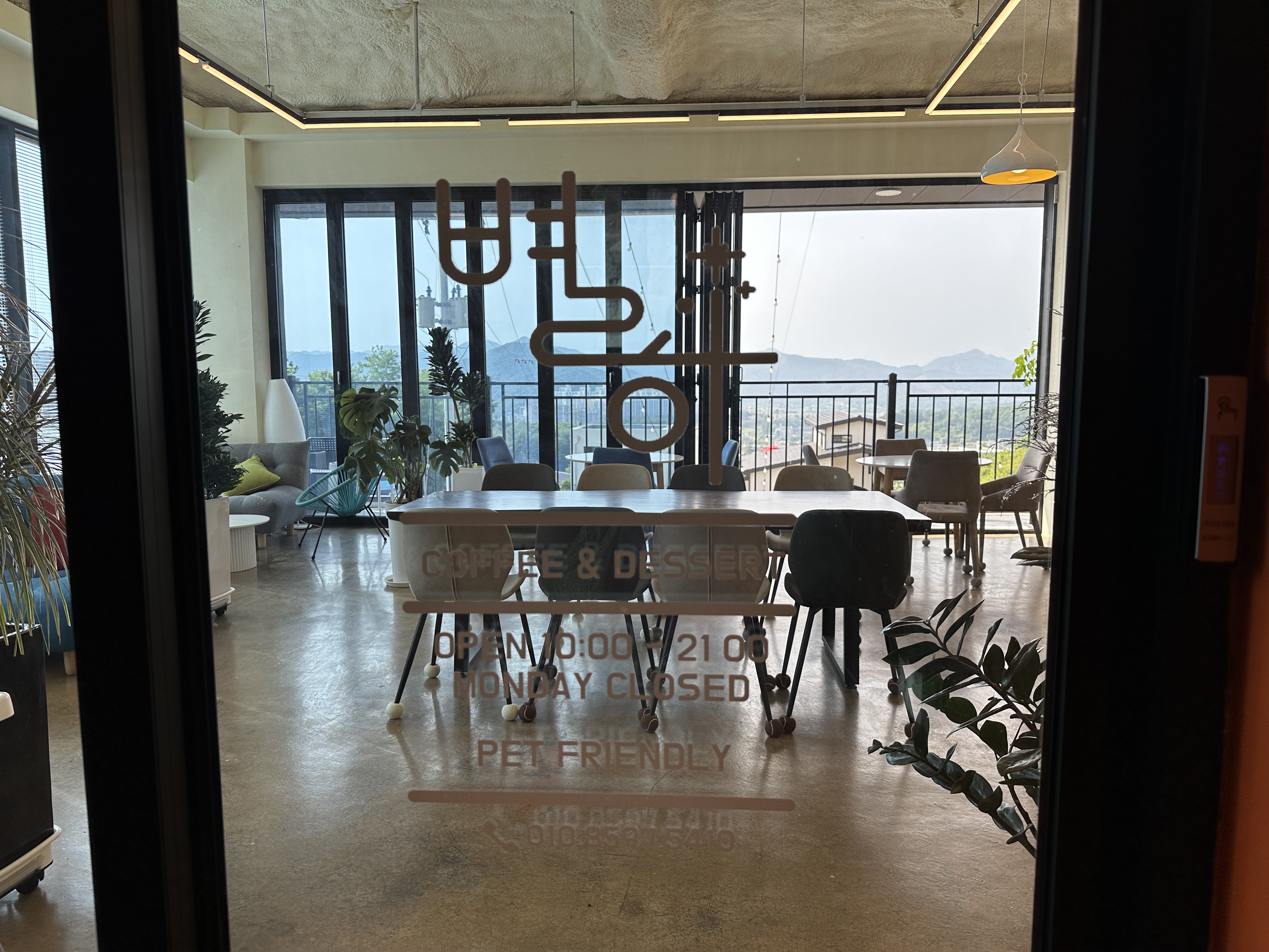 카페 건물은 실제로 마을 가장 높은 곳에 있었다. 1층은 필로티 형태로 앞마당에 주차를 하면 되었다. 카페는 2층으로 계단을 올라가면 있었다. 2층 카페 내부는 소파와 일반 의자가 적절히 섞여있었다. 창가는 폴딩도어로 되어있어 개방감이 좋았다.
