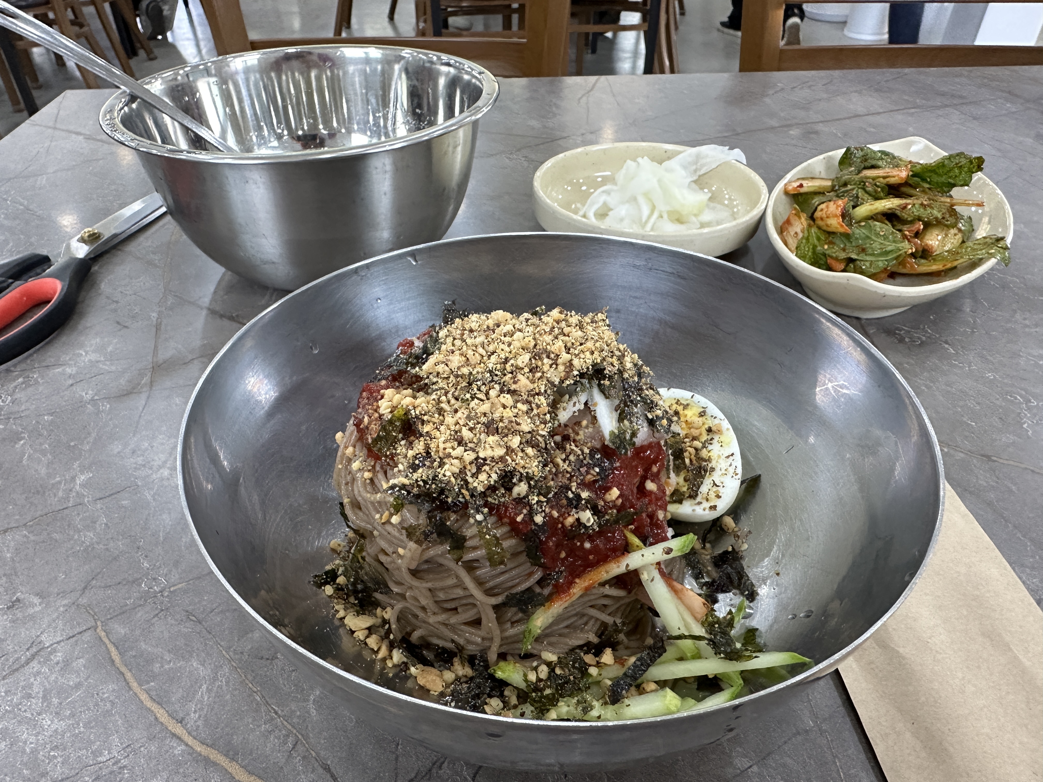섬강막국수의 막국수의 생김새는 비빔막국수 비주얼이었다. 메밀면 위에 빨간 양념장과 오이, 계란, 무김치, 김가루, 깻가루, 땅콩가루까지 뿌려져 나왔다.