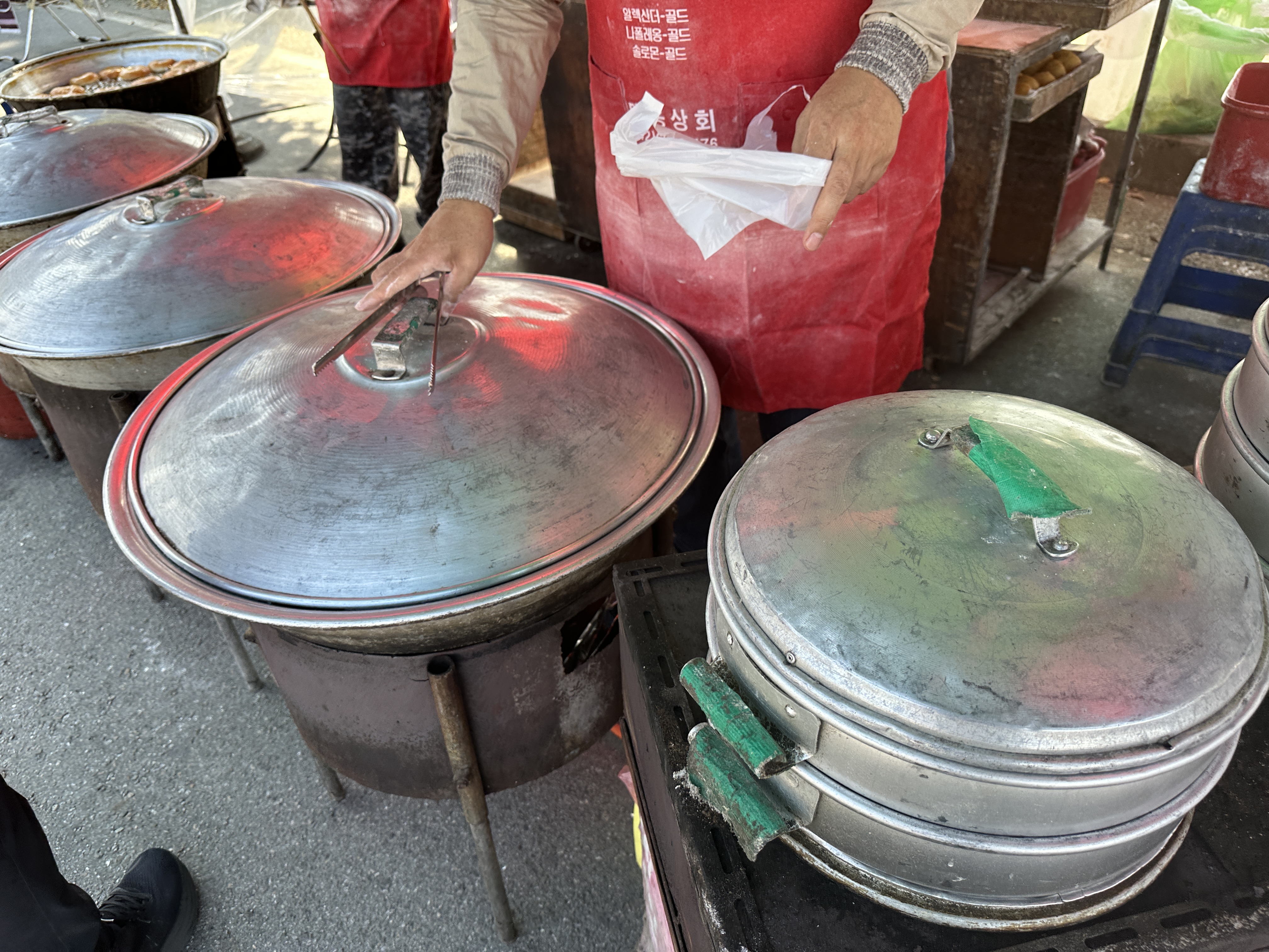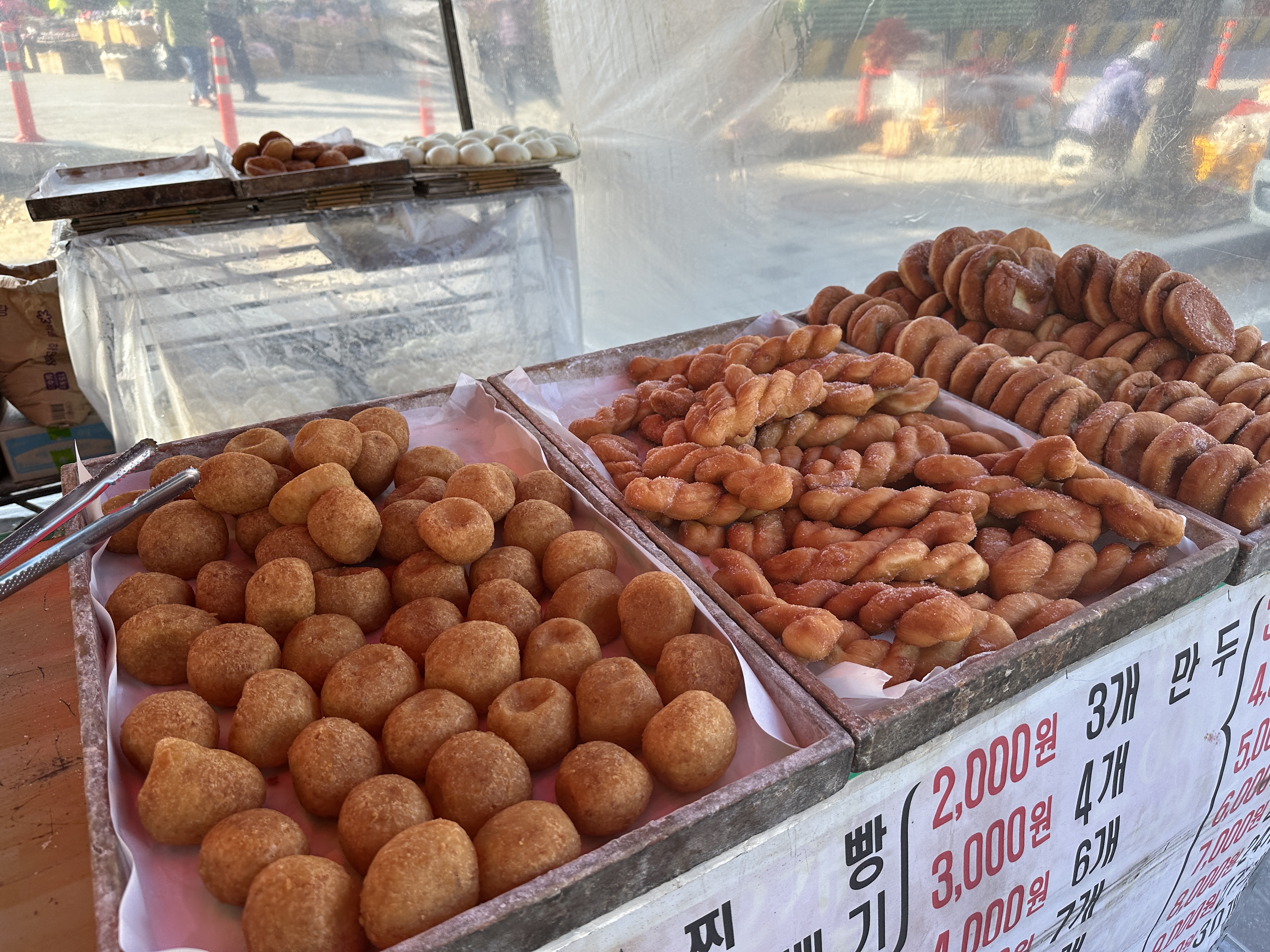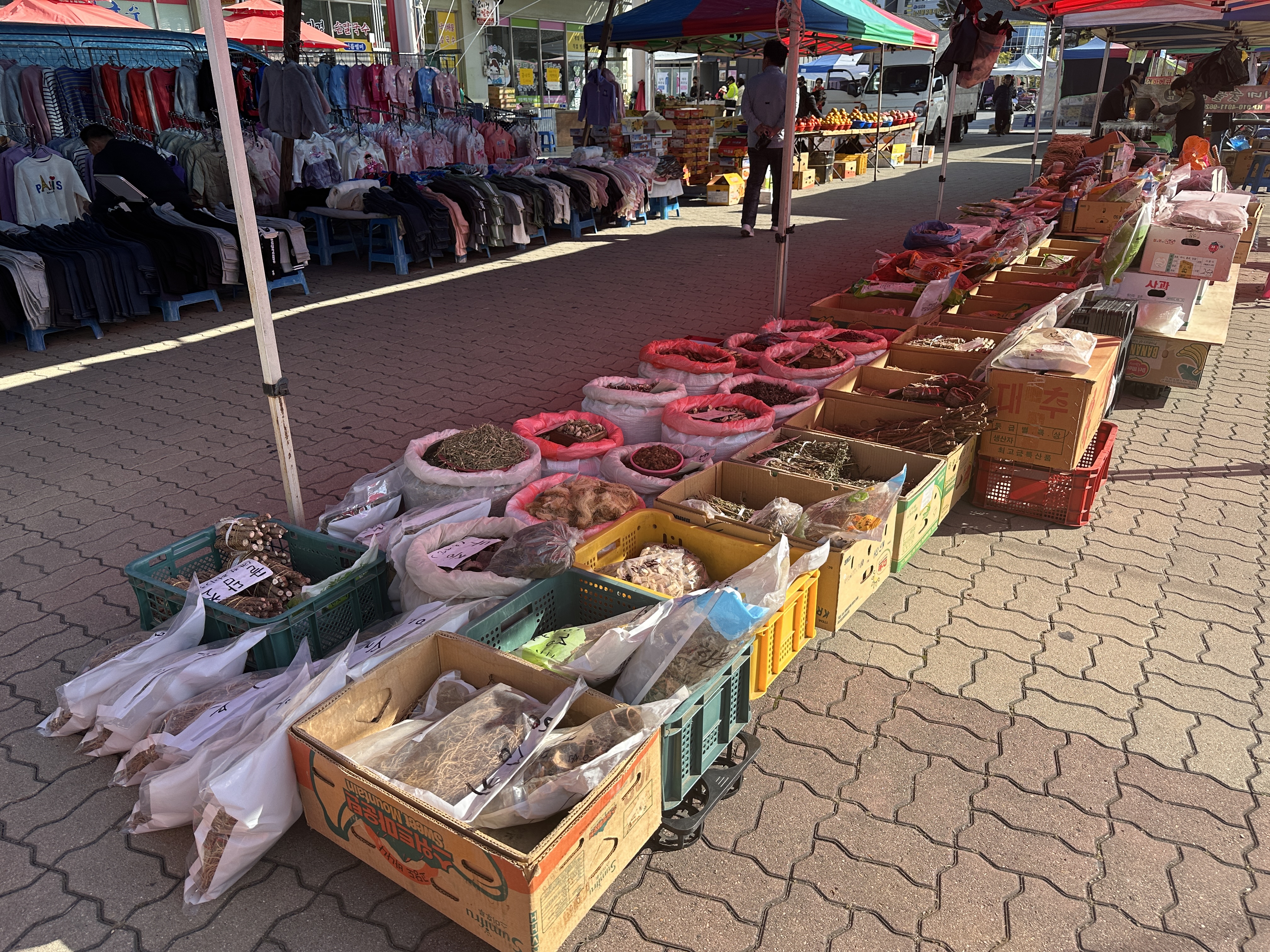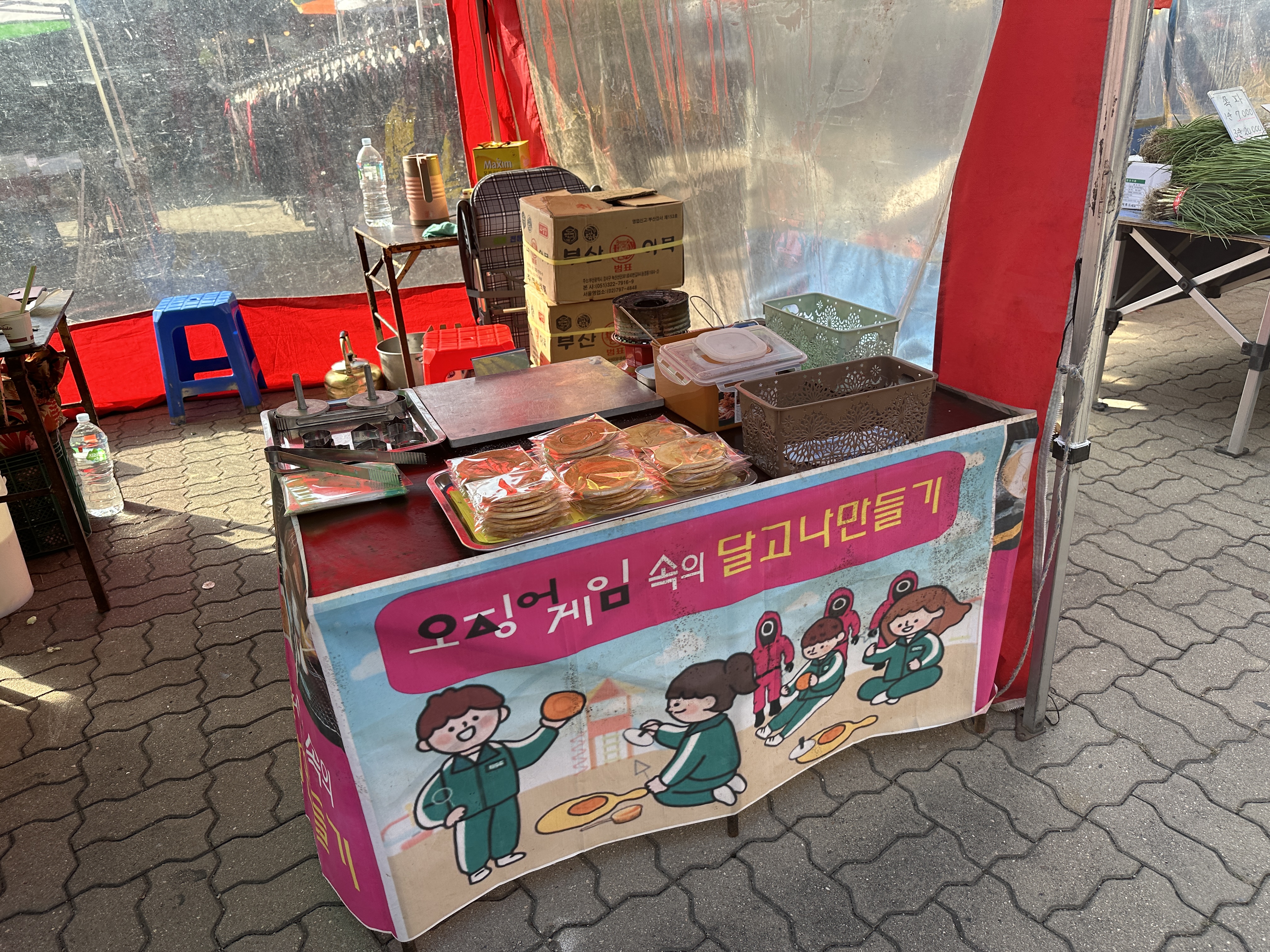 오전 10시가 조금 넘은 시간이었는데도 이미 많은 상인들이 물건을 정리하고 있었습니다. 시장의 규모는 꽤 컸고, 판매하는 품목도 다양하더라고요. 꽈배기, 찐빵, 순대 같은 간식부터 화려한 옷, 신발, 약초, 과일, 채소, 양념게장, 새우젓까지 없는 게 없었습니다. 심지어 ‘오징어게임’으로 유명해진 뽑기까지 있었고요.