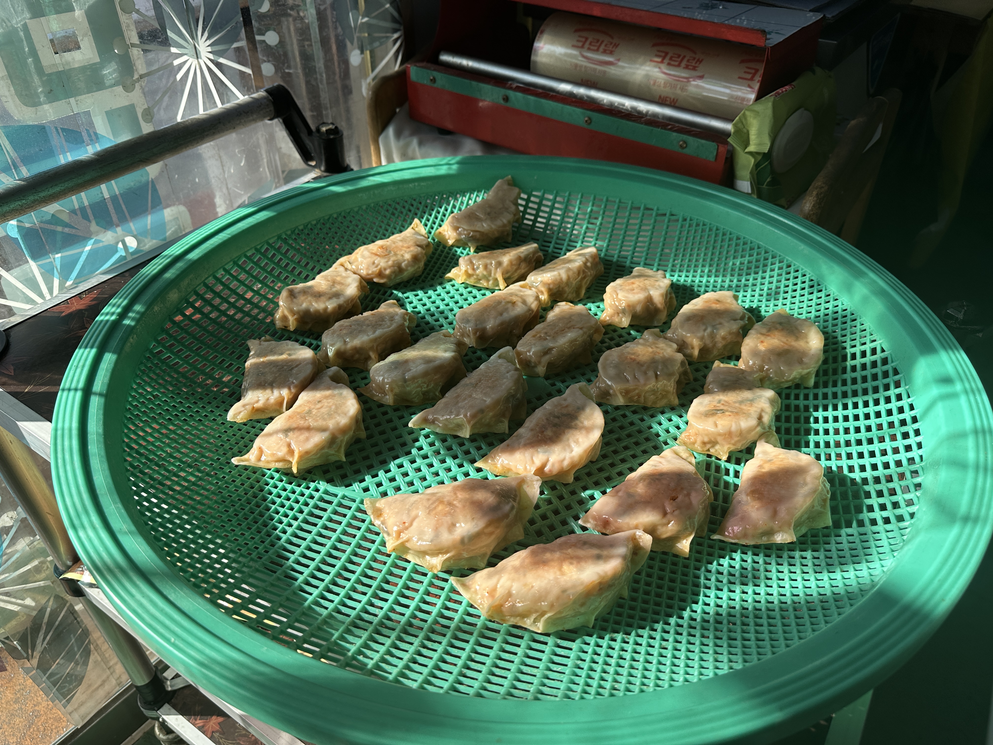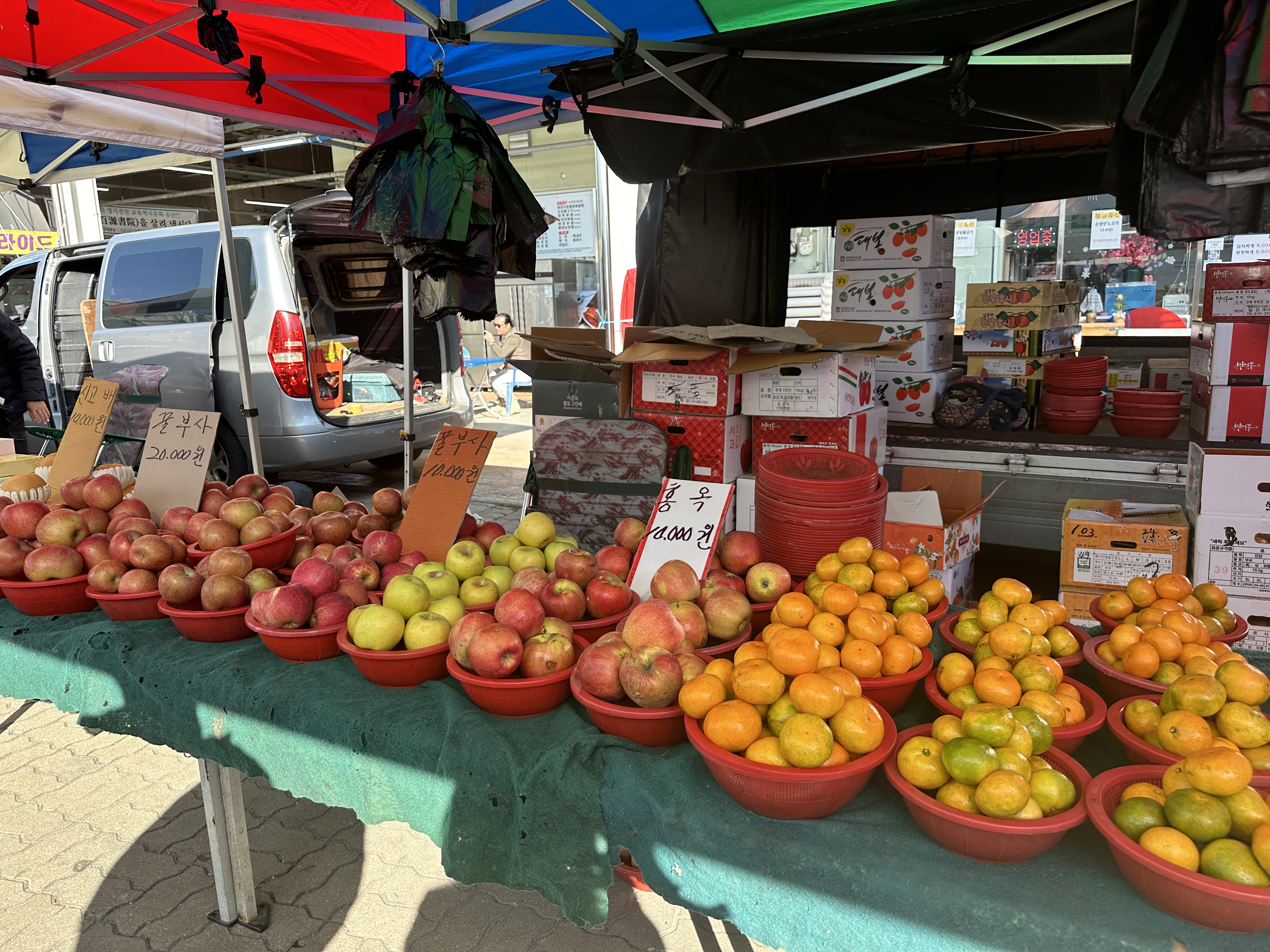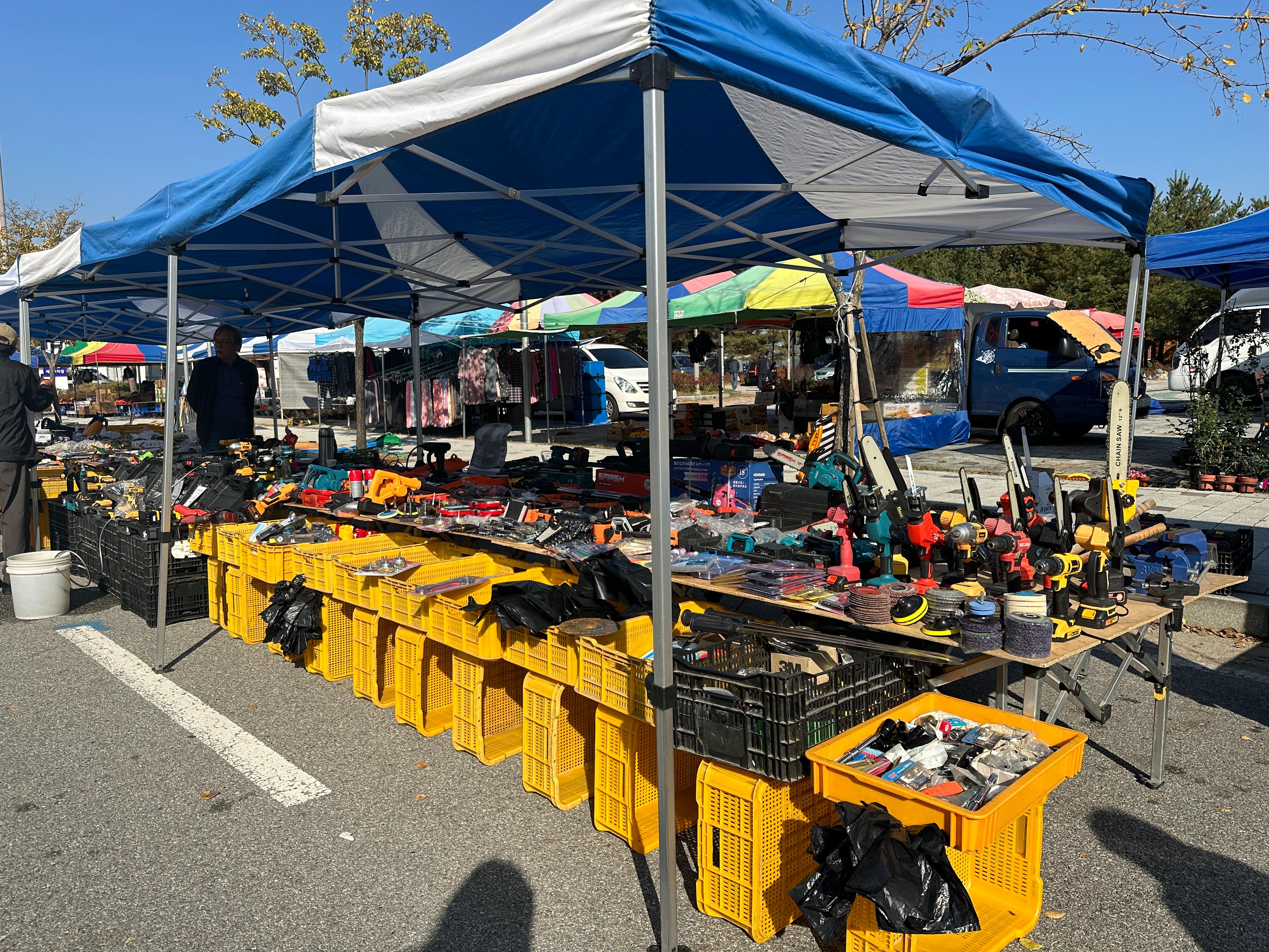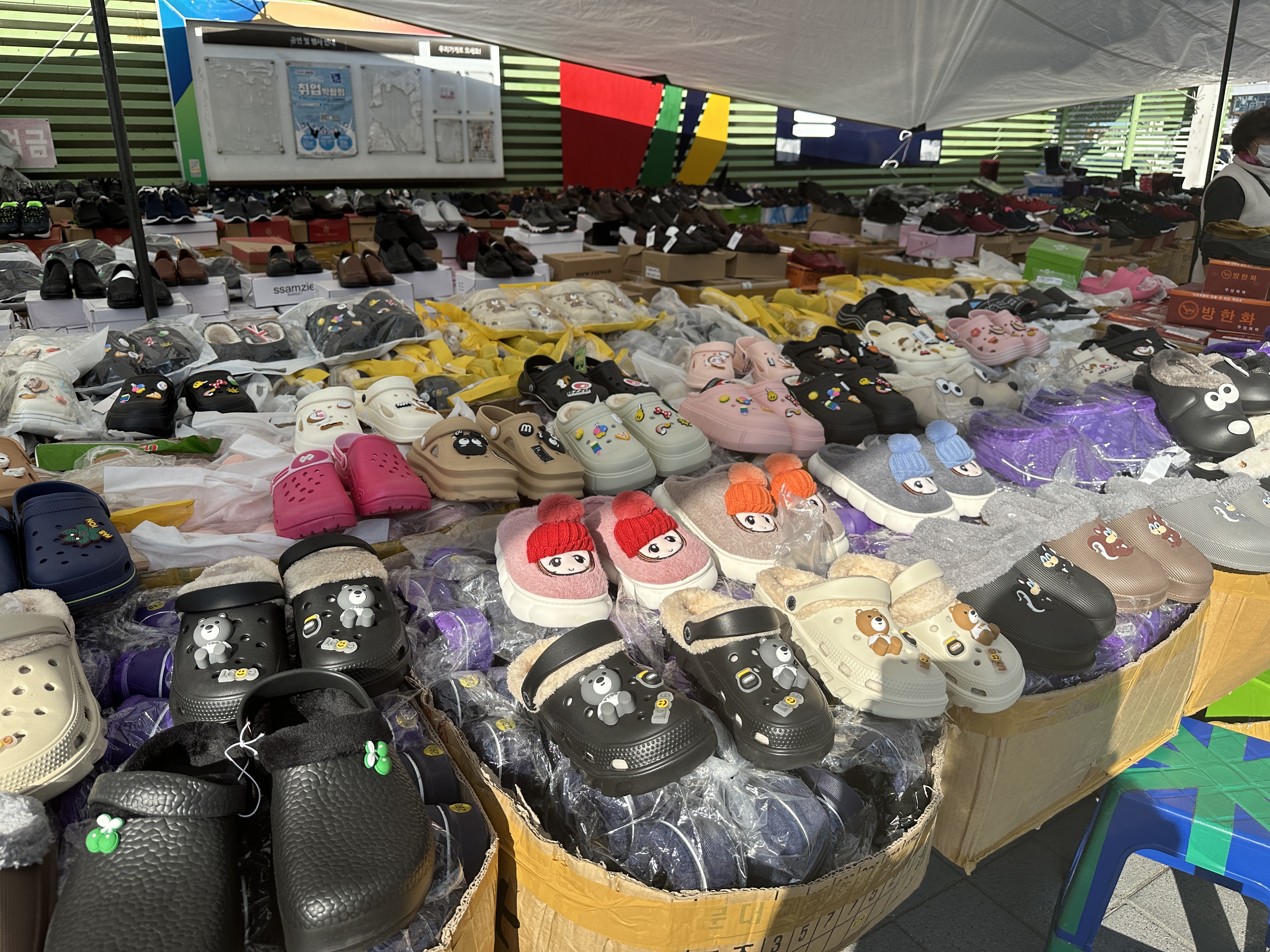 오전 10시가 조금 넘은 시간이었는데도 이미 많은 상인들이 물건을 정리하고 있었습니다. 시장의 규모는 꽤 컸고, 판매하는 품목도 다양하더라고요. 꽈배기, 찐빵, 순대 같은 간식부터 화려한 옷, 신발, 약초, 과일, 채소, 양념게장, 새우젓까지 없는 게 없었습니다. 심지어 ‘오징어게임’으로 유명해진 뽑기까지 있었고요.