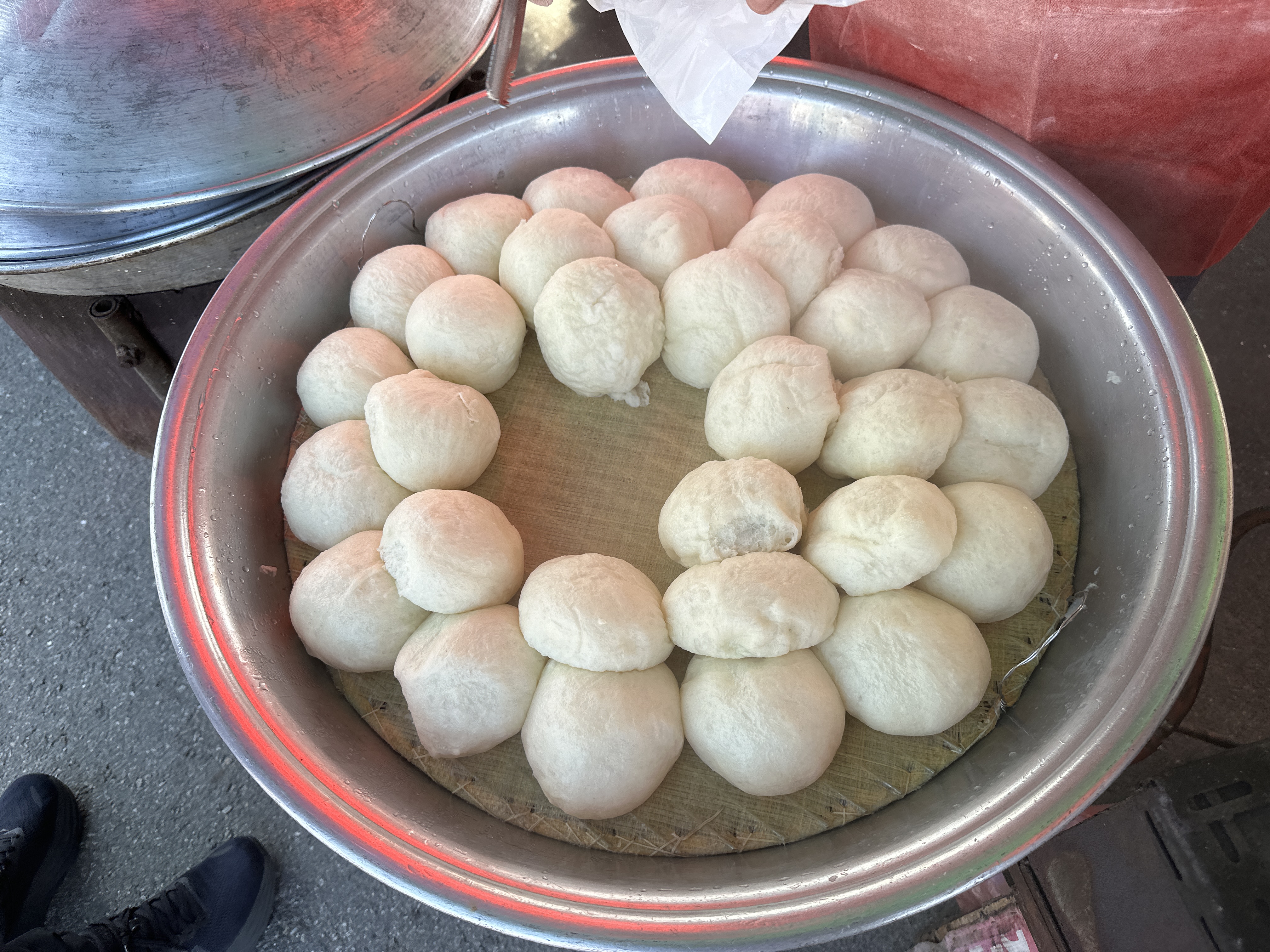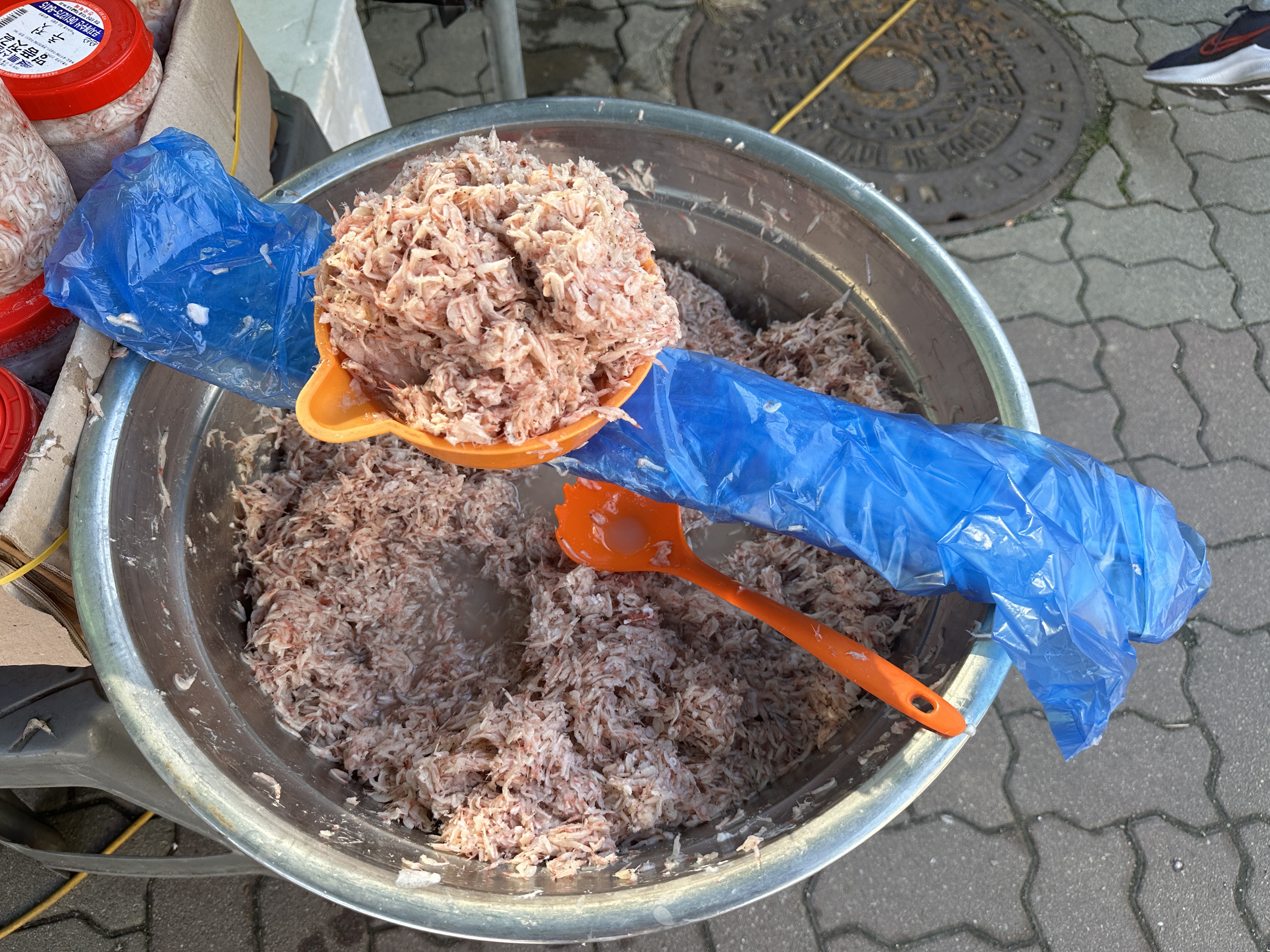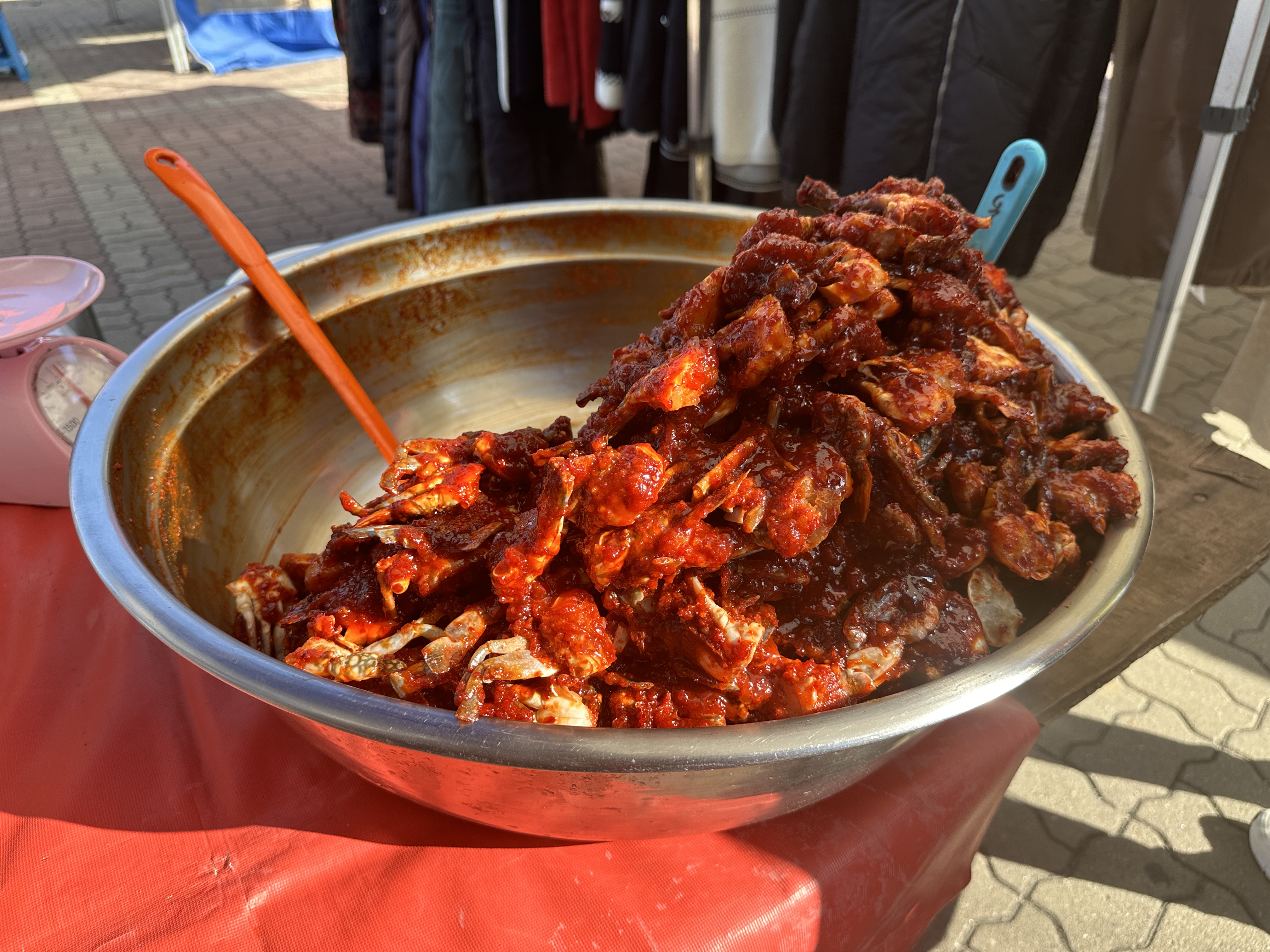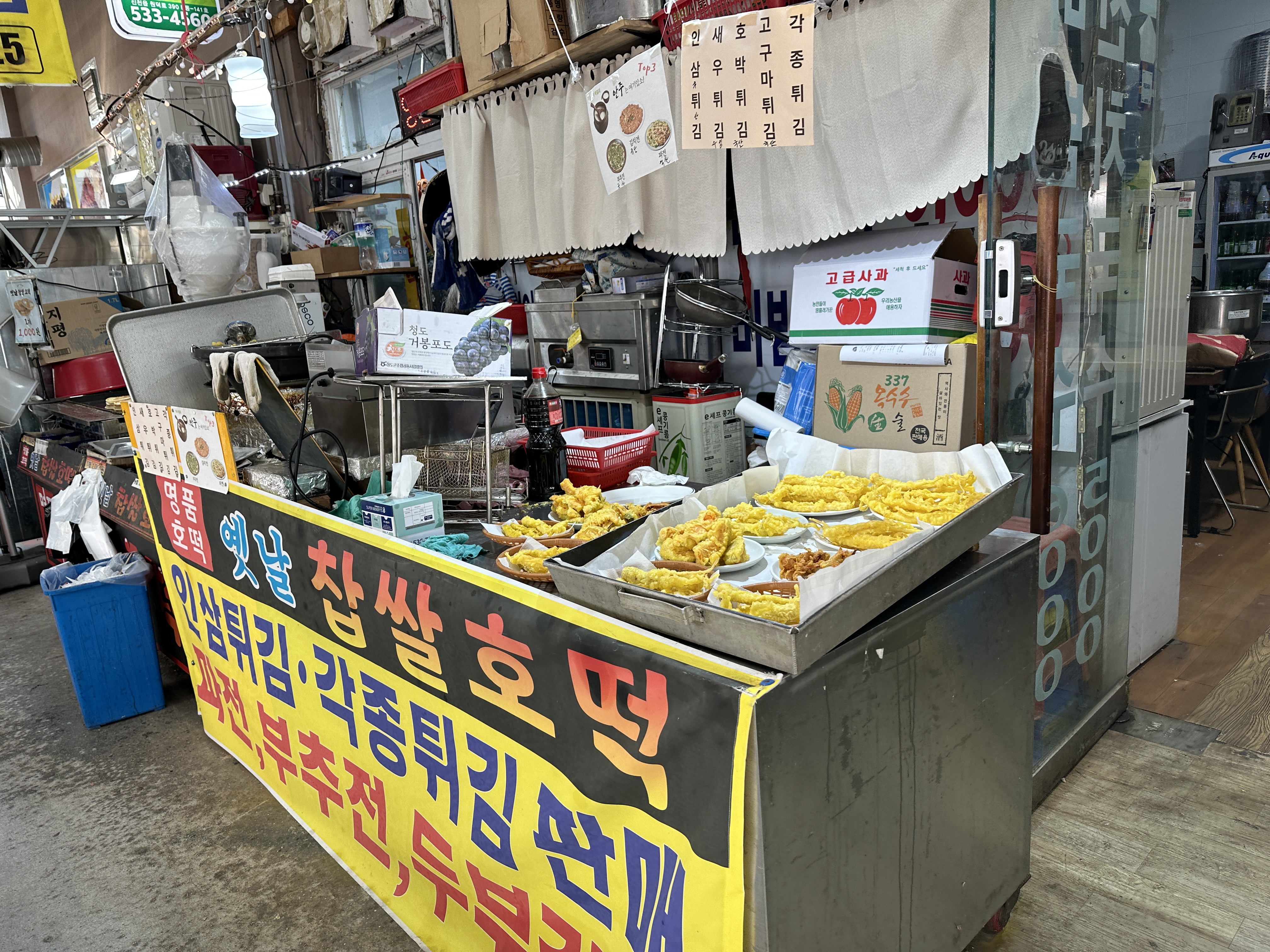 오전 10시가 조금 넘은 시간이었는데도 이미 많은 상인들이 물건을 정리하고 있었습니다. 시장의 규모는 꽤 컸고, 판매하는 품목도 다양하더라고요. 꽈배기, 찐빵, 순대 같은 간식부터 화려한 옷, 신발, 약초, 과일, 채소, 양념게장, 새우젓까지 없는 게 없었습니다. 심지어 ‘오징어게임’으로 유명해진 뽑기까지 있었고요.