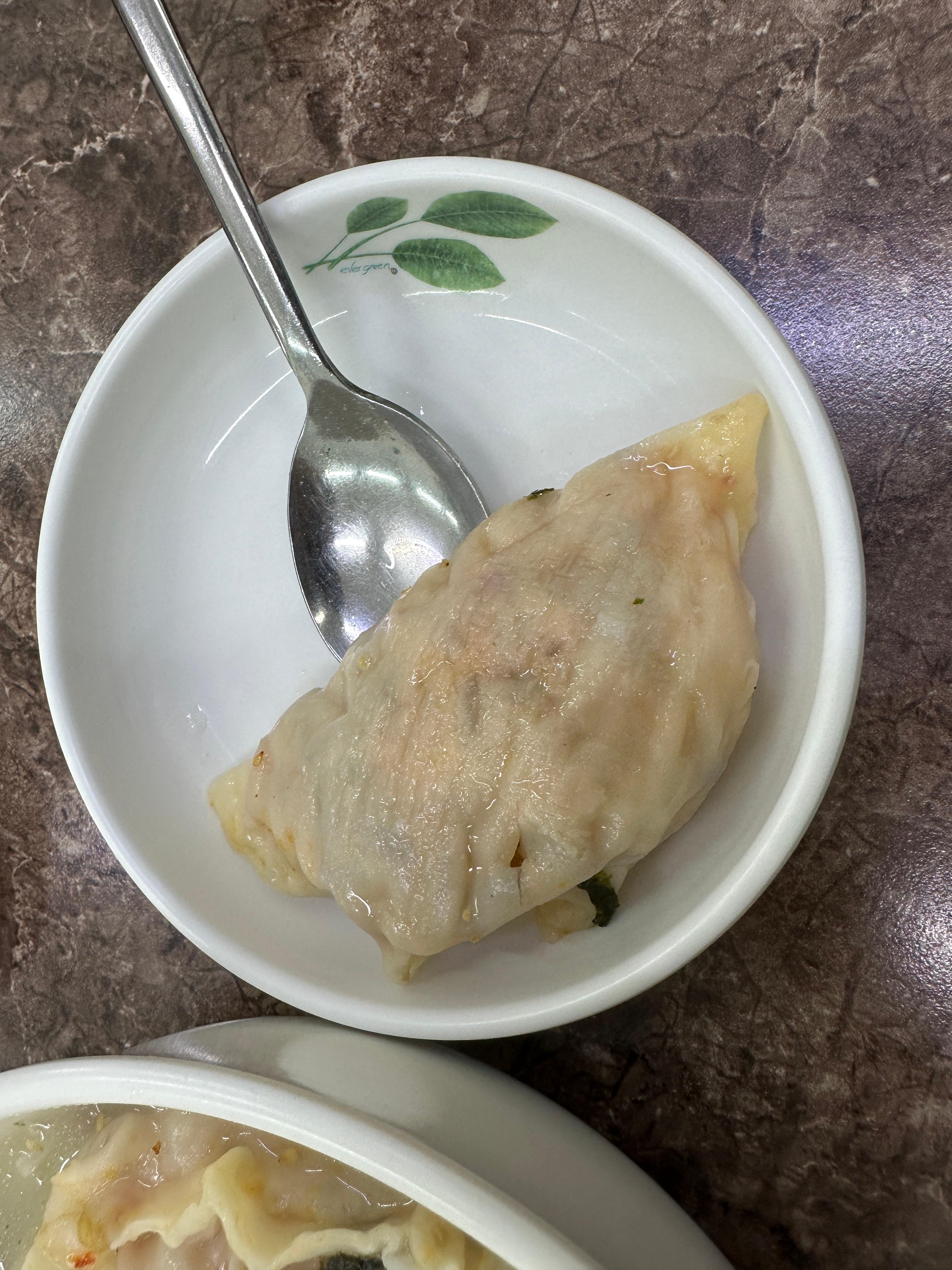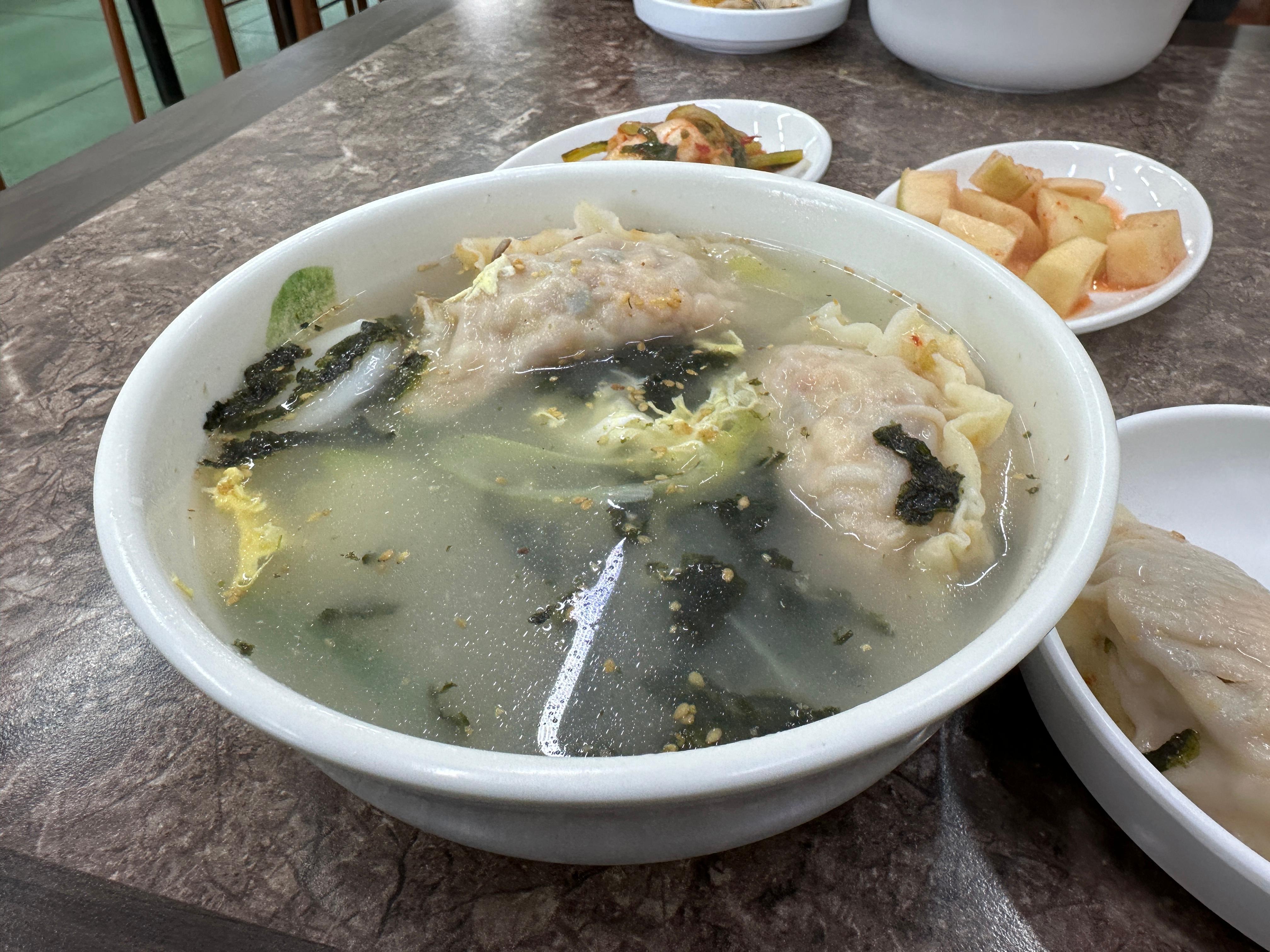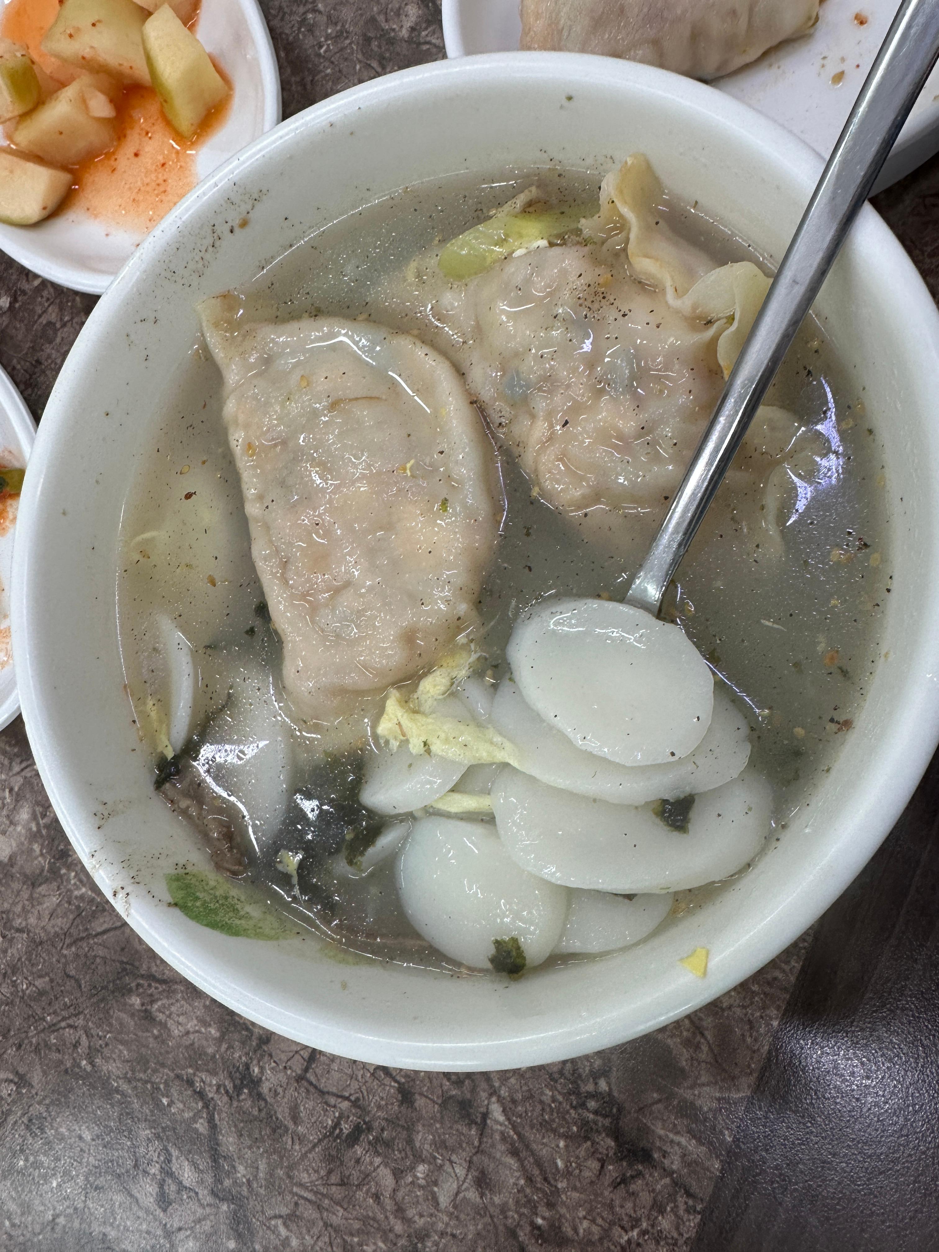 떡만두국을 주문했습니다. 벽면에 ‘찐만두와 군만두는 식사 메뉴가 우선이며, 여유가 있을 때만 소량 판매합니다’라는 안내문이 적혀 있었습니다. 찐만두도 맛보고 싶었지만 이미 찐빵과 호떡을 먹은 상태라 일단 떡만두국만 먹기로 했습니다.