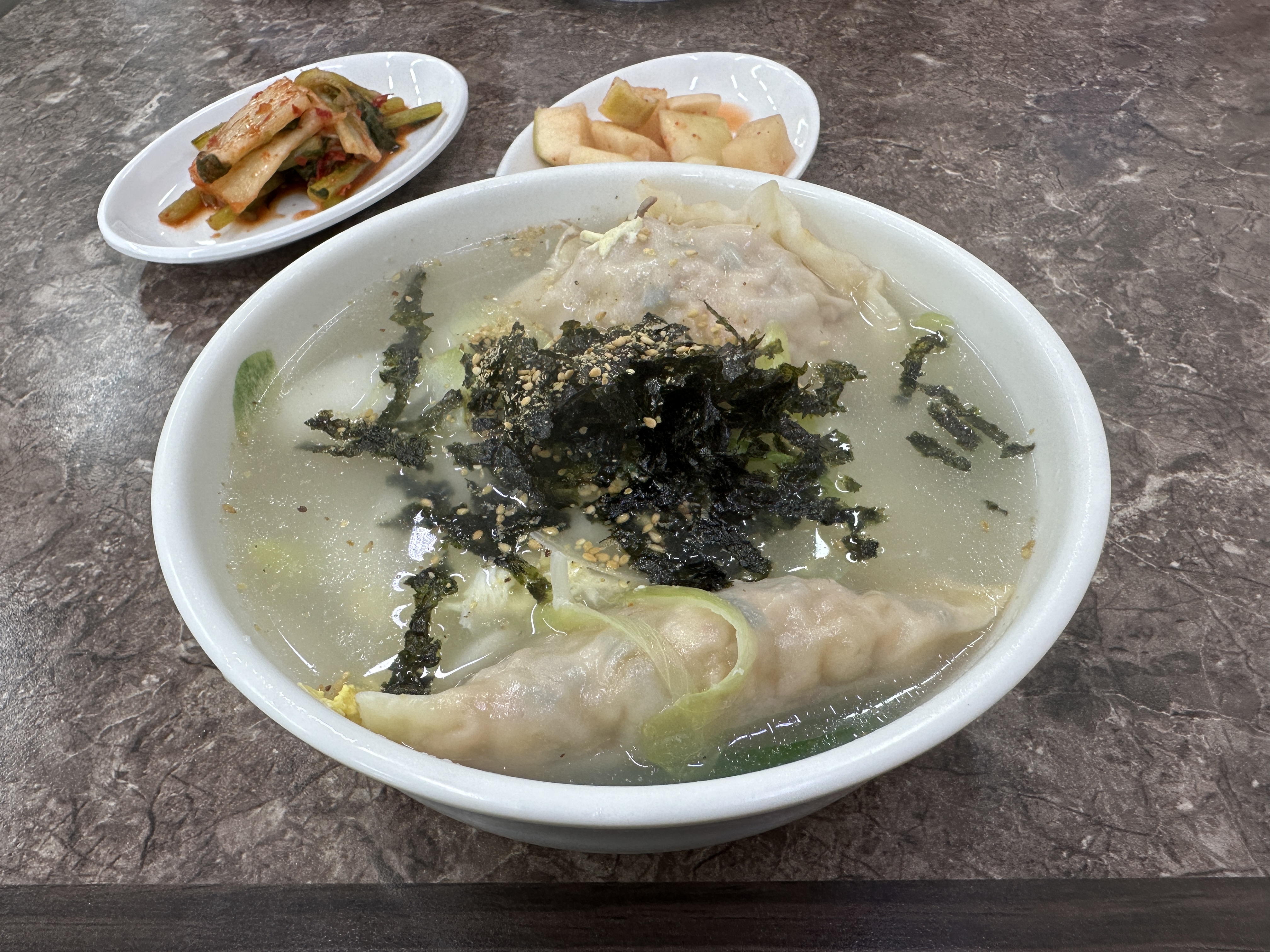 만두피는 너무 두껍지도 얇지도 않았고, 속에는 잘게 다진 김치와 소량의 고기, 당면, 부추 등이 가득 들었습니다. 처음엔 육수가 약간 밍밍한 느낌이었지만, 만두를 터뜨려 내용물을 풀어놓으니 국물과 조화롭게 어우러졌습니다. 한우 육수를 사용해 깊은 맛이 나는 것이 특징이었습니다.