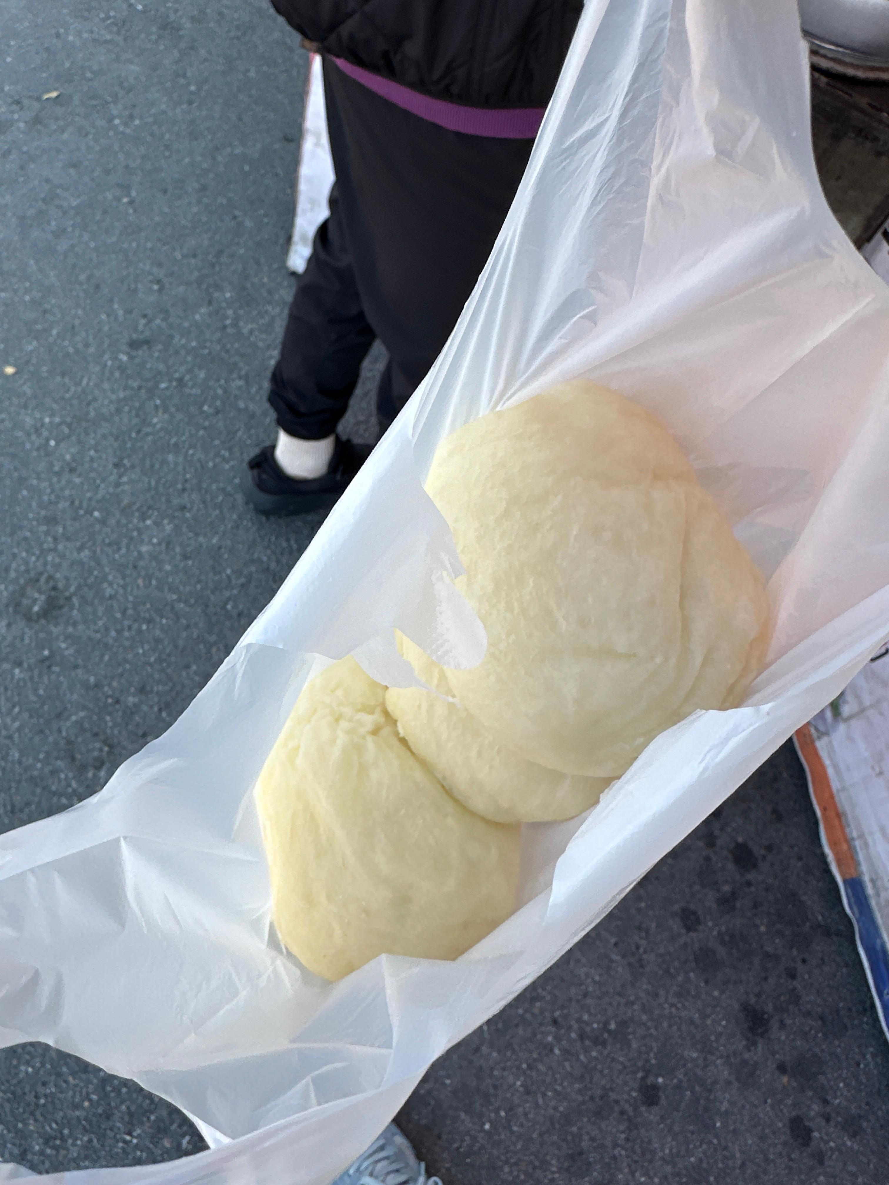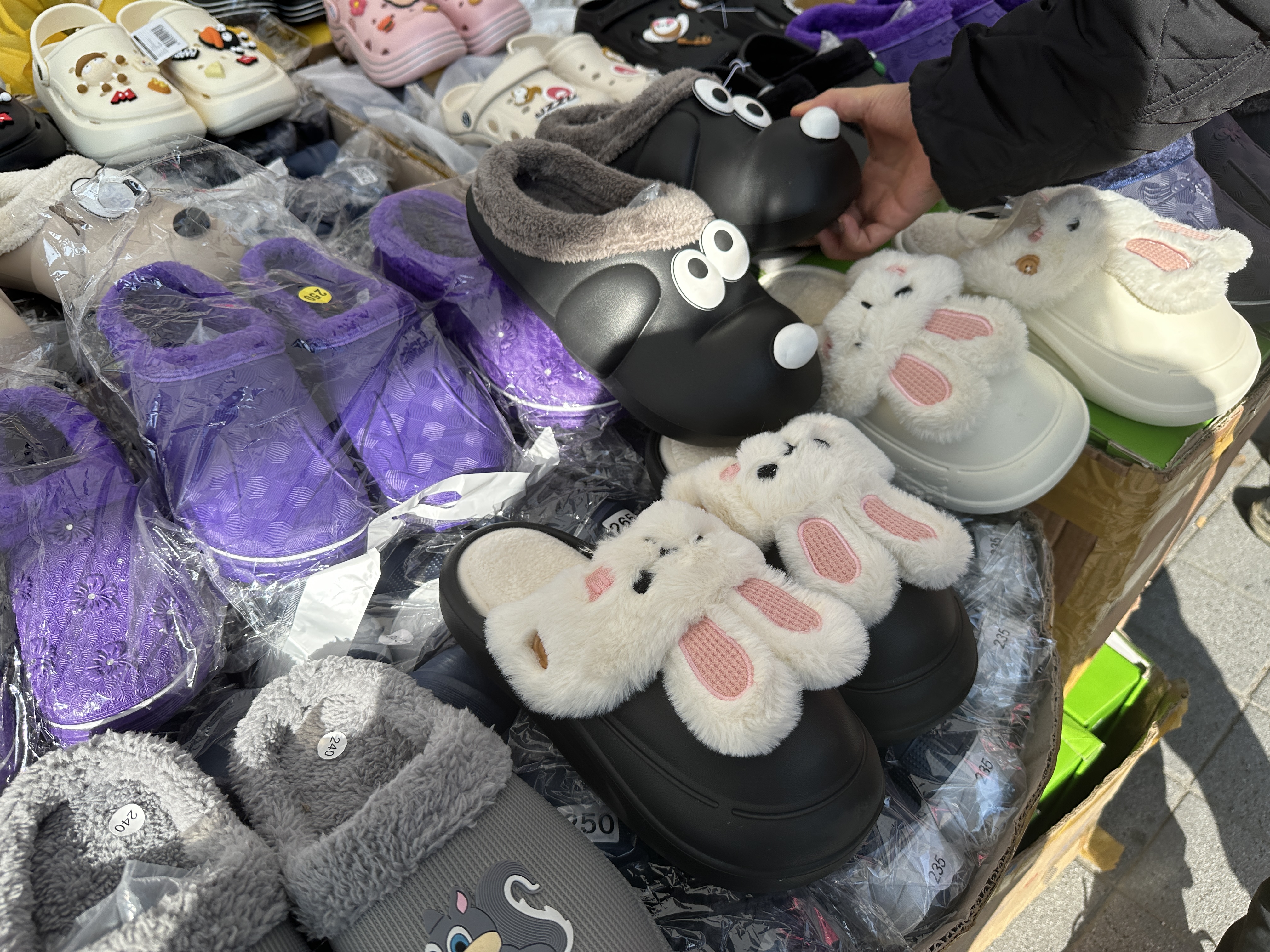 시장 구경을 하며 갓 쪄낸 따끈한 찐빵(3개 2,000원)을 사서 먹었는데, 부드럽고 달콤한 맛이 일품이었답니다. 할머니, 할아버지들이 신으시던 털 고무신도 보여서 반가웠는데요. 요즘은 디자인이 다양하고 예쁘게 나와서 눈길이 갔습니다.