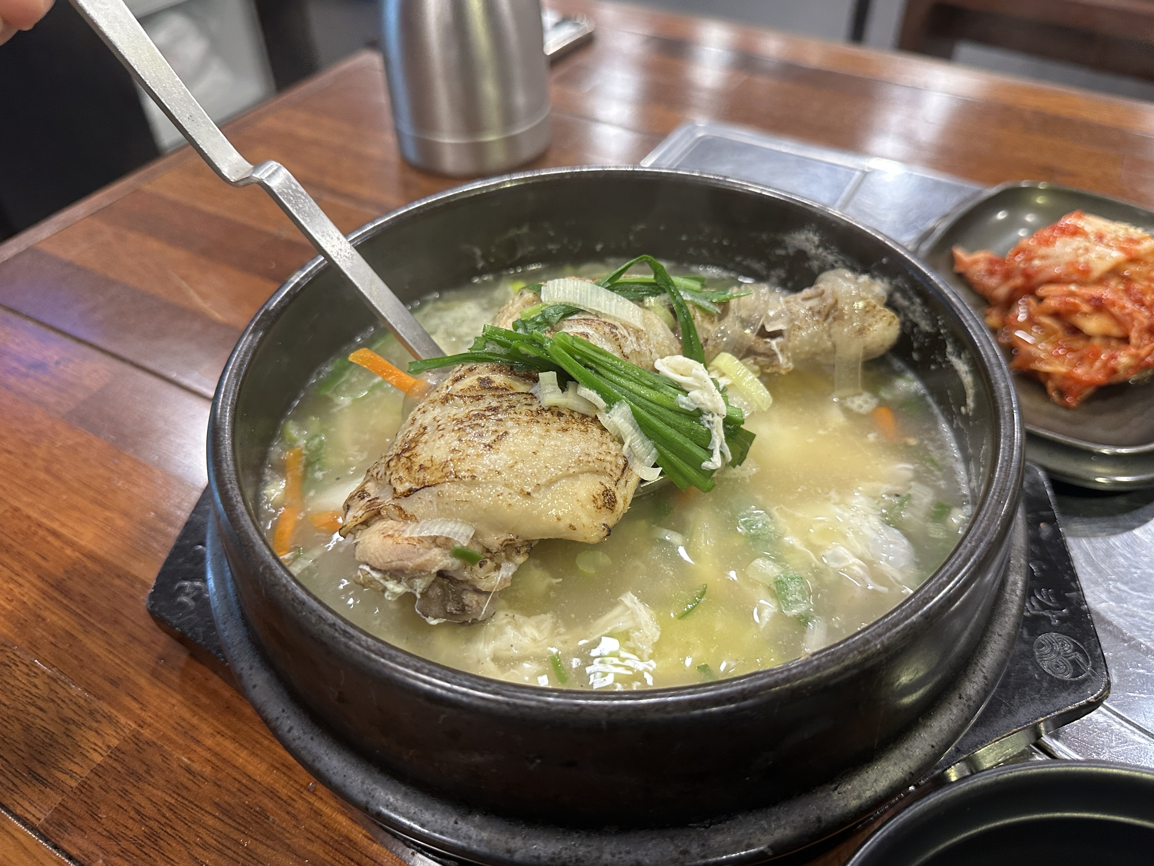직화닭다리곰탕은 커다란 뚝배기에 나왔다. 불에 그을린 튼실한 갈색 닭다리 하나가 들어있었다. 닭다리 외에는 양파, 부추, 당근, 계란 등 몸에 좋은 것들로 가득찼다.