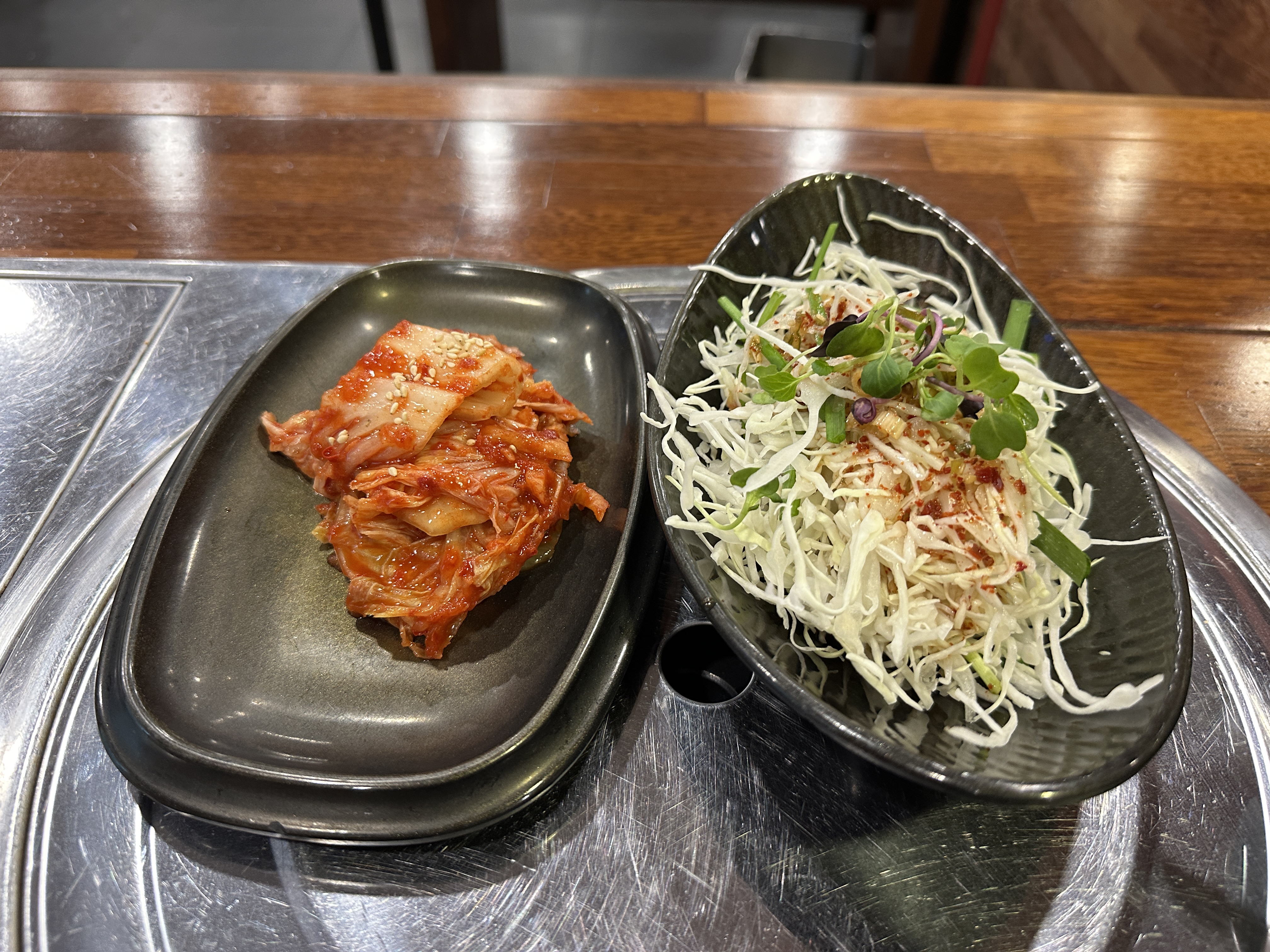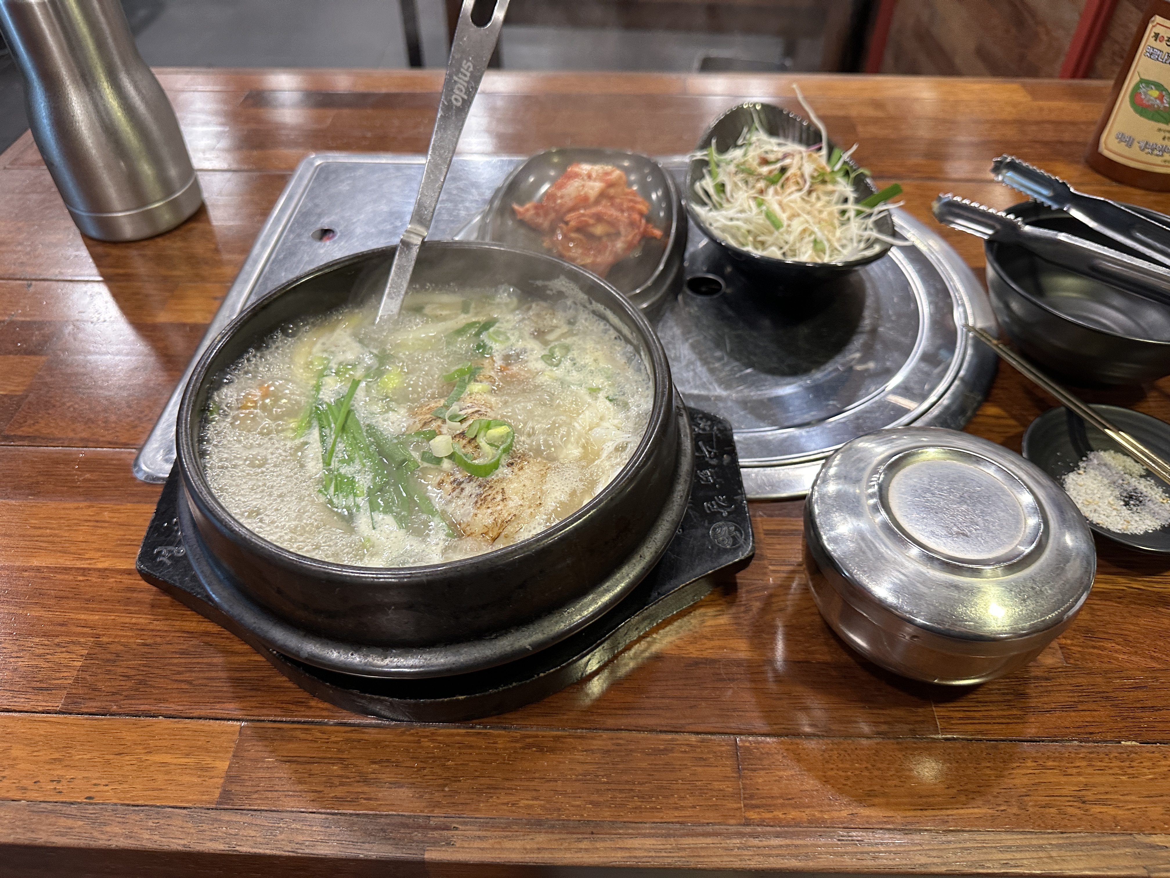 직화닭다리곰탕을 주문했다. 김치와 양배추 샐러드를 먼저 가져다 주었다. 양배추 위에 빨간 소스가 뿌려져있었는데 매콤하면서도 상큼해 입맛이 확 돌았다.