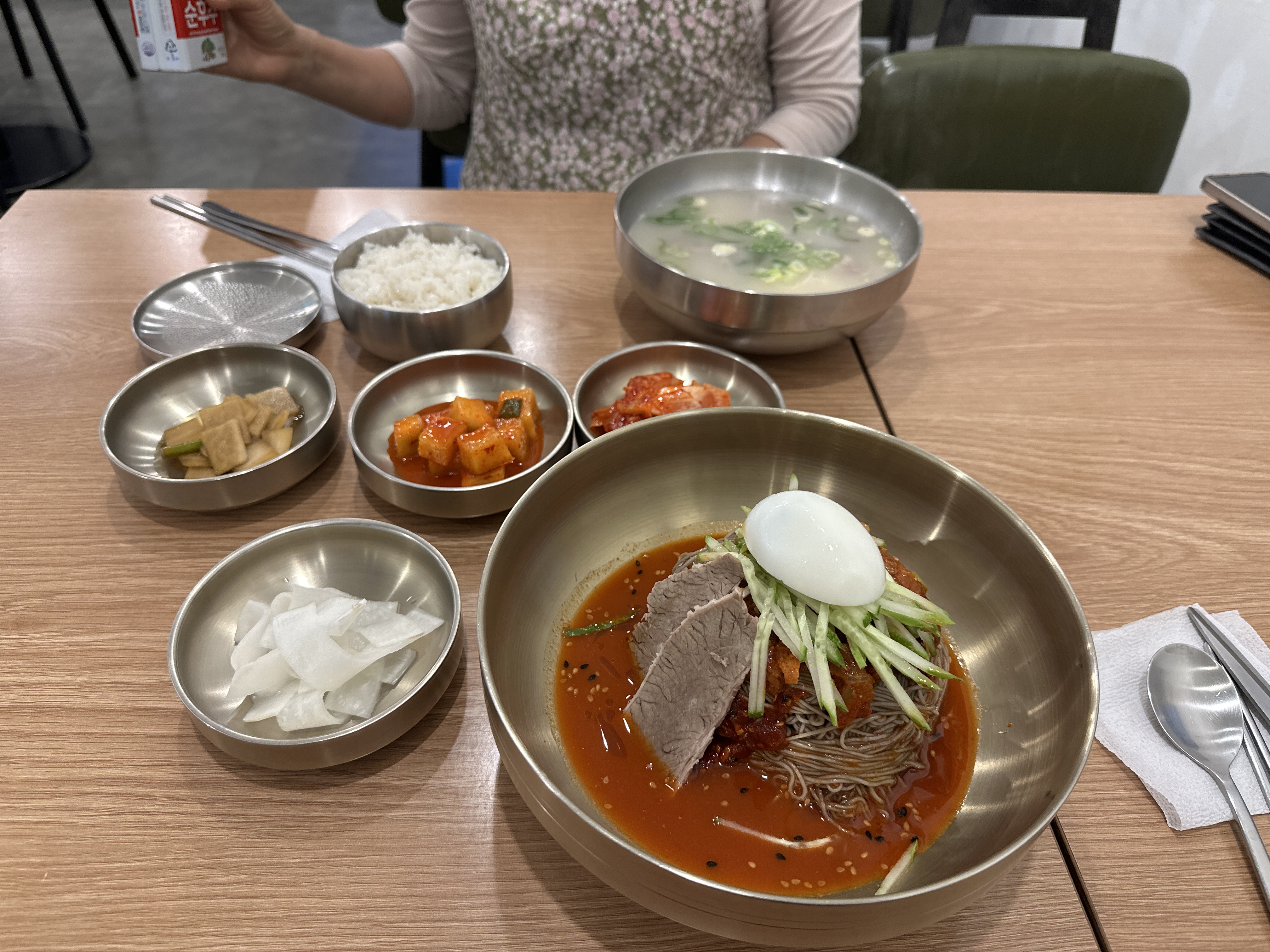 목요일 저녁 7시를 조금 넘어서 방문하였다. 우리 외에 손님이 한 팀 더 있었다. 자리를 잡고 테이블의 키오스크로 주문을 했다. 세끼미냉면이라고 처음보는 이름의 냉면이 있었다. 회냉면인데 홍어회 외에 양지고기가 고명으로 올라간다고 했다. 새로우니까 주문! 언니는 냉면보다는 따뜻한 국물이 당긴하고 해서 설렁탕을 주문했다. 냉면과 설렁탕을 한 집에서 먹을 수 있으니 편했다.