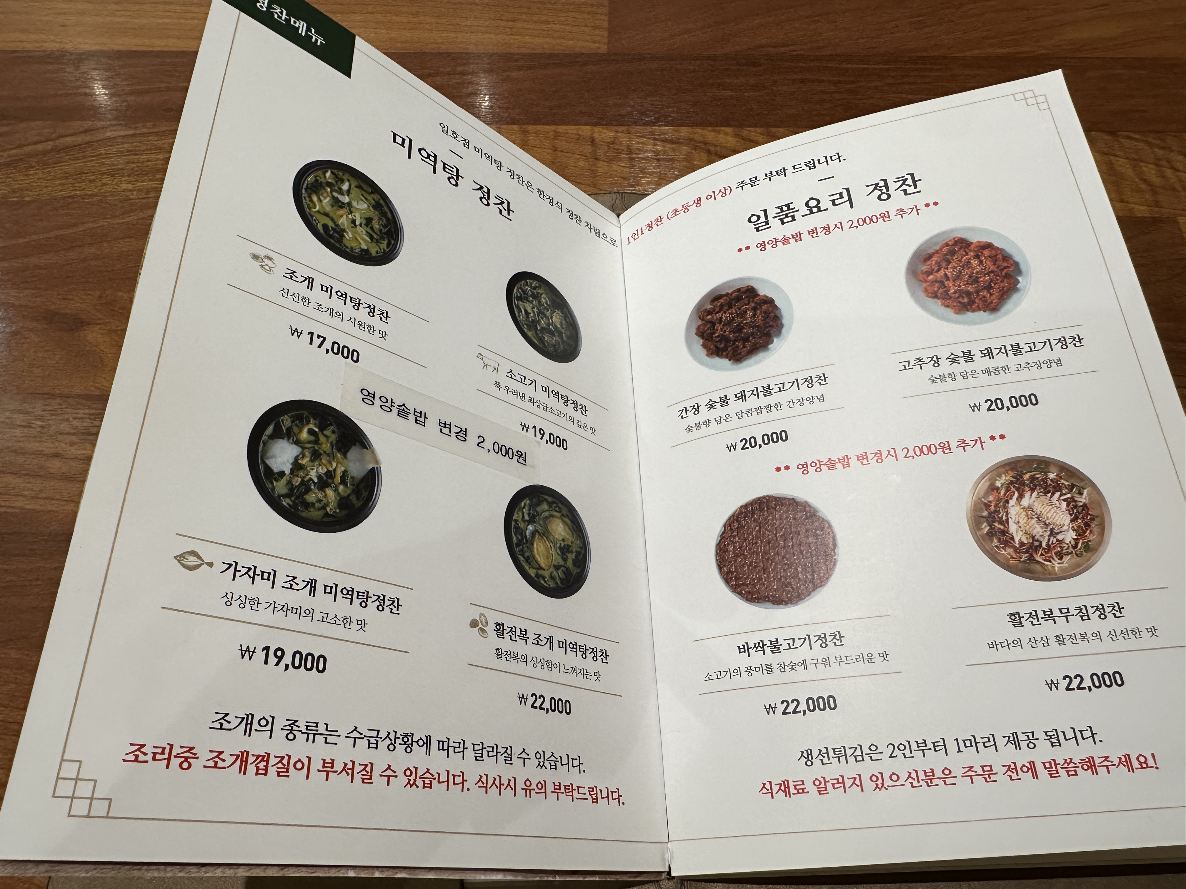조개 미역탕정찬, 소고기 미역탕정찬, 가자미 조개 미역탕정찬, 활전복 조개 미역탕 정찬.