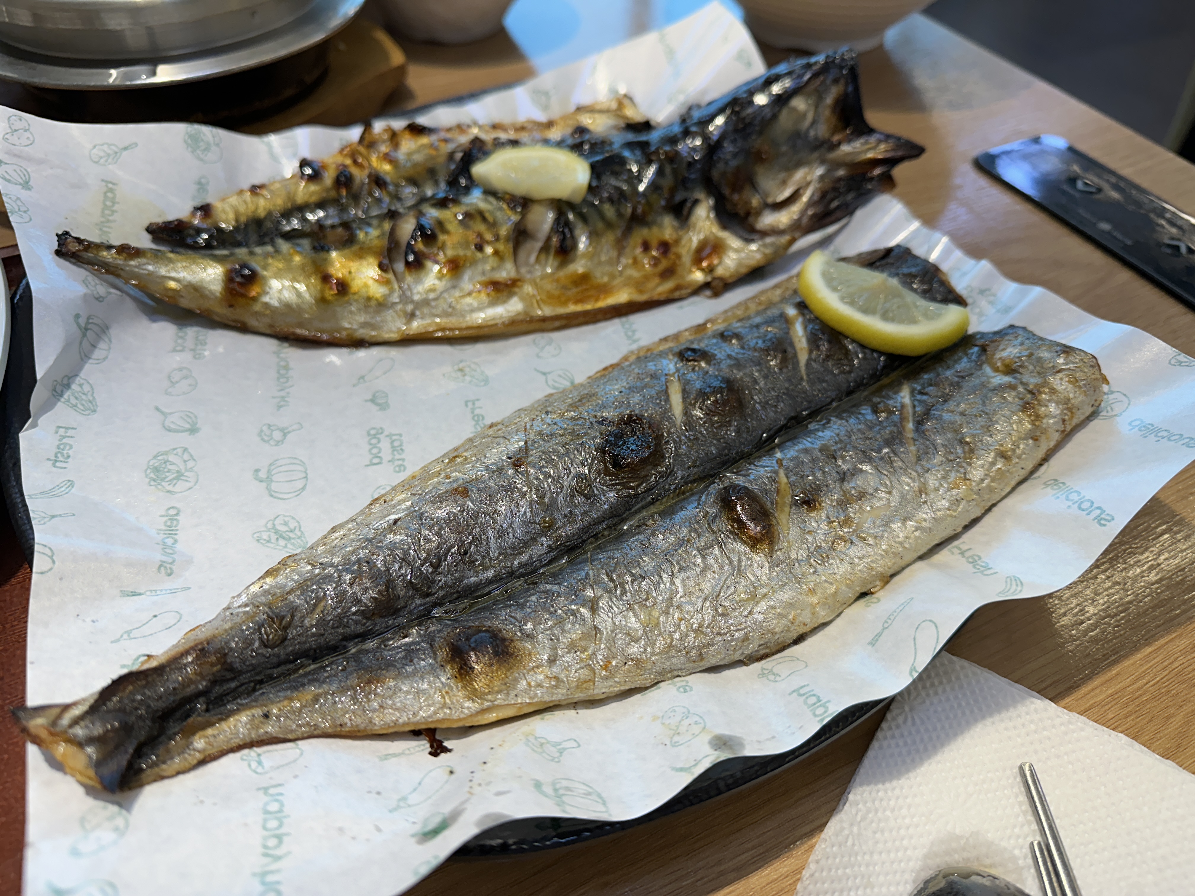 생선은 바로 화덕에서 구워서인지 나오기까지 주문 후 10분 정도 걸렸다. 꽤 토실토실하고 긴 고등어와 삼치구이가 나왔다. 생선 위에는 비린내 제거를 위한(?) 레몬 한 조각이 얹어져 있었다.