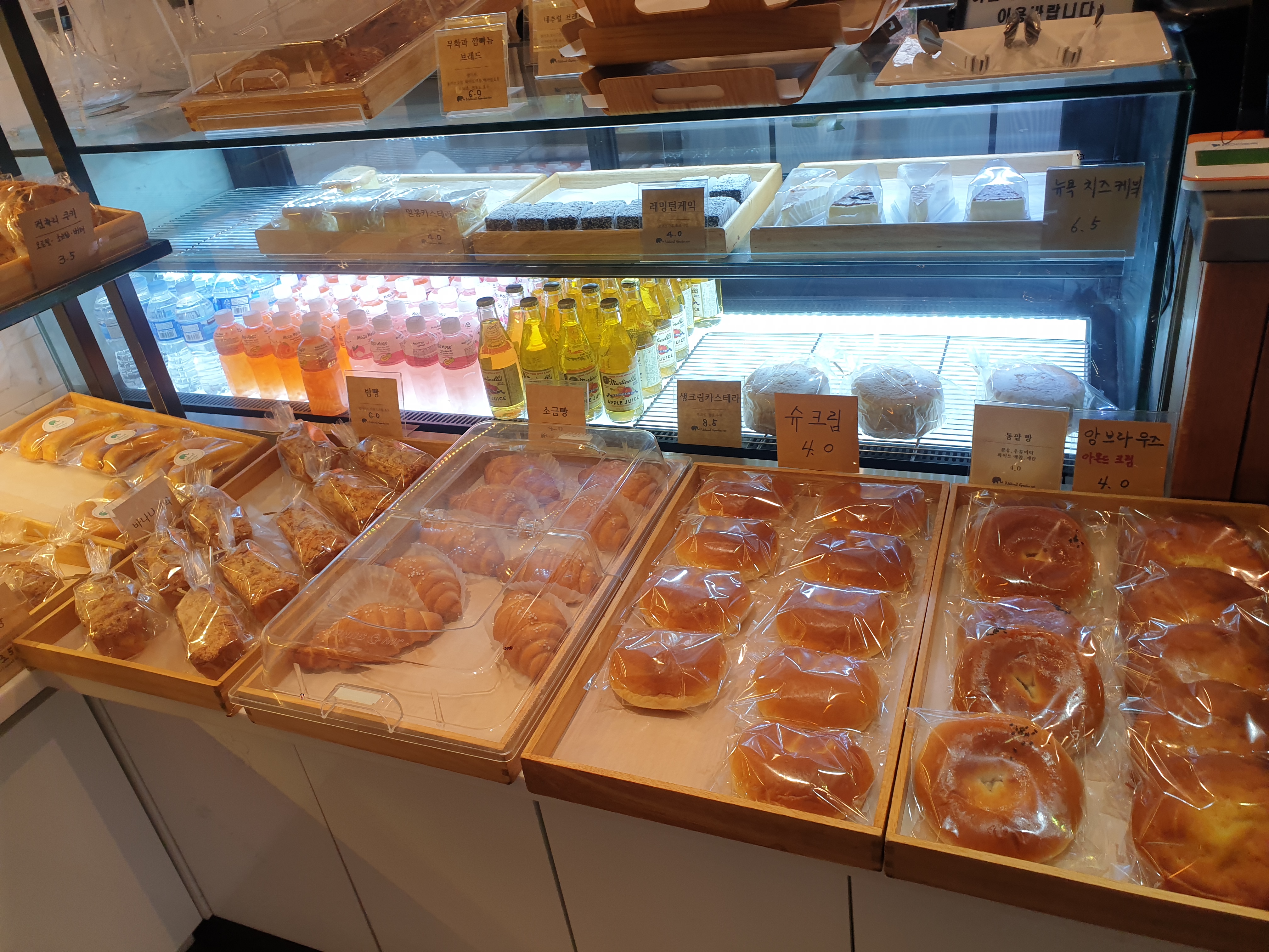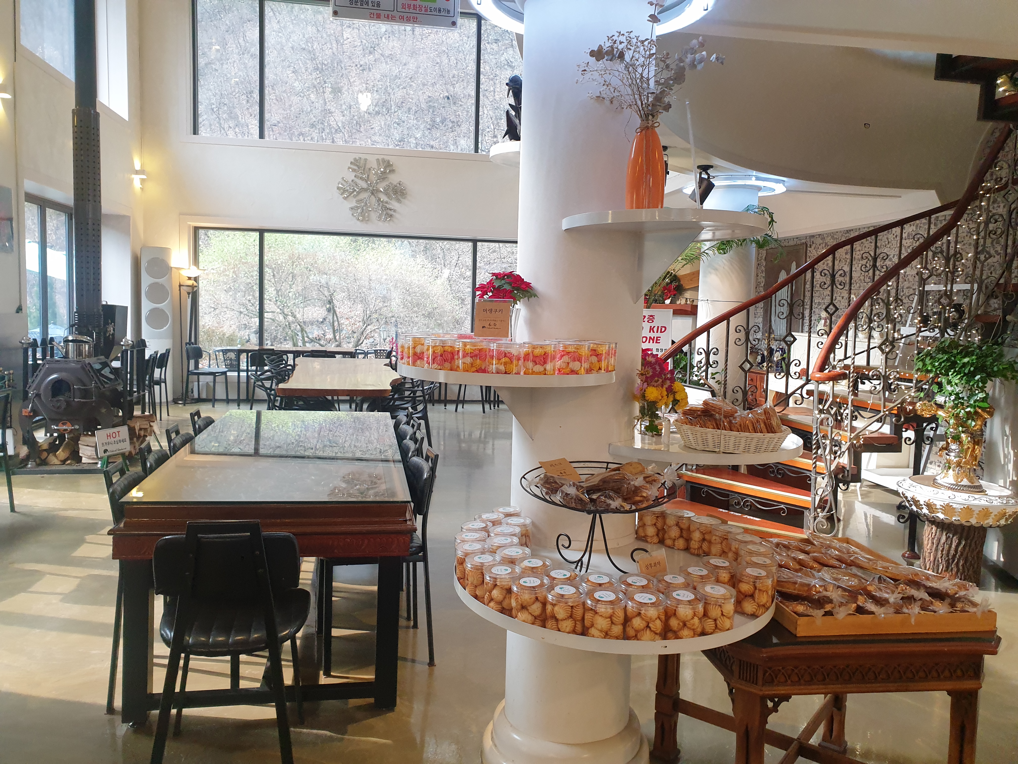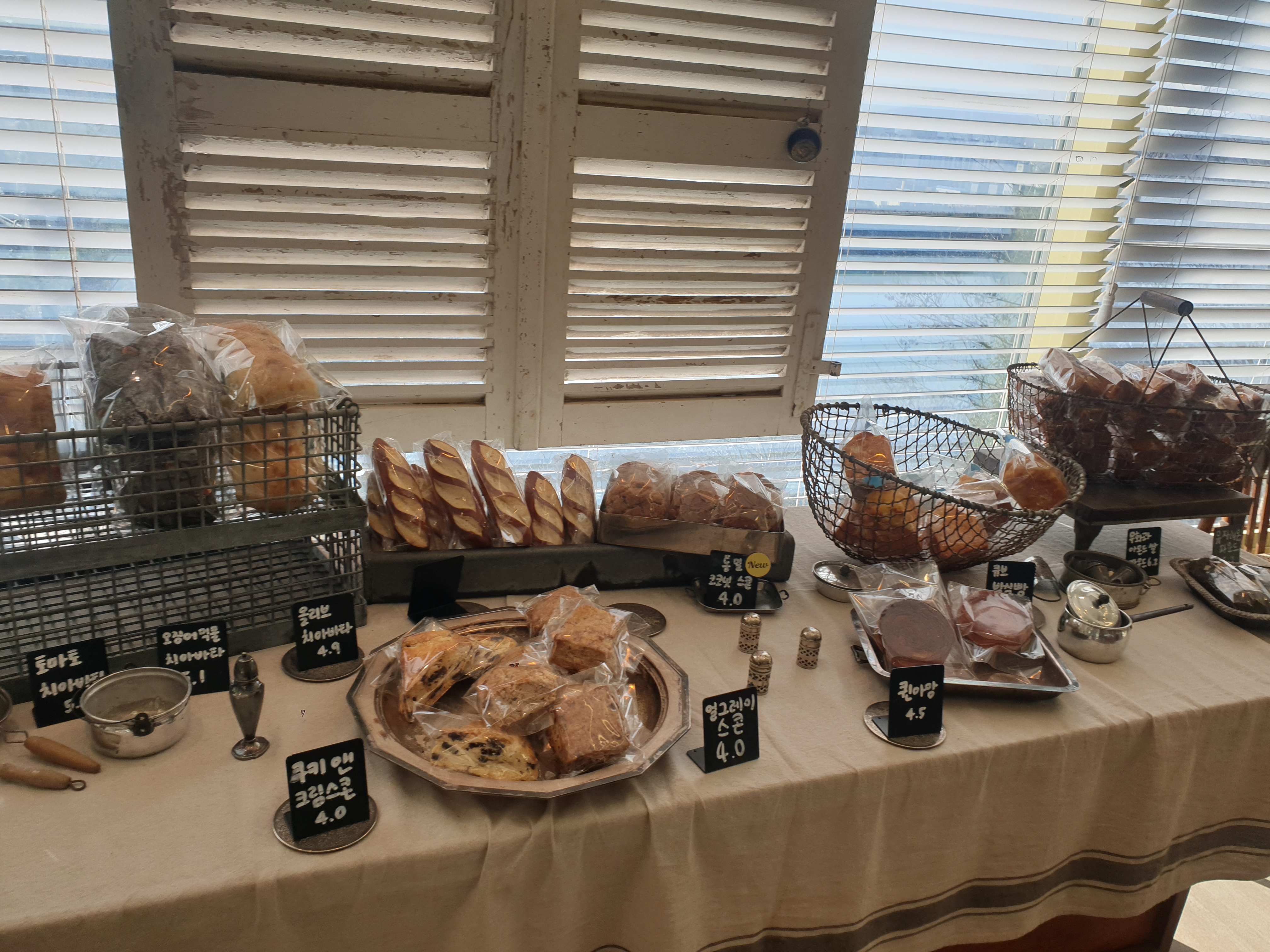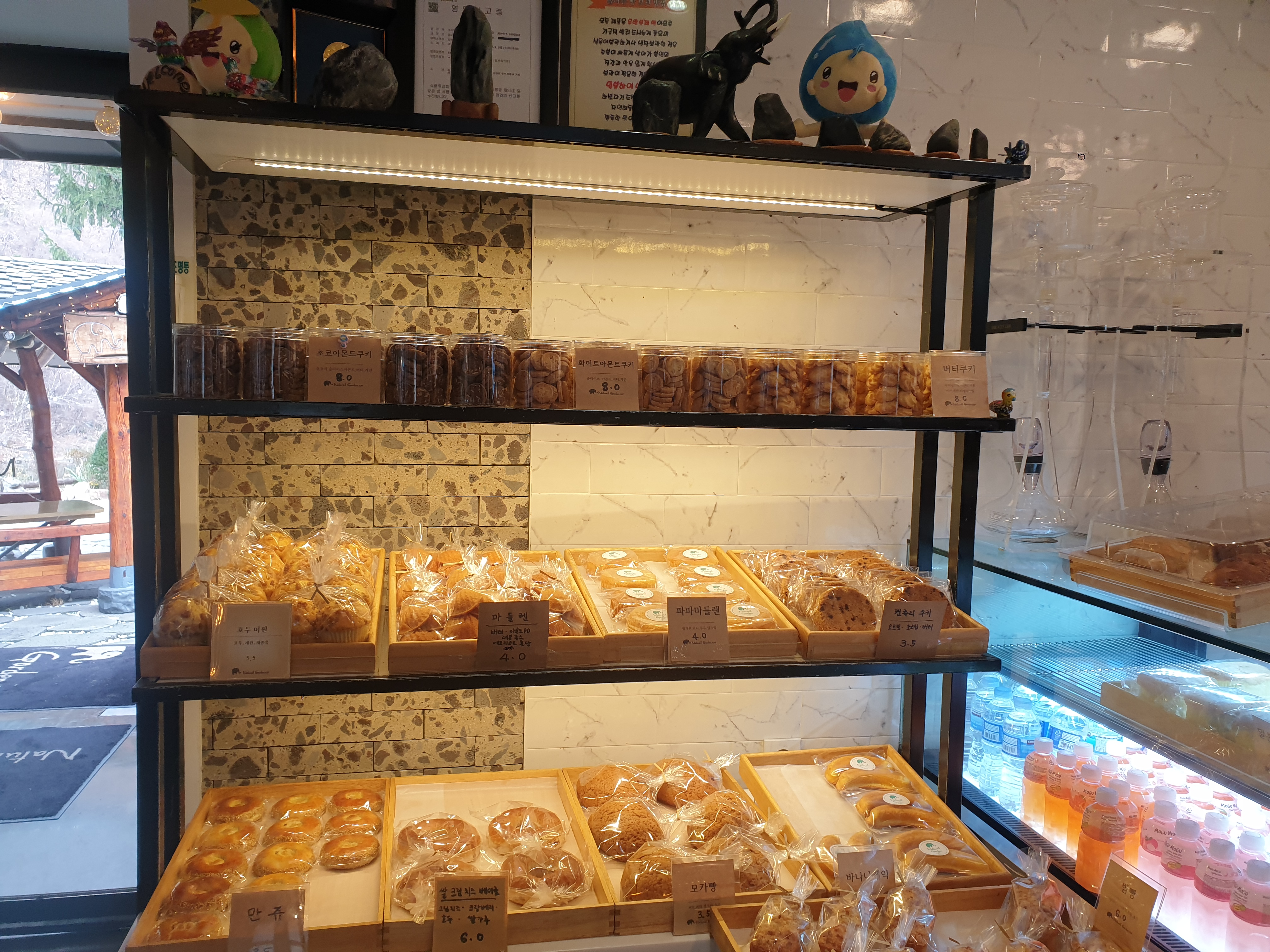 정원 내에 베이커리카페와 레스토랑이 있고 음료 교환은 베이커리카페에서 할 수 있습니다. 이곳 베이커리카페는 신라호텔 20년 근무 경력의 제과장이 빵을 만든다고 하는데요. 머랭쿠키와 카스텔라,, 슈크림 빵등 다양한 종류를 맛볼 수 있습니다. 정원에는 물멍 가능한 테이블과 의자가 곳곳에 배치되어 있고 파라솔과 누각도 설치되어 있습니다.