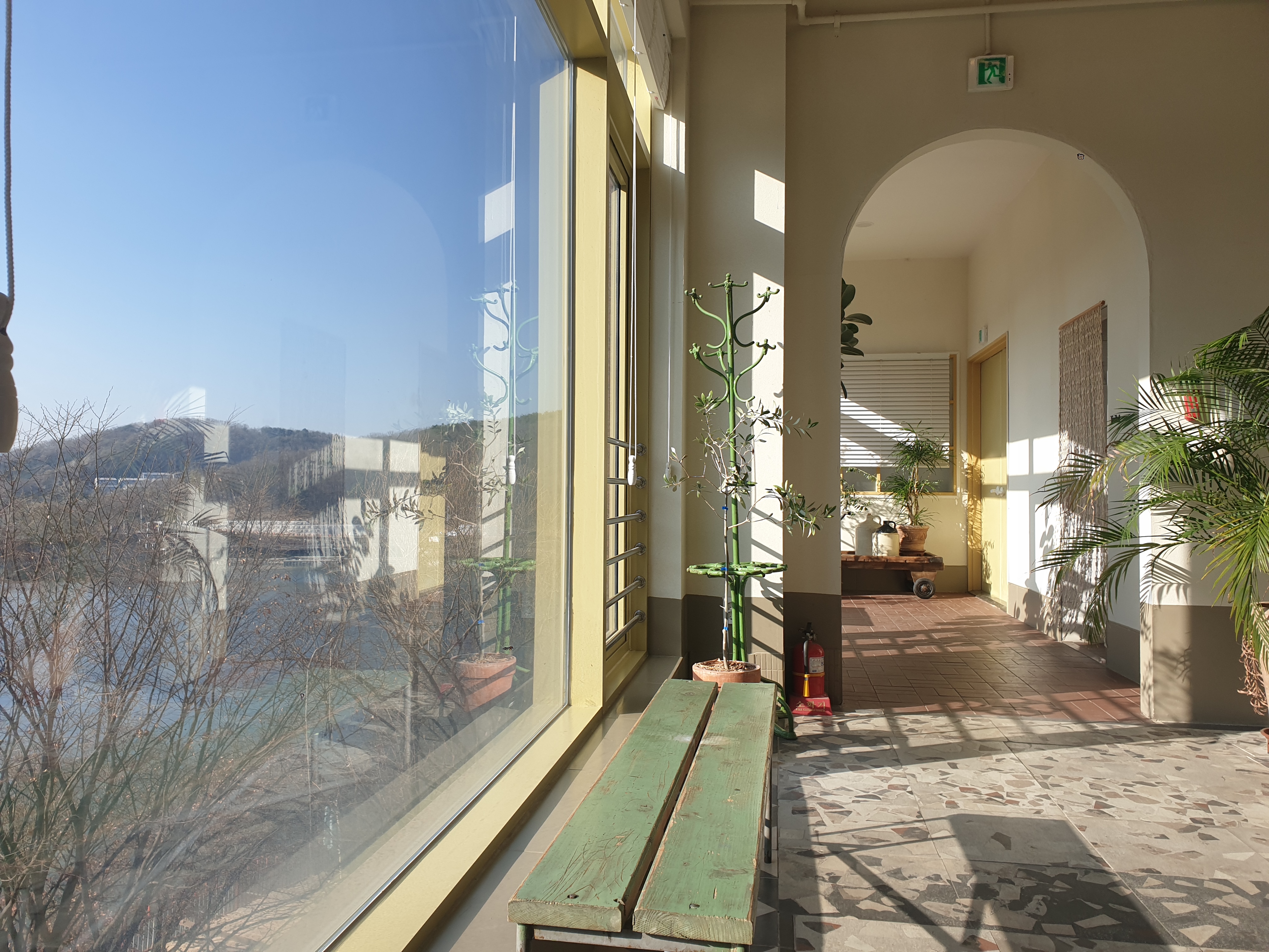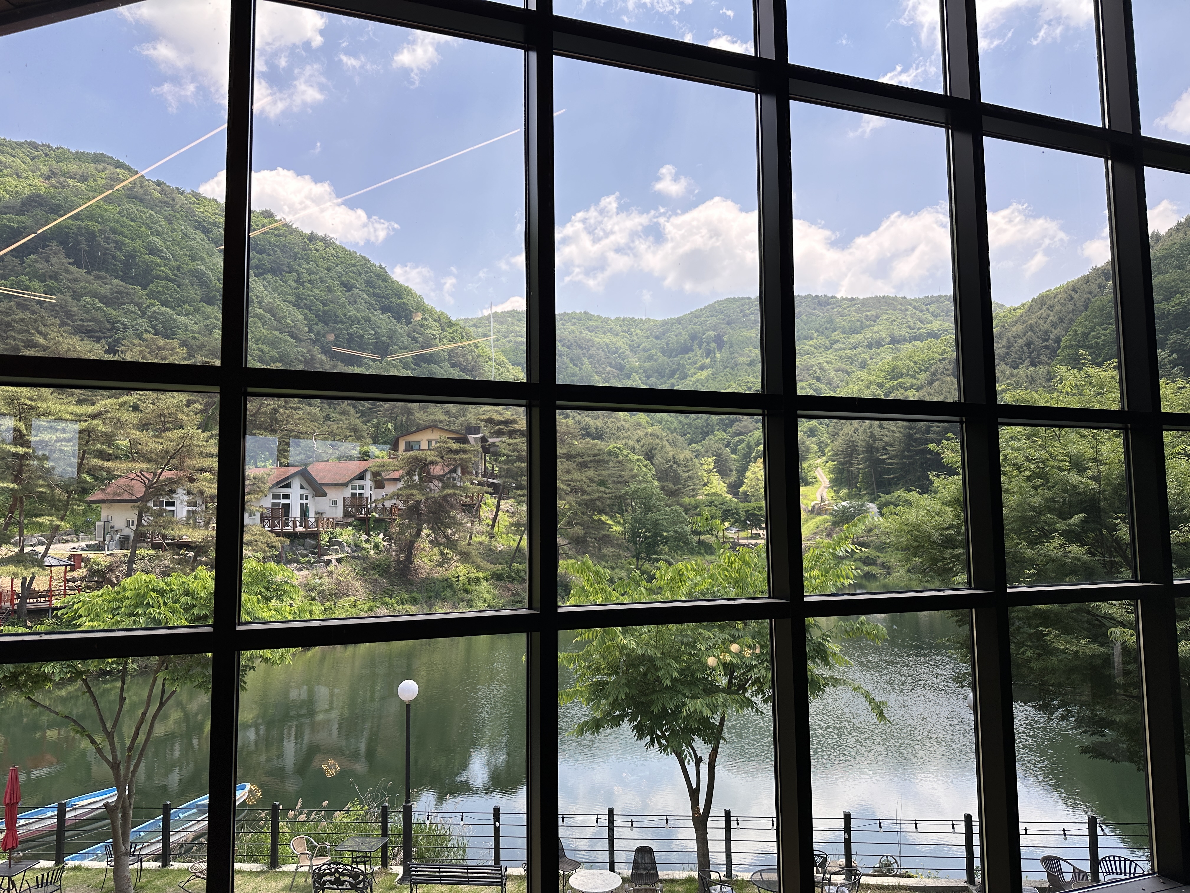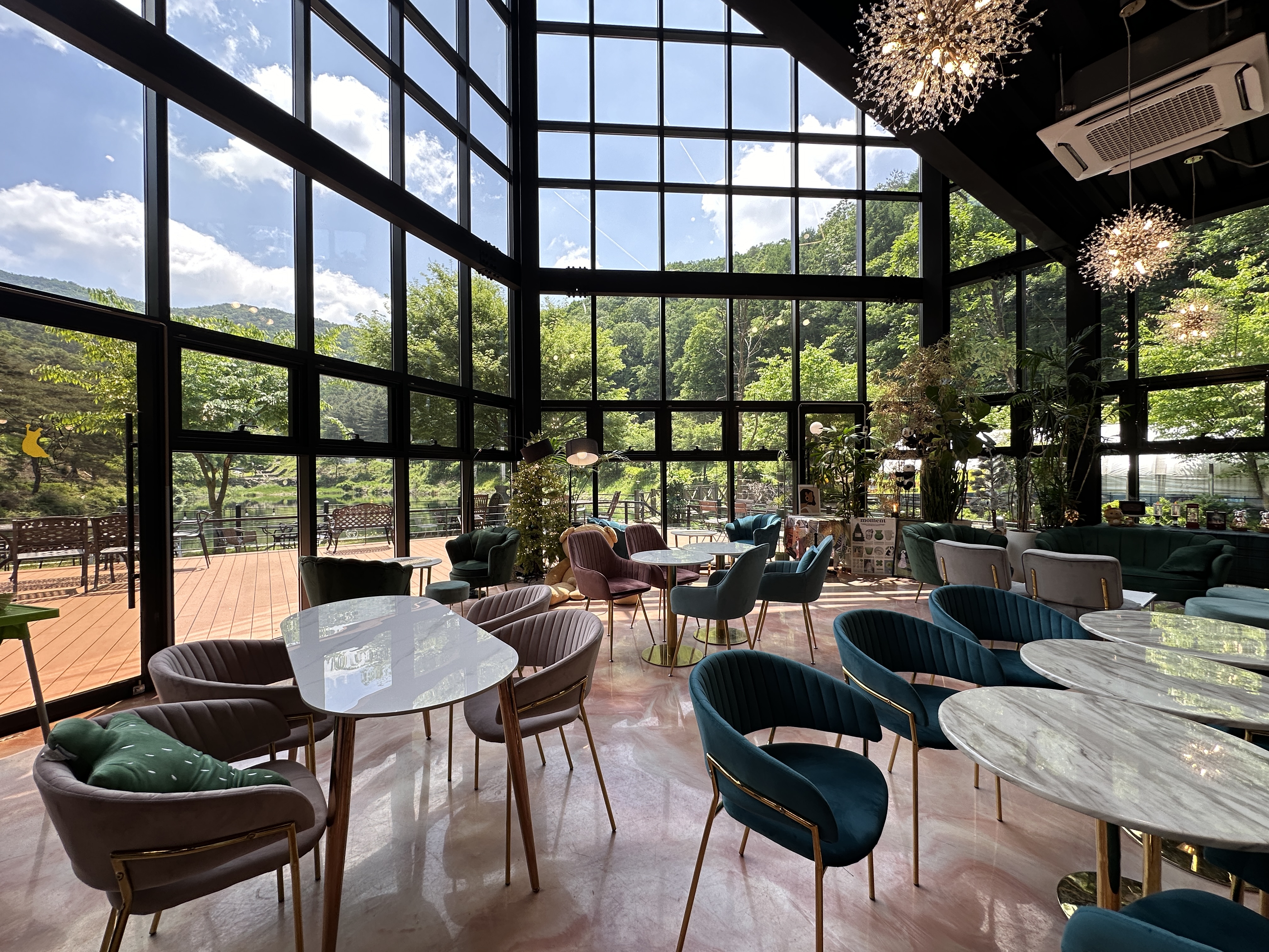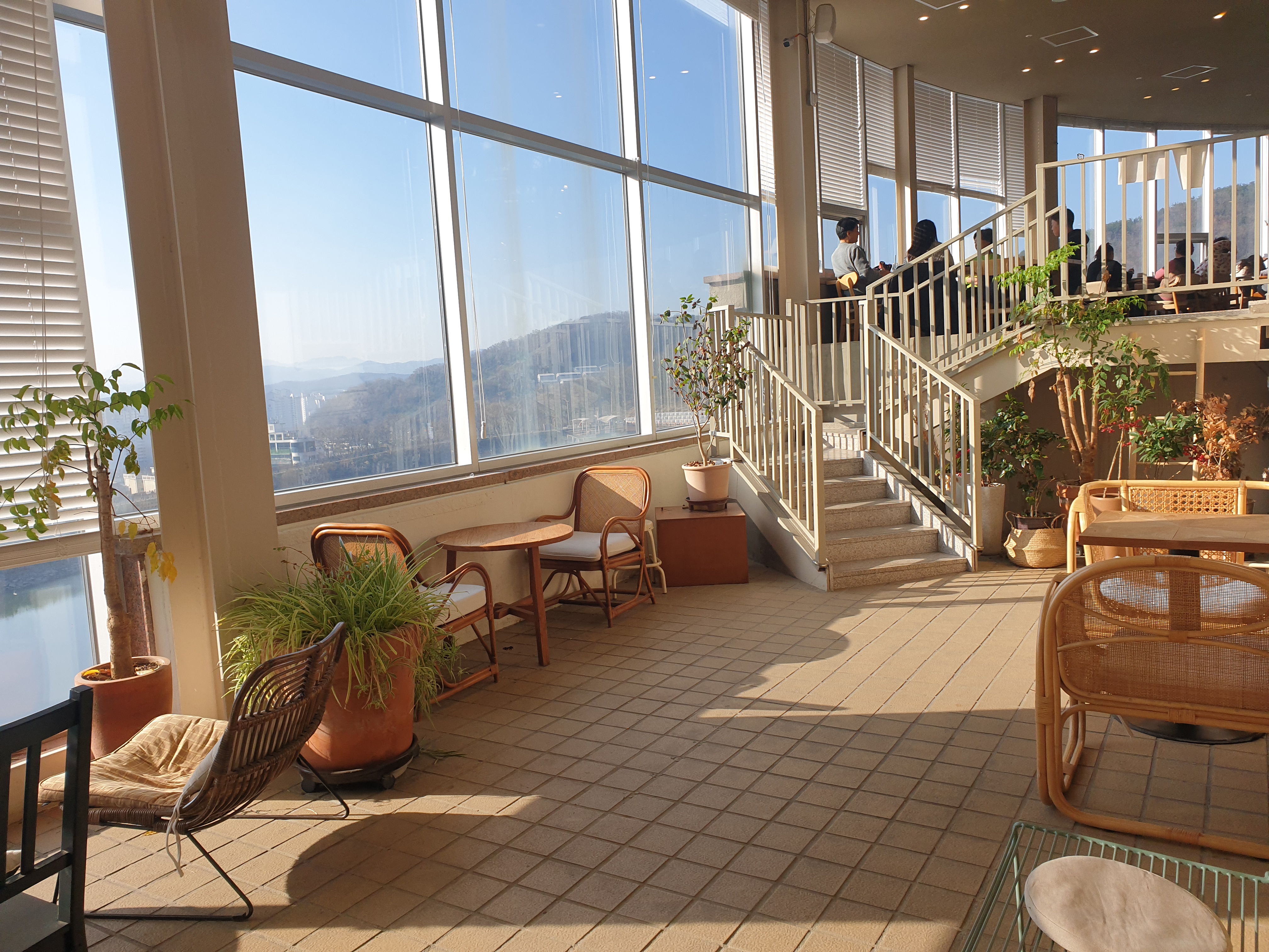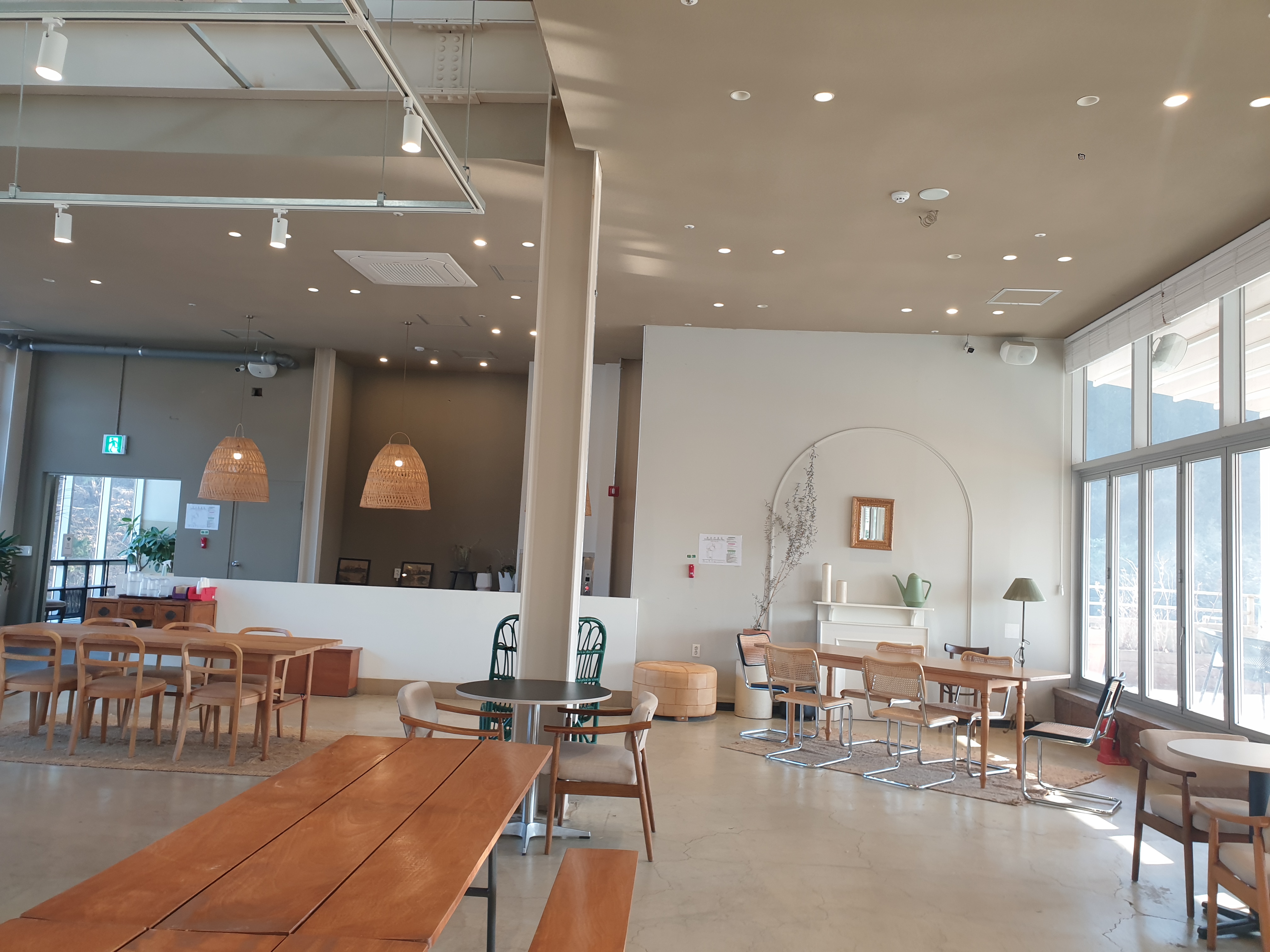 카페 실내에서 통창으로 저수지가 내려다보여 뷰가 좋으며 내부에 식물이 많아 실내정원 같은 느낌도 납니다. 따뜻한 햇살을 맞으며 시간을 보내기도 좋습니다.