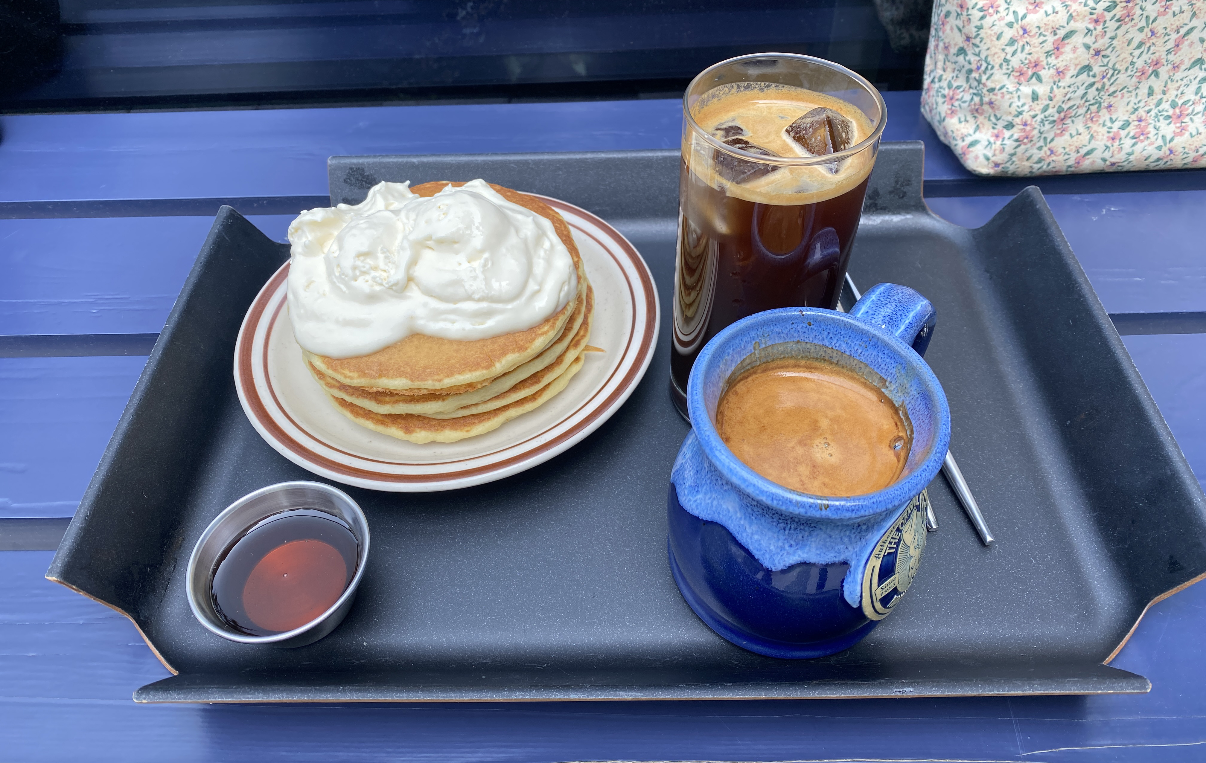 겹겹이 쌓인 팬케이크 위에 마스카포네치즈가 푸짐하게 올려져 나왔습니다. 팬케이크가 무려 6장이나 되더라고요.(밥대신 먹어도 될 양...) 팬케이크가 폭신폭신하고 같이 나온 메이플시럽은 달달해 폭신폭신 달달한 맛이었답니다.