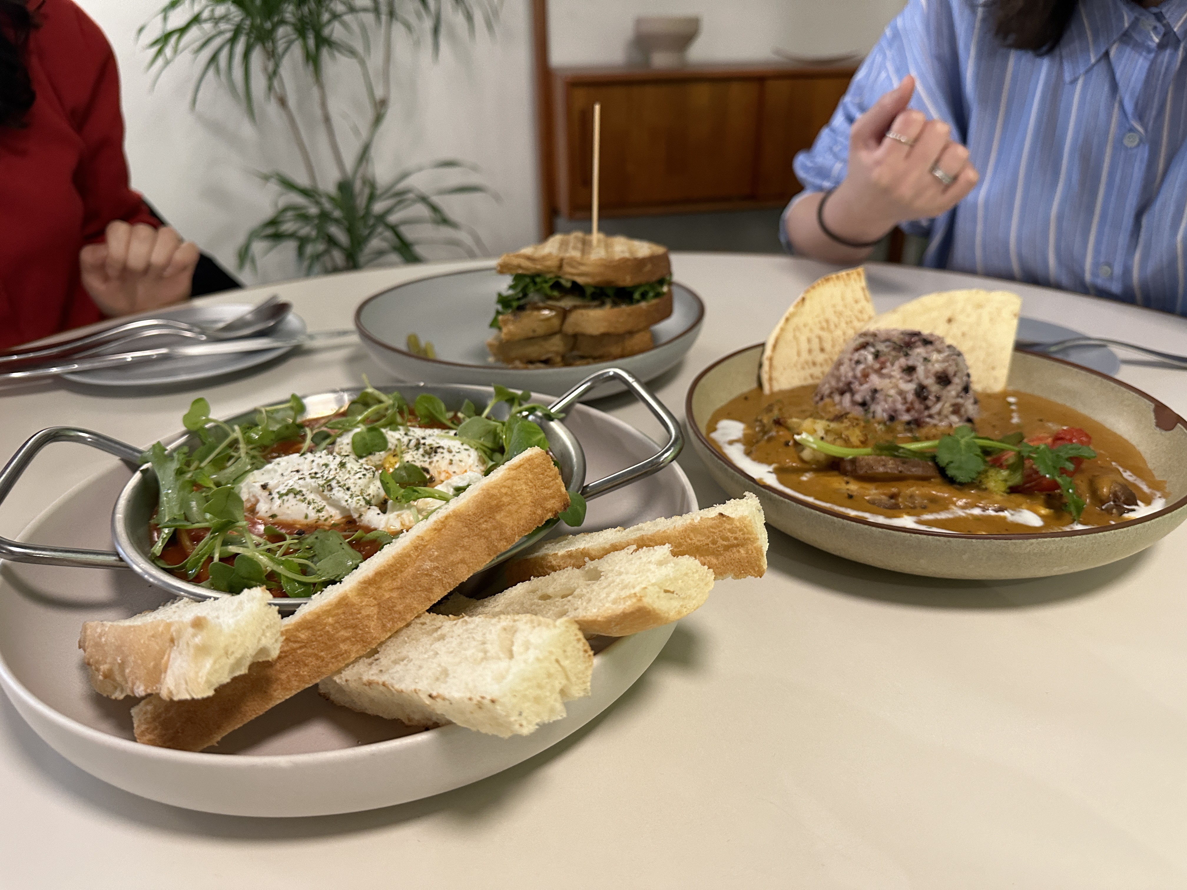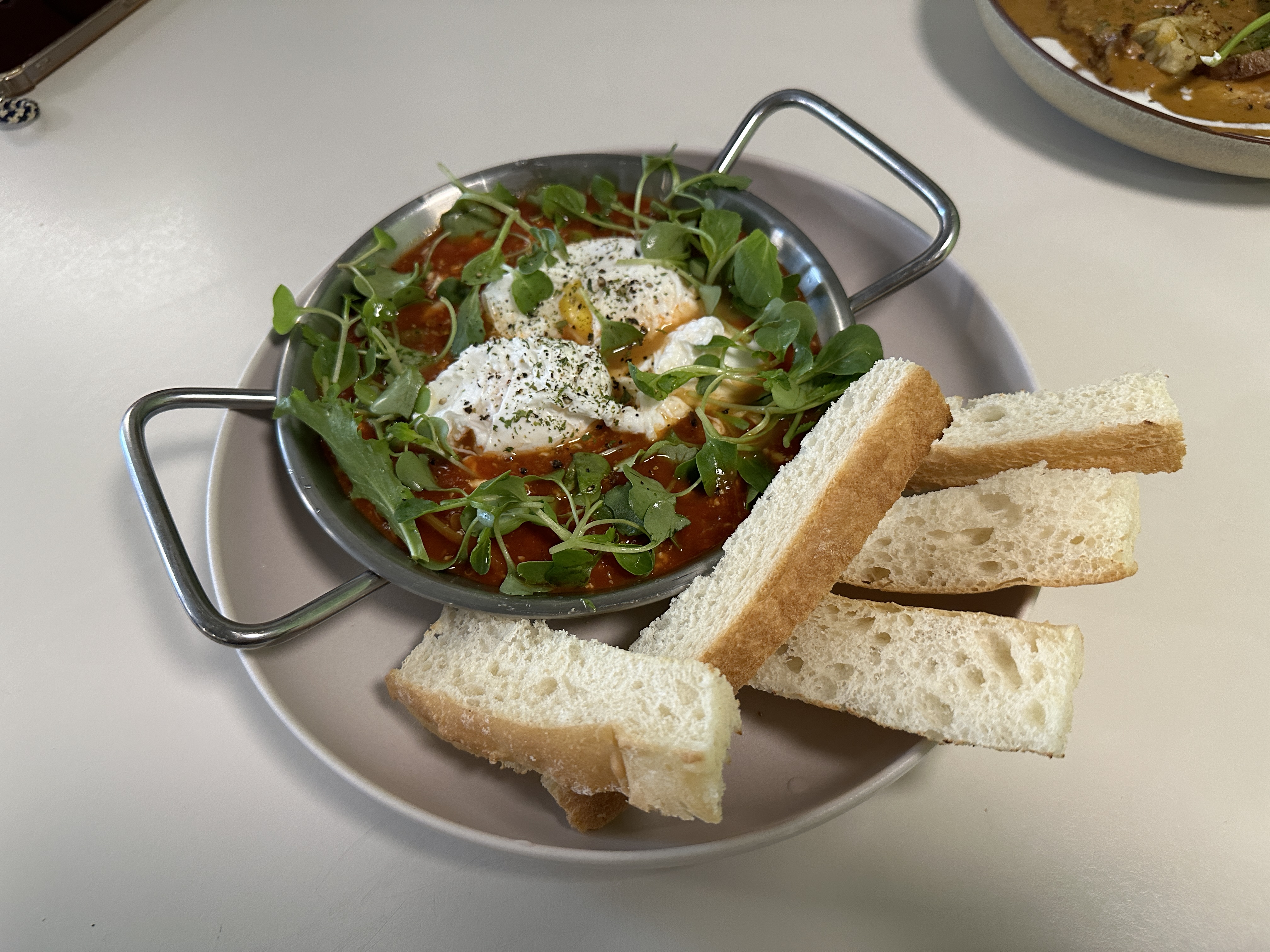 우리는 오른쪽 구역에 자리를 잡았다. 브런치메뉴로 샥슈카(빵 추가)와 버터치킨커리(밥 선택), 트러플머쉬룸치킨(샌드위치)을 주문했다. 수다를 떨다 보니 음식이 나왔다.