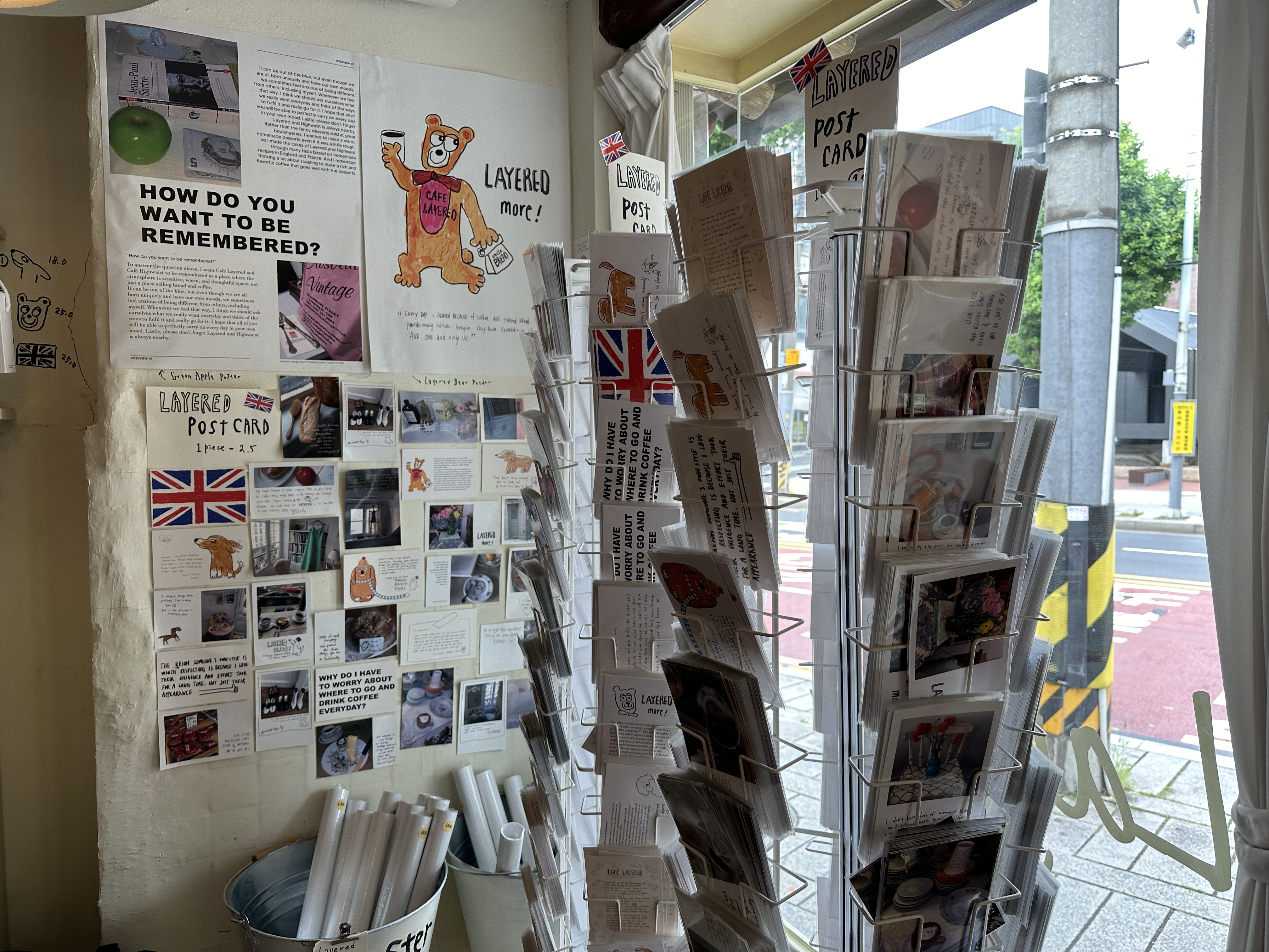 카페 레이어드 안국점은 고풍스러운 한옥 스타일의 외관과 모던한 인테리어가 조화를 이루는 공간이었습니다. 한옥을 현대적으로 세련되게 재해석한 느낌이었습니다. 내부 장식은 런던베이글뮤지엄의 소품들과 비슷했데요. 영국 느낌의 사진과 액자, 특유의 말그림이 그려진 에코백이 걸려있었습니다.