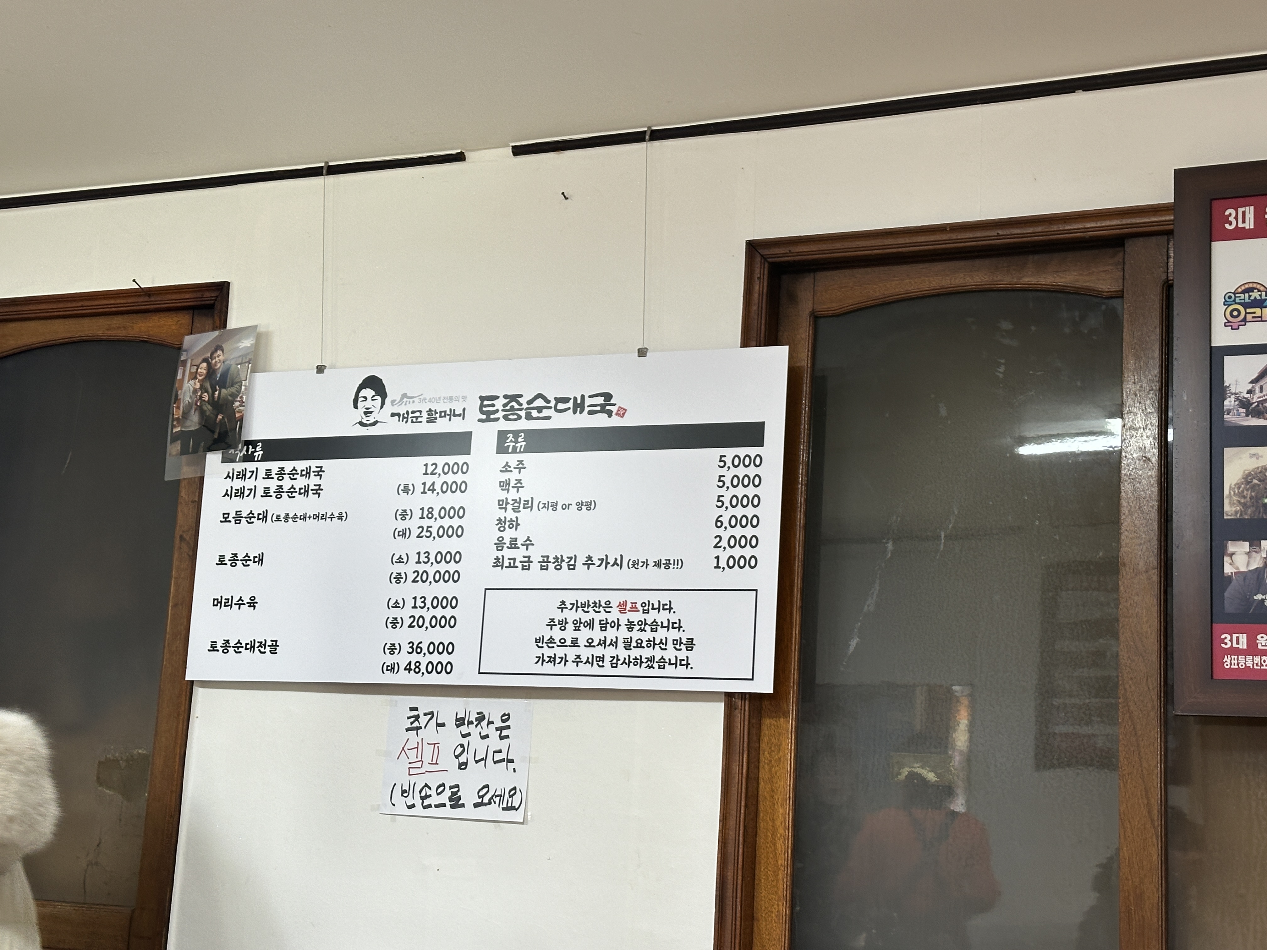 꼬박 1시간 30분을 기다려 11시 30에 순대국집에 입장했다. 이렇게까지 기다릴 일인가 싶었지만, 우리가 입장할 즈음 도착한 사람들은 대기 예상 시간이 3시간이었다. tip. 오전 9시 전에 도착해야 대기시간 1시간 미만으로 입장 가능할 것 같다.