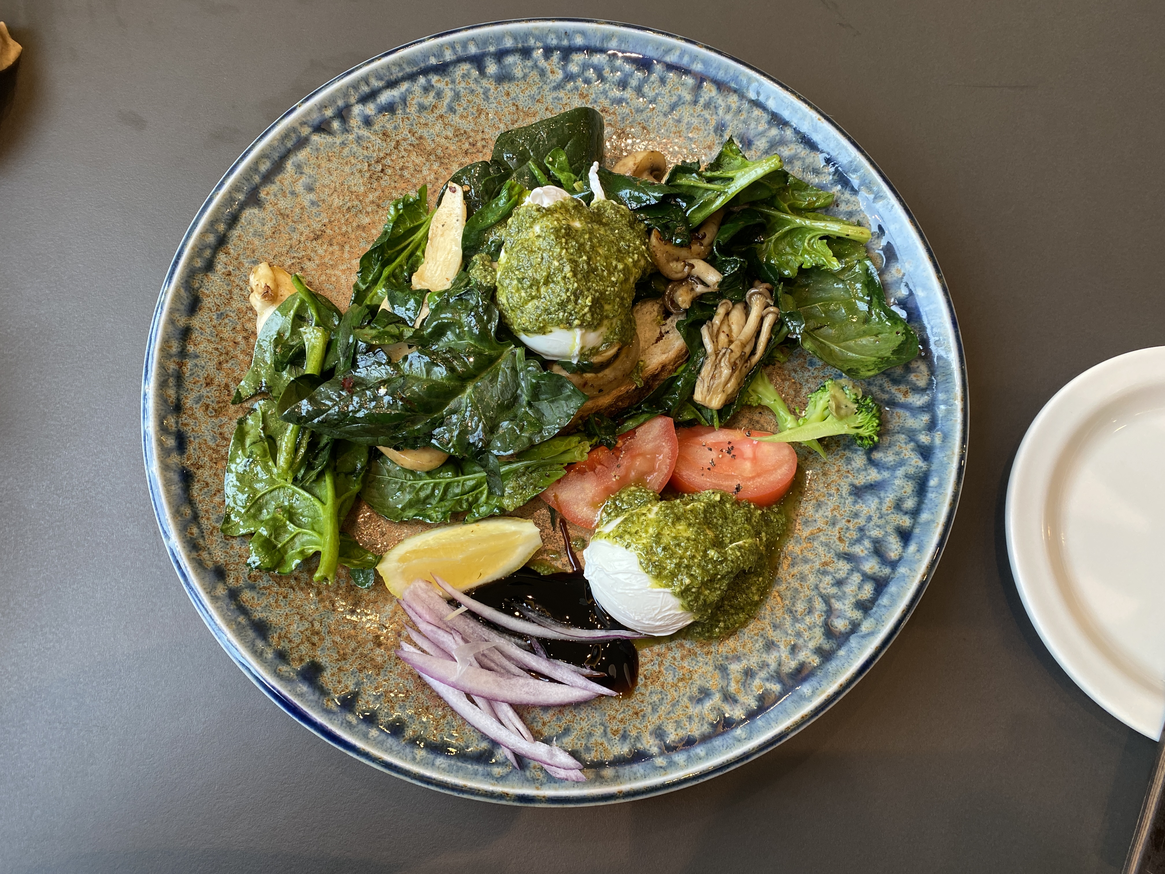저는 토스트된 곡물빵 위에 구운 버섯과 Mushrooms Basil Pesto Bread을 먹었습니다. 커다란 접시에 예쁘게 플레이팅 되어 나오니 기분도 좋더라고요.
