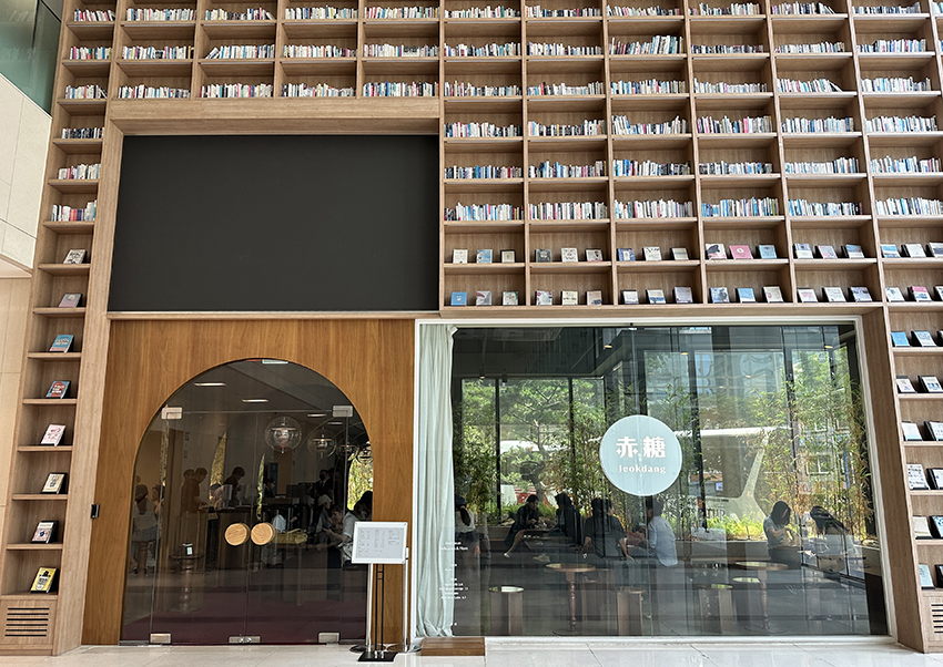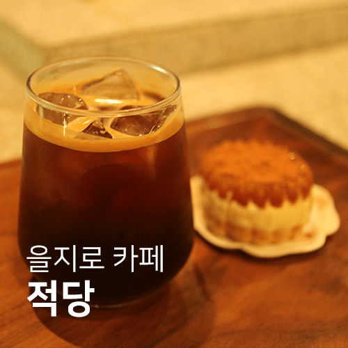 적당은 2호선 을지로입구역 1-1번 출구로 나가서 열 보쯤 걸으면 더존을지타워가 보여요! 더존을지타워의 후문 쪽 1층에 있습니다. 외부에 한자로 적당이라고 적혀있어요. 건물 안쪽으로 들어가면 오른쪽에 통유리와 우드, 엄청난 양의 책이 한쪽 벽면을 채우고 있어요. 이곳이 카페 적당입니다.