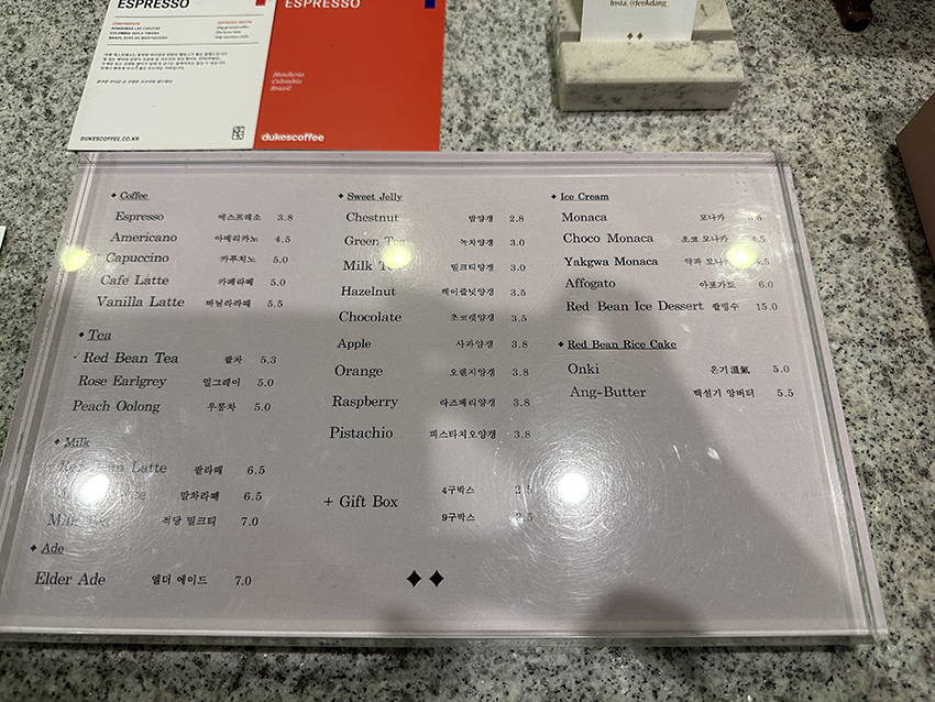 적당은 팥을 전문으로 하는 양갱카페로 유명했는데요. 저는 그보다 약과 모나카가 더 궁금했어요!! 그래서 약과 모나카와 그에 어울리는 아이스아메리카노를 주문했어요. 커피 외에 팥차, 얼그레이, 우롱차, 라떼 등 다양한 음료가 있고 양갱도 종류가 9가지 정도 되더라고요.