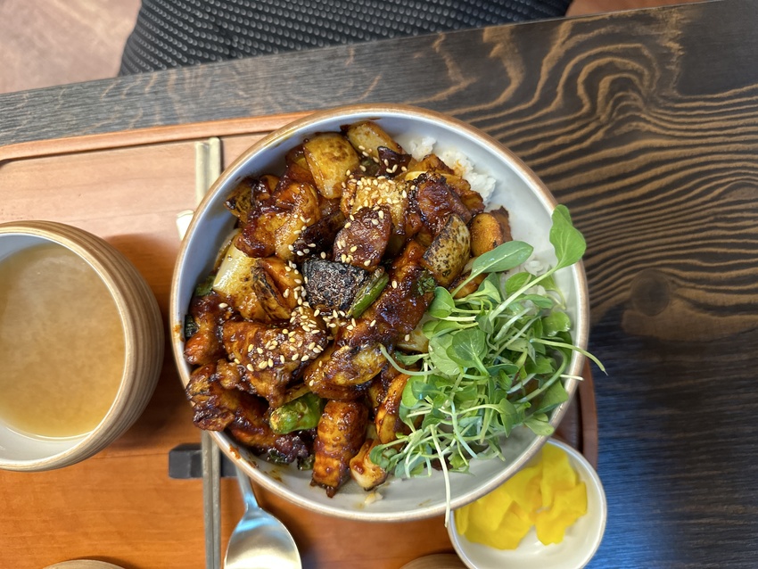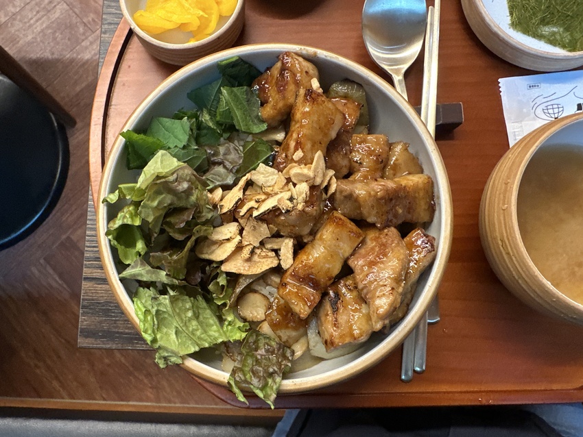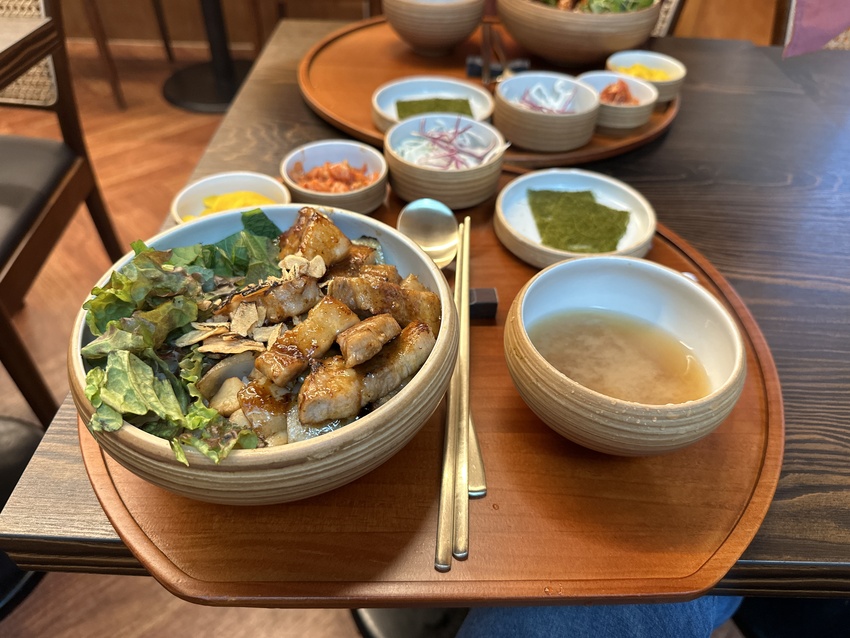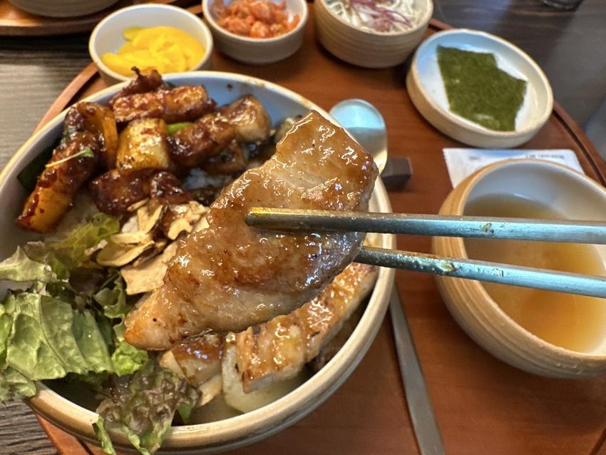 덮밥은 양념된 고기를 볶아서 채소와 함께 따뜻한 밥 위에 얹어 나옵니다. 매콤 통삼겹 덮밥(9,500원)과 짚된장 통삼겹 덮밥(9,500원)을 주문하였는데요. 매콤 통삼겹 덮밥은 빨간 양념으로 고추장 삼겹살 느낌이었고, 짚된장 통삼겹 덮밥은 된장 양념이 되어 구수한 맛이 났어요.