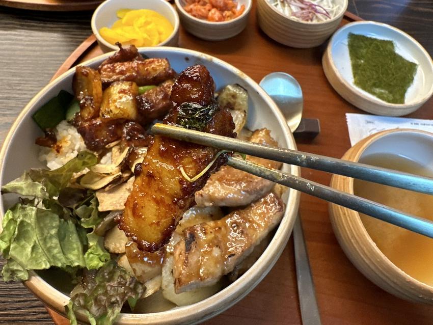 덮밥은 양념된 고기를 볶아서 채소와 함께 따뜻한 밥 위에 얹어 나옵니다. 매콤 통삼겹 덮밥(9,500원)과 짚된장 통삼겹 덮밥(9,500원)을 주문하였는데요. 매콤 통삼겹 덮밥은 빨간 양념으로 고추장 삼겹살 느낌이었고, 짚된장 통삼겹 덮밥은 된장 양념이 되어 구수한 맛이 났어요.